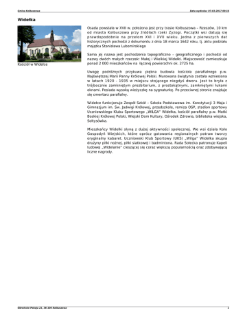 Gmina Kolbuszowa Data wydruku: 07-03-2017 00:16 Widełka Osada powstała w XVII w. położona jest przy trasie Kolbuszowa – Rzeszów, 10 km od miasta Kolbuszowa przy źródłach rzeki Zyzogi. Początki wsi datują się prawdopodobnie na przełom XVI i XVII wieku. Jedna z pierwszych dat historycznych pochodzi z dokumentu z dnia 18 marca 1642 roku, tj. aktu podziału majątku Stanisława Lubomirskiego Kościół w Widełce Sama jej nazwa jest pochodzenia topograficzno – geograficznego i pochodzi od nazwy dwóch małych rzeczek: Małej i Wielkiej Widełki. Miejscowość zamieszkuje ponad 2 000 mieszkańców na łącznej powierzchni ok. 2725 ha. Uwagę podróżnych przykuwa piękna budowla kościoła parafialnego p.w. Najświętszej Marii Panny Królowej Polski. Murowana świątynia została wzniesiona w latach 1920 - 1935 w miejscu stojącego niegdyś dworu. Jest to bryła z trójbocznie zamkniętym prezbiterium, z prostokątnymi, zamkniętymi łukami oknami. Posiada wysoką wieżyczkę na sygnaturkę. Po przeciwnej stronie znajduje się cmentarz parafialny. Widełce funkcjonuje Zespół Szkół – Szkoła Podstawowa im. Konstytucji 3 Maja i Gimnazjum im. Św. Jadwigi Królowej, przedszkole, remiza OSP, stadion sportowy Uczniowskiego Klubu Sportowego „WILGA” Widełka, kościół parafialny p.w. Matki Boskiej Królowej Polski, Wiejski Dom Kultury, Ośrodek Zdrowia, biblioteka wiejska, Sołtysówka. Mieszkańcy Widełki słyną z dużej aktywności społecznej. We wsi działa Koło Gospodyń Wiejskich, które oprócz gotowania regionalnych potraw tworzy oryginalny kabaret. Uczniowski Klub Sportowy (UKS) „Wilga” Widełka skupia drużyny piłki nożnej, piłki siatkowej i badmintona. Rada Sołecka patronuje Kapeli ludowej „Widelanie” cieszącej się coraz większą popularnością oraz zdobywającą liczne nagrody. Obrońców Pokoju 21, 36-100 Kolbuszowa 1