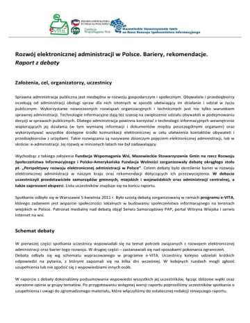 ZŽnjǁſũĞůĞŬƚƌŽŶŝĐnjŶĞũĂĚŵŝŶŝƐƚƌĂĐũŝǁWŽůƐĐĞ͘ĂƌŝĞƌLJ͕ƌĞŬŽŵĞŶĚĂĐũĞ͘ ZĂƉŽƌƚnjĚĞďĂƚLJ ĂųŽǏĞŶŝĂ͕ĐĞů͕ŽƌŐĂŶŝnjĂƚŽƌnjLJ͕ƵĐnjĞƐƚŶŝĐLJ ^ƉƌĂǁŶĂĂĚŵŝŶŝƐƚƌĂĐũĂƉƵďůŝĐnjŶĂũĞƐƚŶŝĞnjďħĚŶĂǁƌŽnjǁŽũƵŐŽƐƉŽĚĂƌĐnjLJŵŝƐƉŽųĞĐnjŶLJŵ͘KďLJǁĂƚĞůĞŝƉƌnjĞĚƐŝħďŝŽƌĐLJ ŽĐnjĞŬƵũČ ŽĚ ĂĚŵŝŶŝƐƚƌĂĐũŝ ŽďƐųƵŐŝ ƐƉƌĂǁ ĚůĂ ŶŝĐŚ ŝƐƚŽƚŶLJĐŚ ǁ ƐƉŽƐſď ƵųĂƚǁŝĂũČĐLJ ŝŵ ĚnjŝĂųĂŶŝĞ ŝ ƵĚnjŝĂų ǁ ǏLJĐŝƵ ƉƵďůŝĐnjŶLJŵ͘ tLJŬŽƌnjLJƐƚĂŶŝĞ ŶŽǁŽĐnjĞƐŶLJĐŚ ƌŽnjǁŝČnjĂŷ ŽƌŐĂŶŝnjĂĐLJũŶLJĐŚ ŝ ƚĞĐŚŶŝĐnjŶLJĐŚ ũĞƐƚ ŶŝĞ ƚLJůŬŽ ǁĂƌƵŶŬŝĞŵ ƐƉƌĂǁŶĞũĂĚŵŝŶŝƐƚƌĂĐũŝ͘dĞĐŚŶŽůŽŐŝĞŝŶĨŽƌŵĂĐLJũŶĞĚĂũČƚĞǏƐnjĂŶƐħŶĂnjǁŝħŬƐnjĞŶŝĞƵĚnjŝĂųƵŽďLJǁĂƚĞůŝǁƉŽĚĞũŵŽǁĂŶŝƵ ĚĞĐLJnjũŝǁƐƉƌĂǁĂĐŚƉƵďůŝĐnjŶLJĐŚ͘ůĂƚĞŐŽĂĚŵŝŶŝƐƚƌĂĐũĂƉŽǁŝŶŶĂŬŽƌnjLJƐƚĂđnjƚĞĐŚŶŽůŽŐŝŝŝŶĨŽƌŵĂĐLJũŶLJĐŚǁĞǁŶħƚƌnjŶŝĞ ǁƐƉŝĞƌĂũČĐLJĐŚ ũĞũ ĚnjŝĂųĂŶŝĂ ;ǁ ƚLJŵ ǁLJŵŝĂŶħ ŝŶĨŽƌŵĂĐũŝ ŝ ĚŽŬƵŵĞŶƚſǁ ŵŝħĚnjLJ ƉŽƐnjĐnjĞŐſůŶLJŵŝ ŽƌŐĂŶĂŵŝͿ ŽƌĂnj ǁLJŬŽƌnjLJƐƚLJǁĂđ ǁƐnjLJƐƚŬŝĞ ĚŽƐƚħƉŶĞ ƑƌŽĚŬŝ ŬŽŵƵŶŝŬĂĐũŝ ĞůĞŬƚƌŽŶŝĐnjŶĞũ ǁ ĐĞůƵ ƵųĂƚǁŝĞŶŝĂ ŬŽŶƚĂŬƚſǁ ŽďLJǁĂƚĞůŝ ŝ ƉƌnjĞĚƐŝħďŝŽƌĐſǁnjƵƌnjħĚĂŵŝ͘dĂŬŝĞƌŽnjǁŝČnjĂŶŝĂƐČŶĂnjLJǁĂŶĞnjďŝŽƌĐnjLJŵƉŽũħĐŝĞŵĞůĞŬƚƌŽŶŝĐnjŶĞũĂĚŵŝŶŝƐƚƌĂĐũŝ͕ůƵďǁ ƐŬƌſĐŝĞ͗ĞͲĂĚŵŝŶŝƐƚƌĂĐũŝ͘:ĞũƌŽnjǁſũǁŵŝŶŝŽŶLJĐŚůĂƚĂĐŚŶŝĞďLJųnjĂĚĂǁĂůĂũČĐLJ͘ tLJĐŚŽĚnjČĐnjƚĂŬŝĞŐŽnjĂųŽǏĞŶŝĂ&ƵŶĚĂĐũĂtƐƉŽŵĂŐĂŶŝĂtƐŝ͕DĂnjŽǁŝĞĐŬŝĞ^ƚŽǁĂƌnjLJƐnjĞŶŝĞ'ŵŝŶŶĂƌnjĞĐnjZŽnjǁŽũƵ ^ƉŽųĞĐnjĞŷƐƚǁĂ /ŶĨŽƌŵĂĐLJũŶĞŐŽ ŝ WŽůƐŬŽͲŵĞƌLJŬĂŷƐŬĂ &ƵŶĚĂĐũĂ tŽůŶŽƑĐŝ njŽƌŐĂŶŝnjŽǁĂųLJ ĚĞďĂƚħ ŽŬƌČŐųĞŐŽ ƐƚŽųƵ Ɖƚͣ͘WĞƌƐƉĞŬƚLJǁLJƌŽnjǁŽũƵĞůĞŬƚƌŽŶŝĐnjŶĞũĂĚŵŝŶŝƐƚƌĂĐũŝǁ WŽůƐĐĞ͘͟ ĞůĞŵĚĞďĂƚLJďLJųŽŽŬƌĞƑůĞŶŝĞďĂƌŝĞƌǁƌŽnjǁŽũƵ ĞůĞŬƚƌŽŶŝĐnjŶĞũ ĂĚŵŝŶŝƐƚƌĂĐũŝ ǁ ŶĂƐnjLJŵ ŬƌĂũƵ ŽƌĂnj ƌĞŬŽŵĞŶĚĂĐũŝ ĚŽƚLJĐnjČĐLJĐŚ ŝĐŚ ƉƌnjĞnjǁLJĐŝħǏĞŶŝĂ͘ t ĚĞďĂĐŝĞ ƵĐnjĞƐƚŶŝĐnjLJůŝ ƉƌnjĞĚƐƚĂǁŝĐŝĞůĞ ƐĂŵŽƌnjČĚſǁ ŐŵŝŶŶLJĐŚ͕ ŵŝĞũƐŬŝĐŚ ŝ ǁŽũĞǁſĚnjŬŝĐŚ ŽƌĂnj ĂĚŵŝŶŝƐƚƌĂĐũŝ ĐĞŶƚƌĂůŶĞũ͕ Ă ƚĂŬǏĞnjĂƉƌŽƐnjĞŶŝĞŬƐƉĞƌĐŝ͘>ŝƐƚĂƵĐnjĞƐƚŶŝŬſǁnjŶĂũĚƵũĞƐŝħŶĂŬŽŷĐƵƌĂƉŽƌƚƵ͘ ^ƉŽƚŬĂŶŝĞŽĚďLJųŽƐŝħǁtĂƌƐnjĂǁŝĞϱŬǁŝĞƚŶŝĂϮϬϭϭƌ͘LJųŽƐnjſƐƚČĚĞďĂƚČnjŽƌŐĂŶŝnjŽǁĂŶČǁƌĂŵĂĐŚƉƌŽŐƌĂŵƵĞͲs/d͕ ŬƚſƌĞŐŽ njĂĚĂŶŝĞŵ ũĞƐƚ ǁƐƉĂƌĐŝĞ ƐƉŽųĞĐnjŶŽƑĐŝ ůŽŬĂůŶLJĐŚ ǁ ďƵĚŽǁĂŶŝƵ ƐƉŽųĞĐnjĞŷƐƚǁĂ ŝŶĨŽƌŵĂĐLJũŶĞŐŽ ŶĂ ƚĞƌĞŶĂĐŚ ǁŝĞũƐŬŝĐŚǁWŽůƐĐĞ͘WĂƚƌŽŶĂƚŵĞĚŝĂůŶLJŶĂĚĚĞďĂƚČŽďũČų^ĞƌǁŝƐ^ĂŵŽƌnjČĚŽǁLJWW͕ƉŽƌƚĂůtŝƚƌLJŶĂtŝĞũƐŬĂŝƐĞƌǁŝƐ /ŶƚĞƌŶĞƚŶĂǁƐŝ͘ ^ĐŚĞŵĂƚĚĞďĂƚLJ t ƉŝĞƌǁƐnjĞũ ĐnjħƑĐŝ ƐƉŽƚŬĂŶŝĂ ƵĐnjĞƐƚŶŝĐLJ ǁLJƉŽǁŝĂĚĂůŝ Ɛŝħ ŶĂ ƚĞŵĂƚ ƉŽƚƌnjĞď njǁŝČnjĂŶLJĐŚ nj ƌŽnjǁŽũĞŵ ĞůĞŬƚƌŽŶŝĐnjŶĞũ ĂĚŵŝŶŝƐƚƌĂĐũŝŽƌĂnjďĂƌŝĞƌƚĞŐŽƌŽnjǁŽũƵ͘tĚƌƵŐŝĞũĐnjħƑĐŝʹnjĂƐƚĂŶĂǁŝĂůŝƐŝħŶĂĚƐƉŽƐŽďĂŵŝƉŽŬŽŶĂŶŝĂŽŐƌĂŶŝĐnjĞŷ͘ ĞďĂƚĂ ŽĚďLJųĂ Ɛŝħ ǁŐ ƐĐŚĞŵĂƚƵ ǁLJƉƌĂĐŽǁĂŶĞŐŽ ǁ ƉƌŽŐƌĂŵŝĞ ĞͲs/d͘ hĐnjĞƐƚŶŝĐLJ ŬŽůĞũŶŽ ƵĚnjŝĞůĂůŝ ŬƌſƚŬŝĐŚ ŽĚƉŽǁŝĞĚnjŝ ŶĂ ƉLJƚĂŶŝĂ͕ nj ŬƚſƌLJŵŝ njĂƉŽnjŶĂůŝ Ɛŝħ ŶĂ ŬŝůŬĂ ĚŶŝ ǁĐnjĞƑŶŝĞũ͘ t ŬŽůĞũŶLJĐŚ ƌƵŶĚĂĐŚ ŵŽŐůŝ njŐųŽƐŝđ ƵnjƵƉĞųŶŝĞŶŝĂůƵďŶŝĞnjŐŽĚnjŝđƐŝħnjǁLJƉŽǁŝĞĚnjŝĂŵŝŝŶŶLJĐŚŽƐſď͘ tƌĂƉŽƌĐŝĞnjĚĞďĂƚLJĚŽŬŽŶĂůŝƑŵLJƉŽĚƐƵŵŽǁĂŶŝĂǁLJƉŽǁŝĞĚnjŝǁƐnjLJƐƚŬŝĐŚũĞũƵĐnjĞƐƚŶŝŬſǁ͕ųČĐnjČĐnjďůŝǏŽŶĞǁČƚŬŝŽƌĂnj ǁLJƌĂǏŽŶĞŽƉŝŶŝĞǁŐƌƵƉLJƚĞŵĂƚſǁ͘WŽƉƌnjLJŐŽƚŽǁĂŶŝƵǁƐƚħƉŶĞũǁĞƌƐũŝƌĂƉŽƌƚƵƉŽƉƌŽƐŝůŝƑŵLJƵĐnjĞƐƚŶŝŬſǁƐƉŽƚŬĂŶŝĂŽ ƵnjƵƉĞųŶŝĞŶŝĂŝƵǁĂŐŝĚŽnjŐƌŽŵĂĚnjŽŶĞŐŽŵĂƚĞƌŝĂųƵ͕ŬƚſƌĞǁųČĐnjLJůŝƑŵLJĚŽŽƐƚĂƚĞĐnjŶĞũƌĞĚĂŬĐũŝŶŝŶŝĞũƐnjĞŐŽƌĂƉŽƌƚƵ͘ ^ƚƌĞƐnjĐnjĞŶŝĞƌĞnjƵůƚĂƚſǁĚĞďĂƚLJ ĞĨŝŶŝƵũČĐ ďĂƌŝĞƌLJ ƵĐnjĞƐƚŶŝĐLJ ĚĞďĂƚLJ ŶĂũǁŝħĐĞũ ƵǁĂŐŝ ƉŽƑǁŝħĐŝůŝ ƐĨĞƌnjĞ ƑǁŝĂĚŽŵŽƑĐŝ ŝ ĞĚƵŬĂĐũŝ͘ /ĐŚ njĚĂŶŝĞŵ ŶĂũƐŝůŶŝĞũƐnjČďĂƌŝĞƌČnjĂƐƚŽƐŽǁĂŶŝĂƌŽnjǁŝČnjĂŷĞͲĂĚŵŝŶŝƐƚƌĂĐũŝũĞƐƚďƌĂŬƵŵŝĞũħƚŶŽƑĐŝ͕ŶŝĞǁLJƐƚĂƌĐnjĂũČĐLJƉŽnjŝŽŵǁŝĞĚnjLJ ŽƌĂnj ƑǁŝĂĚŽŵŽƑĐŝ ƐƉŽųĞĐnjŶĞũ ʹ ǁŝĚŽĐnjŶLJ njĂƌſǁŶŽ ƉŽ ƐƚƌŽŶŝĞ ƵƌnjħĚŶŝŬſǁ͕ ũĂŬ ŝ ŽďLJǁĂƚĞůŝ ŝ ƉƌnjĞĚƐŝħďŝŽƌĐſǁ͕ ũĂŬŽ ŽĚďŝŽƌĐſǁƵƐųƵŐĂĚŵŝŶŝƐƚƌĂĐũŝƉƵďůŝĐnjŶĞũ͘tLJŶŝŬĂƐƚČĚďƌĂŬƉŽƚƌnjĞďLJƐƉŽųĞĐnjŶĞũƐƚŽƐŽǁĂŶŝĂƌŽnjǁŝČnjĂŷĞůĞŬƚƌŽŶ