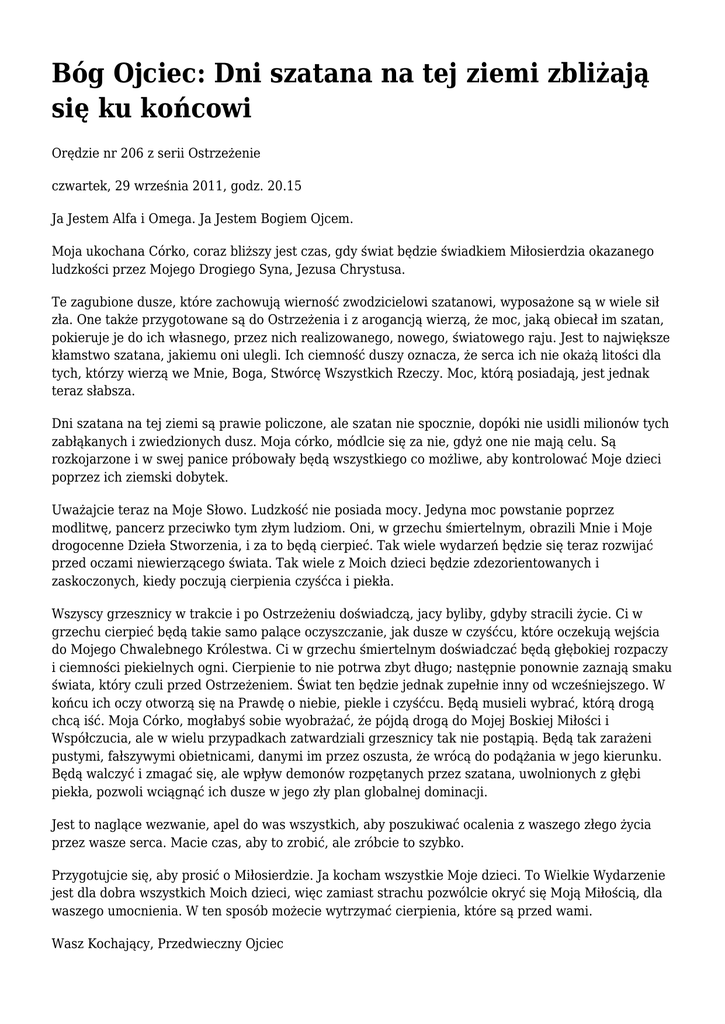 Bóg Ojciec: Dni szatana na tej ziemi zbliżają się ku końcowi Orędzie nr 206 z serii Ostrzeżenie czwartek, 29 września 2011, godz. 20.15 Ja Jestem Alfa i Omega. Ja Jestem Bogiem Ojcem. Moja ukochana Córko, coraz bliższy jest czas, gdy świat będzie świadkiem Miłosierdzia okazanego ludzkości przez Mojego Drogiego Syna, Jezusa Chrystusa. Te zagubione dusze, które zachowują wierność zwodzicielowi szatanowi, wyposażone są w wiele sił zła. One także przygotowane są do Ostrzeżenia i z arogancją wierzą, że moc, jaką obiecał im szatan, pokieruje je do ich własnego, przez nich realizowanego, nowego, światowego raju. Jest to największe kłamstwo szatana, jakiemu oni ulegli. Ich ciemność duszy oznacza, że serca ich nie okażą litości dla tych, którzy wierzą we Mnie, Boga, Stwórcę Wszystkich Rzeczy. Moc, którą posiadają, jest jednak teraz słabsza. Dni szatana na tej ziemi są prawie policzone, ale szatan nie spocznie, dopóki nie usidli milionów tych zabłąkanych i zwiedzionych dusz. Moja córko, módlcie się za nie, gdyż one nie mają celu. Są rozkojarzone i w swej panice próbowały będą wszystkiego co możliwe, aby kontrolować Moje dzieci poprzez ich ziemski dobytek. Uważajcie teraz na Moje Słowo. Ludzkość nie posiada mocy. Jedyna moc powstanie poprzez modlitwę, pancerz przeciwko tym złym ludziom. Oni, w grzechu śmiertelnym, obrazili Mnie i Moje drogocenne Dzieła Stworzenia, i za to będą cierpieć. Tak wiele wydarzeń będzie się teraz rozwijać przed oczami niewierzącego świata. Tak wiele z Moich dzieci będzie zdezorientowanych i zaskoczonych, kiedy poczują cierpienia czyśćca i piekła. Wszyscy grzesznicy w trakcie i po Ostrzeżeniu doświadczą, jacy byliby, gdyby stracili życie. Ci w grzechu cierpieć będą takie samo palące oczyszczanie, jak dusze w czyśćcu, które oczekują wejścia do Mojego Chwalebnego Królestwa. Ci w grzechu śmiertelnym doświadczać będą głębokiej rozpaczy i ciemności piekielnych ogni. Cierpienie to nie potrwa zbyt długo; następnie ponownie zaznają smaku świata, który czuli przed Ostrzeżeniem. Świat ten będzie jednak zupełnie inny od wcześniejszego. W końcu ich oczy otworzą się na Prawdę o niebie, piekle i czyśćcu. Będą musieli wybrać, którą drogą chcą iść. Moja Córko, mogłabyś sobie wyobrażać, że pójdą drogą do Mojej Boskiej Miłości i Współczucia, ale w wielu przypadkach zatwardziali grzesznicy tak nie postąpią. Będą tak zarażeni pustymi, fałszywymi obietnicami, danymi im przez oszusta, że wrócą do podążania w jego kierunku. Będą walczyć i zmagać się, ale wpływ demonów rozpętanych przez szatana, uwolnionych z głębi piekła, pozwoli wciągnąć ich dusze w jego zły plan globalnej dominacji. Jest to naglące wezwanie, apel do was wszystkich, aby poszukiwać ocalenia z waszego złego życia przez wasze serca. Macie czas, aby to zrobić, ale zróbcie to szybko. Przygotujcie się, aby prosić o Miłosierdzie. Ja kocham wszystkie Moje dzieci. To Wielkie Wydarzenie jest dla dobra wszystkich Moich dzieci, więc zamiast strachu pozwólcie okryć się Moją Miłością, dla waszego umocnienia. W ten sposób możecie wytrzymać cierpienia, które są przed wami. Wasz Kochający, Przedwieczny Ojciec Najwyższy Bóg