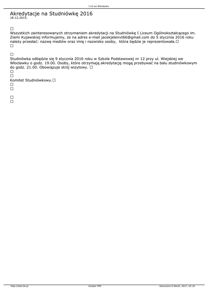 I LO we Włocławku Akredytacje na Studniówkę 2016 18.12.2015. Wszystkich zainteresowanych otrzymaniem akredytacji na Studniówkę I Liceum Ogólnokształcącego im. Ziemi Kujawskiej informujemy, że na adres e-mail [email protected] do 5 stycznia 2016 roku należy przesłać: nazwę mediów oraz imię i nazwisko osoby, która będzie je reprezentowała. Studniówka odbędzie się 9 stycznia 2016 roku w Szkole Podstawowej nr 12 przy ul. Wiejskiej we Włocławku o godz. 19.00. Osoby, które otrzymają akredytację mogą przebywać na balu studniówkowym do godz. 21.00. Obowiązuje strój wizytowy. Komitet Studniówkowy. http://test.lzk.pl Kreator PDF Utworzono 6 March, 2017, 22:16
