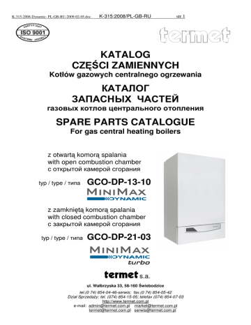 K-315-2008-Dynamic- PL-GB-RU-2009-02-05.doc CER SY ST E K-315:2008/PL-GB-RU str.1 T Y F I KA T MU J A K O ŚC I KATALOG CZĘŚCI ZAMIENNYCH Kotłów gazowych centralnego ogrzewania КАТАЛОГ ЗАПАСНЫХ ЧАСТЕЙ газовых котлов центрального отопления SPARE PARTS CATALOGUE For gas central heating boilers z otwartą komorą spalania with open combustion chamber с открытой камерой сгорания typ / type / типа GCO-DP-13-10 z zamkniętą komorą spalania with closed combustion chamber с закрытой камерой сгорания typ / type / типа GCO-DP-21-03 s.a. ul. Wałbrzyska 33, 58-160 Świebodzice tel.(0 74) 854-04-46-serwis; fax.(0 74) 854-05-42 Dział Sprzedaży: tel. (074) 854-15-05; telefax (074) 854-07-03 http://www.termet.com.pl e-mail: [email protected] [email protected] [email protected] [email protected] K-315-2008-Dynamic- PL-GB-RU-2009-02-05.doc K-315:2008/PL-GB-RU WPROWADZENIE str.2 Katalog części zamiennych kotła grzewczego przeznaczony jest głównie dla sprzedawców i punktów usługowych zajmujących się zamawianiem i rozprowadzaniem części, naprawą i konserwacją kotła w okresie gwarancyjnym i pogwarancyjnym. Katalog zawiera rysunek zestawieniowy kotła na którym pokazane są jego części i zespoły ich położenie i sposób zamocowania w wyrobie. Każda część na rysunku oznaczona jest numerem (pozycją), pod którym w odpowiedniej tabeli podawane są: nazwa, nr rysunku oraz opis miejsca zamontowania. Te części, których nie można było pokazać na rysunku występują w tabelach pod odpowiednią liczba porządkową. Przy zamawianiu określonych części należy powołać się na niniejszy katalog podając pełną nazwę części lub zespołu oraz nr rysunku. Przykład oznaczania części : Dysza na gaz ziemny 2E-G20 (GZ-50) o ciśnieniu dolotowym 20 mbar do kotła GCO-DP-13-10-21/21 w tabeli pod poz.15 znajdujemy: Dysza na gaz ziemny 2E-G20 (GZ-50) nr rys. Z1011.70.00.01 oznaczenie 125 ilość sztuk/wyrób = 10 INTRODUCTION Spare parts catalogue is dedicated mainly for salesmen and servicing stations that deal with ordering and selling spare parts for boilers as well as repairing and making all maintenance operations of boilers during guarantee period and after it. Spare parts catalogue includes the assembly drawing of the boiler where its components, assemblies and their localisation and way of its fastening in the product are presented on. Every spare part on the drawing has its own number (item), which is stated in a proper table with a name of a part, its drawing number and a description of the a place where a component is installed in. The parts that could not be presented on the drawing are listed in tables below the proper ordinal number. To order a part it is necessary to refer to this Spare Parts Catalogue and give a full name of a spare part or its drawing number. Example of parts designation A nozzle supplied with natural gas 2E-G20 (GZ-50) with an inlet pressure 20 mbar, for the boiler GCO-DP-13-10-21/21, in a table below the item 15 you can find: Nozzle for a natural gas 2E-G20 (GZ-50), drawing No Z1011.70.00.01 Designation 125, quantity / 1 product = 10 ВВЕДЕНИЕ Каталог запасных частей газовых котлов центрального отоплени предназначен прежде всего для продавцов и фирм занимающихся сервисом, ремонтом, консервацией в течении гарантийного и после гарантийного срока. В каталоге находятся сборочный чертёж который указывает узлы и элементы котла, их расположение и метод крепления в котле. Кажлая часть на сборочном чертеже обозначена номером (позиция) под котором в соответствующей табели находится: наименоване, номер чертежа, описание места установления и вид. Части которых не возможно указать на сборочным чертеже находятся в табели под соответствующим порядковым номером. При заказе определённых части надо создаться на настоящий каталог подавая полное наименование части или узла а также номер чертежа. Пример обозначения части: Сопло горелки на газ природный 2E-G20 (GZ-50) для давления на входе 20 мбар, для GCO-DP-13-10-21/21, В табели поз. 15 находим: Сопло горелки на газ природный 2E-G20 (GZ-50) № черт. Z1011.70.00.01 маркировка 125 количество штук/изделие = 10 K-315-2008-Dynamic- PL-GB-RU-2009-02-05.doc K-315:2008/PL-GB-RU Widok ogólny kotłów General view of the boilers Общий вид котлов str.3 K-315-2008-Dynamic- PL-GB-RU-2009-02-05.doc K-315:2008/PL-GB-RU str.4 Podstawowe elementy kotła typ Main component of the boiler type Основные элементы котлов типа GCO-DP-13-10 K-315-2008-Dynamic- PL-GB-RU-2009-02-05.doc K-315:2008/PL-GB-RU str.5 _ + Podstawowe elementy kotła typ GCO-DP-21-03 Main component Podstawowe of the boiler type GCO-DP-21-03 Основные элементы котлов типа GCO-DP-21-03 K-315:2008/PL-GB-RU K-315-2008-Dynamic- PL-GB-RU-2009-02-05.doc \2008 12 03 str.6 Lp. Ordinal number Поз. 1 1 Poz. na rys. lub fotografii kotła Item on the boiler drawing W yk az cz ę śc i z am i en n ych kot łów g az ow yc h c ent r al ne go og rz ew ani a , w p rodu k cj i od 1. 0 4. 20 0 8 Lis t of s pa r e pa rt s f o r g a s