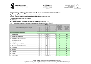 Przykładowy szkolny plan nauczania* /modułowe kształcenie zawodowe/ Typ szkoły: Technikum - 4-letni okres nauczania /1/ Zawód: Technik renowacji elementów architektury; symbol 311210 Podbudowa programowa: gimnazjum Kwalifikacje: K1 - Wykonywanie i renowacja detali architektonicznych (B.25.) K2 - Prowadzenie prac renowatorskich elementów architektury (B.26.) Klasa II I II I II I II I II Liczba godzin tygodniowo w czteroletnim okresie nauczania I III IV Obowiązkowe zajęcia edukacyjne Lp. Liczba godzin w czteroletnim okresie nauczania Przedmioty ogólnokształcące 1 Język polski 3 3 3 3 3 3 1 5 12 360 2 Język obcy nowożytny 2 2 2 2 3 3 2 4 10 300 3 Drugi język obcy nowożytny 1 1 1 1 1 1 1 3 5 150 4 Wiedza o kulturze 1 1 1 30 5 Historia 2 2 2 60 6 Wiedza o społeczeństwie 1 1 1 30 7 Podstawy przedsiębiorczości 1 1 2 60 8 Geografia 1 1 1 30 9 Biologia 1 1 1 30 10 Chemia 1 1 1 30 11 Fizyka 1 1 1 30 12 Matematyka 2 2 10 300 1 3 1 3 2 2 2 4 1 Projekt „Szkoła zawodowa szkołą pozytywnego wyboru” współfinansowany przez Unię Europejską w ramach Europejskiego Funduszu Społecznego 13 Informatyka 1 1 14 Wychowanie fizyczne 3 3 15 Edukacja dla bezpieczeństwa 1 1 16 Zajęcia z wychowawcą 1 1 1 1 Łączna liczba godzin 23 23 14 14 13 13 10 20 3 3 3 3 1 1 3 3 1 1 1 30 12 360 1 30 4 120 65 1950 Przedmioty realizowane w zakresie rozszerzonym oraz uzupełniające 1 Historia sztuki 2 Matematyka 3 Historia i społeczeństwo - przedmiot uzupełniający 1 Łączna liczba godzin Modułowe kształcenie zawodowe M1 Wykonywanie robót przygotowawczych w 1 renowacji elementów architektury M2 Wykonywanie oraz renowacja sztukatorskich 2 elementów architektury M3 Wykonywanie oraz renowacja kamieniarskich 3 elementów architektury M4 Renowacja warstw licowych elementów 4 architektury 5 M5 Przygotowanie do wejścia na rynek pracy Łączna liczba godzin 6 1 1 9 9 2 2 2 2 6 8 240 2 2 1 1 1 3 6 180 2 2 2 2 4 120 5 5 5 11 18 540 9 270 9,5 285 8,5 255 14 14 16 480 2 2 60 45 1350 5 160 50 1510 133 4000 4 4 17 2 10 7 4 9 9 17 5 9 9 33 17 2 12 11 16 16 PRAKTYKI ZAWODOWE ** Łączna liczba godzin kształcenia zawodowego Tygodniowy wymiar godzin obowiązkowych zajęć edukacyjnych /1/ 1 2 5 17 16 16 16 35 0 34 31 0 do celów obliczeniowych przyjęto 30 tygodni w ciągu jednego roku szkolnego 2 Projekt „Szkoła zawodowa szkołą pozytywnego wyboru” współfinansowany przez Unię Europejską w ramach Europejskiego Funduszu Społecznego *w szkolnym planie uwzględnia się również wymiar godzin zajęć określonych w par. 4 ust. 2 rozporządzenia w sprawie ramowych planów nauczania, tj. m.in. religii lub etyki oraz wychowania do życia w rodzinie. **w przypadku praktyk realizowanych w wymiarze ponad 4 tygodnie Wymiar praktyk zawodowych tyg. godz. kl. I - zgodnie z podstawą programową 0 kl. II - zgodnie z podstawą programową 4 160 kl. III - zgodnie z podstawą programową 4 160 kl. IV - zgodnie z podstawą programową 0 Razem 8 320 Egzamin potwierdzający pierwszą kwalifikację (B.25.) odbywa się pod koniec pierwszego semestru klasy trzeciej. Egzamin potwierdzający drugą kwalifikację (B.26.) odbywa się pod koniec pierwszego semestru klasy czwartej. 3 Projekt „Szkoła zawodowa szkołą pozytywnego wyboru” współfinansowany przez Unię Europejską w ramach Europejskiego Funduszu Społecznego Tabela efektów kształcenia Tabela przyporządkowania poszczególnym modułom efektów kształcenia dla zawodu: IV Liczba godzin przeznaczona na realizację efektów kształcenia Uczeń: I klasa II III I semestr II semestr I semestr II semestr I semestr II semestr I semestr II semestr Efekty kształcenia /umiejętności, wiedza oraz kompetencje personalne i społeczne/ Efekty wspólne dla wszystkich zawodów / wspólne dla zawodów w ramach obszaru B / kwalifikacje Numer i nazwa jednostki modułowej Numer i nazwa modułu Technik renowacji elementów architektury; symbol 311210 BHP(1) rozróżnia pojęcia związane z bezpieczeństwem i higieną pracy, ochroną przeciwpożarową, ochroną środowiska i ergonomią; BHP(2) rozróżnia zadania i uprawnienia instytucji oraz służb działających w zakresie ochrony pracy i ochrony środowiska w Polsce; BHP(3) określa prawa i obowiązki pracownika oraz pracodawcy w zakresie bezpieczeństwa i higieny pracy; BHP(4) przewiduje zagrożenia dla zdrowia i życia człowieka oraz mienia i środowiska związane z wykonywaniem zadań zawodowych; BHP(5) określa zagrożenia związane z występowaniem szkodliwych czynników w środowisku pracy; BHP(6) określa skutki oddziaływania czynników szkodliwych na organizm człowieka; X X BHP M1.J1 Przestrzeganie przepisów bezpieczeństwa i higieny pracy podczas robót renowatorskich M1 Wykonywanie robót przygotowawczych w renowacji elementów architektury Kształcenie modułowe X 15 X X X 4 Projekt „Szkoła zawodowa szkołą pozytywnego wyboru” współfinansowany przez Unię Europejską w ramach Europejskiego Funduszu Społecznego 15 75 150 30 KPS M1.J2 Posługiwanie się i wykonywanie dokumentacji w pracach renowatorskich BHP(9) przestrzega zasad bezpieczeństwa i higieny pracy oraz stosuje X przepisy prawa dotyczące ochrony przeciwpożarowej i ochrony środowiska; BHP(10) udziela pierwszej pomocy poszkodowanym w wypadkach przy pracy X oraz w stanach zagrożenia zdrowia i życia. Łączna liczba godzin przeznaczona na jednostkę modułową M1.J1 PKZ(B.h)(2) rozpoznaje formy, typy ikonograficzne oraz style XX architektoniczne; PKZ(B.h)(3) posługuje się dokumentacją techniczną i technologiczną; PKZ(B.h) X X PKZ(B.h)(4) stosuje programy komputerowe wspomagające wykonywanie XX zadań. PKZ(B.c)(2) rozróżnia konstrukcje obiektów budowlanych i technologie ich XX wykonania; XX PKZ(B.c)(5) przestrzega zasad sporządzania rysunków budowlanych; XX PKZ(B.c)(6) wykonuje szkice robocze; PKZ(B.c)(7) rozróżnia rodzaje i elementy dokumentacji stosowanej PKZ(B.c) X X w budownictwie; PKZ(B.c)(8) rozróżnia przyrządy