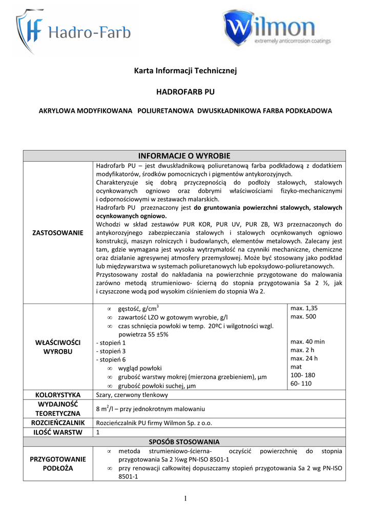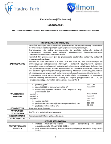 Karta Informacji Technicznej HADROFARB PU AKRYLOWA MODYFIKOWANA POLIURETANOWA DWUSKŁADNIKOWA FARBA PODKŁADOWA INFORMACJE O WYROBIE ZASTOSOWANIE Hadrofarb PU – jest dwuskładnikową poliuretanową farba podkładową z dodatkiem modyfikatorów, środków pomocniczych i pigmentów antykorozyjnych. Charakteryzuje się dobrą przyczepnością do podłoży stalowych, stalowych ocynkowanych ogniowo oraz dobrymi właściwościami fizyko-mechanicznymi i odpornościowymi w zestawach malarskich. Hadrofarb PU przeznaczony jest do gruntowania powierzchni stalowych, stalowych ocynkowanych ogniowo. Wchodzi w skład zestawów PUR KOR, PUR UV, PUR ZB, W3 przeznaczonych do antykorozyjnego zabezpieczania stalowych i stalowych ocynkowanych ogniowo konstrukcji, maszyn rolniczych i budowlanych, elementów metalowych. Zalecany jest tam, gdzie wymagana jest wysoka wytrzymałość na czynniki mechaniczne, chemiczne oraz działanie agresywnej atmosfery przemysłowej. Może być stosowany jako podkład lub międzywarstwa w systemach poliuretanowych lub epoksydowo-poliuretanowych. Przystosowany został do nakładania na powierzchnie przygotowane do malowania zarówno metodą strumieniowo- ścierną do stopnia przygotowania Sa 2 ½, jak i czyszczone wodą pod wysokim ciśnieniem do stopnia Wa 2. • • • WŁAŚCIWOŚCI WYROBU KOLORYSTYKA WYDAJNOŚĆ TEORETYCZNA ROZCIEŃCZALNIK ILOŚĆ WARSTW gęstość, g/cm3 zawartość LZO w gotowym wyrobie, g/l czas schnięcia powłoki w temp. 20ºC i wilgotności wzgl. powietrza 55 ±5% - stopień 1 - stopień 3 - stopień 6 • wygląd powłoki • grubość warstwy mokrej (mierzona grzebieniem), µm • grubość powłoki suchej, µm Szary, czerwony tlenkowy max. 1,35 max. 500 max. 40 min max. 2 h max. 24 h mat 100- 180 60- 110 8 m2/l – przy jednokrotnym malowaniu Rozcieńczalnik PU firmy Wilmon Sp. z o.o. 1 SPOSÓB STOSOWANIA • PRZYGOTOWANIE PODŁOŻA • metoda strumieniowo-ściernaoczyścić powierzchnię do stopnia przygotowania Sa 2 ½wg PN-ISO 8501-1 przy renowacji całkowitej dopuszczamy stopień przygotowania Sa 2 wg PN-ISO 8501-1 1 • czyszczenie wodą pod wysokim ciśnieniem- oczyścić powierzchnię do stopnia przygotowania Wa 2 wg PN-ISO 8501-4 • powierzchnie ocynkowane lub aluminiowe powinny być oczyszczone i odtłuszczone przez zmycie ciepłą wodą z dodatkiem preparatu HADRO CLEAN za pomocą miękkiej szczotki lub za pomocą natrysku wysokociśnieniowego aparatem np. typu Kärcher następnie spłukać czystą wodą i wysuszyć czystym sprężonym powietrzem lub pozostawić do wyschnięcia Składnik TR dokładnie wymieszać, a następnie zmieszać ze składnikiem S w proporcji 100:5 (20:1) objętościowo, po upływie 15 minut mieszanina powinna nadawać się do aplikacji. W razie konieczności mieszaninę składników można rozcieńczyć dodając max. 5% rozpuszczalnika uniwersalnego PU produkcji Wilmon Sp. z o.o. PRZYGOTOWANIE WYROBU Uwaga: Nie wolno rozcieńczać samego składnika TR. Czas życia mieszaniny w temperaturze 20ºC wynosi maksymalnie 5 h, czas ten może ulec skróceniu wraz ze wzrostem temperatury. Każdą porcję wyrobu przygotowywać w czystych pojemnikach i nie należy mieszać nowej porcji z resztkami nie zużytego wyrobu. Pojemnik ze składnikiem S natychmiast po dozowaniu szczelnie zamknąć. Wykluczone jest ponowne rozcieńczanie zagęszczonego wyrobu, gdyż nałożona powłoka może ulec złuszczeniu lub może wystąpić obniżenie przyczepności. • • MALOWANIE prace malarskie prowadzić w temperaturze otoczenia +10°C do +25 °C, temperatura podłoża co najmniej 3 ºC wyższa od temperatury punktu rosy, powinna mieścić się w przedziale pomiędzy +5 °C a +25ºC • wilgotność względna powietrza nie powinna przekraczać 80% • nie malować w upalne dni oraz przy silnym wietrze • pełne utwardzenie powłoki następuje po ok. 10 dniach od wymalowania Warunki malowania decydują o czasie schnięcia warstwy wyrobu i właściwościach uzyskanej powłoki, • Czas do nałożenia kolejnych warstw*: Najkrótszy – 4 h Najdłuższy – nieograniczony W przypadku malowania w innej temperaturze niż 15-25oC i innych warunkach odbiegających od optymalnych, nakładanie następnej warstwy należy poprzedzić próbnym malowaniem na kawałku malowanej powierzchni i po wyschnięciu ocenić wygląd powłoki (nie może być zmarszczeń, podnoszenia powłoki). METODY APLIKACJI Pędzel, natrysk hydrodynamiczny (bezpowietrzny), natrysk pneumatyczny (wyłącznie w instalacjach) • zalecane parametry natrysku hydrodynamicznego : - średnica dyszy 0,38 mm (0,011- 0,015”) - ciśnienie na dyszy 170 barów Dobór parametrów natrysku uzależniony jest od urządzenia natryskowego i powinien być poprzedzony próbami technicznymi. Do mycia aparatury należy stosować Rozcieńczalnik PU produkcji Wilmon Sp. z o.o. DODATKOWE INFORMACJE OKRES PRZYDATNOŚCI Składnik TR Składnik S 24 miesiące 12 miesięcy 2 OPAKOWANIA PRZECHOWYWANIE I TRANSPORT 10 l, 20 l Przechowywanie- w szczelnie zamkniętych opakowaniach w temp. od 0°C do +30°C, z dala od źródeł ciepła i zapłonu 3