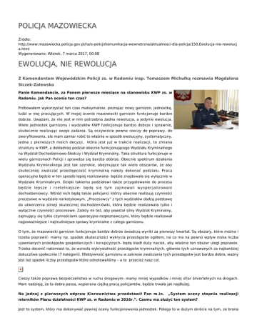 POLICJA MAZOWIECKA Źródło: http://www.mazowiecka.policja.gov.pl/ra/o-policji/komunikacja-wewnetrzna/aktualnosci-dla-policja/150,Ewolucja-nie-rewolucj a.html Wygenerowano: Wtorek, 7 marca 2017, 00:08 EWOLUCJA, NIE REWOLUCJA Z Komendantem Wojewódzkim Policji zs. w Radomiu insp. Tomaszem Michułką rozmawia Magdalena Siczek-Zalewska Panie Komendancie, za Panem pierwsze miesiące na stanowisku KWP zs. w Radomiu. Jak Pan ocenia ten czas? Próbowałem wykorzystać ten czas maksymalnie, poznając nowy garnizon, jednostkę, ludzi w niej pracujących. W mojej ocenie mazowiecki garnizon funkcjonuje bardzo dobrze. Uważam, że nie jest w nim potrzebna żadna rewolucja, a jedynie ewolucja. Wiele jednostek garnizonu i wydziałów KWP funkcjonuje bardzo dobrze i sprawnie, skutecznie realizując swoje zadania. Są oczywiście pewne rzeczy do poprawy, do zweryfikowania, ale mam zamiar robić to właśnie w sposób ewolucyjny, systematyczny. Jedna z pierwszych moich decyzji, która jest już w trakcie realizacji, to zmiana struktury w KWP, a dokładniej podział obecnie funkcjonującego Wydziału Kryminalnego na Wydział Dochodzeniowo-Śledczy i Wydział Kryminalny. Taka struktura funkcjonuje w wielu garnizonach Policji i sprawdza się bardzo dobrze. Obecnie spektrum działania Wydziału Kryminalnego jest tak szerokie, obejmujące tak wiele obszarów, że aby skuteczniej zwalczać przestępczość kryminalną należy dokonać podziału. Praca operacyjna będzie w ten sposób lepiej realizowana- będzie znajdowała się wyłącznie w Wydziale Kryminalnym. Dzięki takiemu podziałowi także przygotowanie do procesu będzie lepsze i rzetelniejsze- będą się tym zajmowali wyspecjalizowani dochodzeniowcy. Wśród nich będą także policjanci którzy obecnie realizują czynności procesowe w wydziale narkotykowym. „Procesowcy” z tych wydziałów dadzą podstawę do utworzenia silneji skutecznej dochodzeniówki, która będzie realizowała tylko i wyłącznie czynności procesowe. Zależy mi też, aby powstał silny Wydział Kryminalny, zajmujący się tylko czynnościami operacyjno-rozpoznawczymi, który będzie realizował najpoważniejsze i najtrudniejsze sprawy kryminalne z całego garnizonu. O tym, że mazowiecki garnizon funkcjonuje bardzo dobrze świadczą wyniki za pierwszy kwartał. Są obszary, które można i trzeba poprawić- mamy np. spadek skuteczności wykrycia przestępstw ogółem, na co ma na pewno wpływ niska liczba ujawnianych przestępstw gospodarczych i korupcyjnych- będę kładł duży nacisk, aby właśnie ten obszar uległ poprawie. Trzeba docenić natomiast to, że wzrosła wykrywalność przestępstw kryminalnych, głównie tych uznawanych za najbardziej dokuczliwe społecznie (7 kategorii). Efektywność garnizonu w zakresie zwalczania tych przestępstw jest bardzo dobra, ważny jest też spadek liczby przestępstw które odnotowaliśmy – a to przecież nasz cel. Cieszy także poprawa bezpieczeństwa w ruchu drogowym- mamy mniej wypadków i mniej ofiar śmiertelnych na drogach. Mam nadzieję, że ta dobra passa, wspierana ciężką pracą policjantów, będzie trwała jak najdłużej. Na jednej z pierwszych odpraw Kierownictwa przedstawił Pan m.in. „System oceny stopnia realizacji mierników Planu działalności KWP zs. w Radomiu w 2016r.”. Czemu ma służyć ten system? Jest to system, który ma dokonywać pewnej oceny funkcjonowania jednostek. Polega to w dużym skrócie na tym, ze brana jest pod uwagę realizacja wszystkich mierników KGP i mierników KWP. Do tych mierników dostosowany został system punktowy- w zależności od tego na jakim stopniu realizacji jest dany miernik i czy został zrealizowany próg satysfakcji. Suma tych punktów daje nam wynik pokazujący jak dana jednostka wywiązuje się z mierników KGP i KWP, a to rodzi pewne współzawodnictwo między komendami. Współzawodnictwo jest narzędziem motywacyjnym, które powoduje mobilizację i chęć bycia lepszym od innych. Musi być to jednak współzawodnictwo, nie rywalizacja, gdyż ta ostatnia ma często zabarwienie negatywne, a ja tego nie chcę. To ma być czysta gra, oparta na jasnych zasadach, ukierunkowana także na wspieranie się wzajemne jednostek. Ma jeden cel- poprawę jakości pracy komend i tym samym poprawę bezpieczeństwa w garnizonie. Finalnie, te jednostki które osiągną najlepsze efekty będą przeze mnie specjalnie nagradzane i wyróżniane- co zapewne odczują także policjanci pracujący w terenie. Jako jeden z priorytetów wymienia Pan bezpieczeństwo imprez masowych. To priorytet „na czasie” bo jesteśmy w przededniu m.in. Światowych Dni Młodzieży. Jakie wyzwania i zadania stoją przed mazowieckimi policjantami? Zadania dla mazowieckich policjantów są w tym zakresie podobne jak dla policjantów w całym kraju. Naszym celem na dziś jest maksymalnie dobre przygotowanie się, zbieranie informacji o zagrożeniach, skuteczne przeciwdziałanie już zdefiniowanym zagrożeniom i koncentracja sił i środków, by były jak najlepiej wykorzystane w lipcu. Rozmawiając o wyzwaniach i nowych, odpowiedzialnych zadaniach trudno nie wspomnieć o motywacji. Jakie jest Pana podejście do tego elementu zarządzania? Czy mazowieccy policjanci i pracownicy Policji mogą na coś liczyć w najbliższym czasie? Jedną z pierwszych decyzji które tutaj podjąłem, jest decyzja o powołaniu zespołu zadaniowego, którego celem jest zbadanie struktur funkcjonowania poszczególnych jednostek i komórek organizacyjnych, a także zasad dotyczących mianowania na wyższe stanowiska służbowe, przydziału dodatków służbowych. Finalnie zostaną wypracowane rozwiązania systemowe, które będą jasne i przejrzyste dla wszystkich policjantów i pracowników. Dążę do tego, by zostały ustalone pewne zasady i reguły, które będą obowiązywały wszystkich i które dla wszystkich będą przejrzyste, gdyż transparentność jest bardzo ważna w tych kwestiach. Uważam, że będzie to