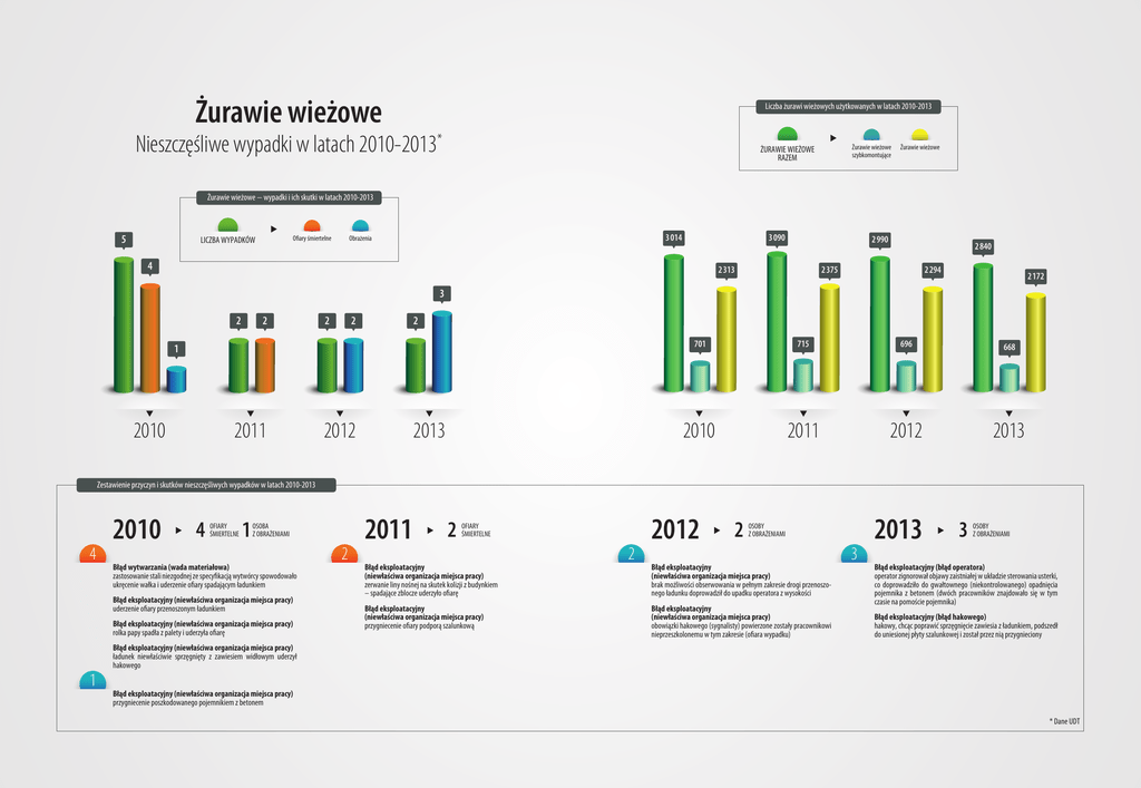 Żurawie wieżowe Liczba żurawi wieżowych użytkowanych w latach 2010-2013 Nieszczęśliwe wypadki w latach 2010-2013* Żurawie wieżowe szybkomontujące ŻURAWIE WIEŻOWE RAZEM Żurawie wieżowe Żurawie wieżowe − wypadki i ich skutki w latach 2010-2013 5 Ofiary śmiertelne LICZBA WYPADKÓW 3 014 Obrażenia 3 090 4 2 990 2 313 2 840 2 375 2 294 2 172 3 2 2 2 2 2 1 2010 2011 2012 2013 701 715 696 668 2010 2011 2012 2013 Zestawienie przyczyn i skutków nieszczęśliwych wypadków w latach 2010-2013 4 2010 4 OFIARY ŚMIERTELNE 1 OSOBA Z OBRAŻENIAMI Błąd wytwarzania (wada materiałowa) zastosowanie stali niezgodnej ze specyfikacją wytwórcy spowodowało ukręcenie wałka i uderzenie ofiary spadającym ładunkiem Błąd eksploatacyjny (niewłaściwa organizacja miejsca pracy) uderzenie ofiary przenoszonym ładunkiem Błąd eksploatacyjny (niewłaściwa organizacja miejsca pracy) rolka papy spadła z palety i uderzyła ofiarę 1 2 2011 2 OFIARY ŚMIERTELNE Błąd eksploatacyjny (niewłaściwa organizacja miejsca pracy) zerwanie liny nośnej na skutek kolizji z budynkiem – spadające zblocze uderzyło ofiarę Błąd eksploatacyjny (niewłaściwa organizacja miejsca pracy) przygniecenie ofiary podporą szalunkową 2 2012 2 OSOBY Z OBRAŻENIAMI Błąd eksploatacyjny (niewłaściwa organizacja miejsca pracy) brak możliwości obserwowania w pełnym zakresie drogi przenoszonego ładunku doprowadził do upadku operatora z wysokości Błąd eksploatacyjny (niewłaściwa organizacja miejsca pracy) obowiązki hakowego (sygnalisty) powierzone zostały pracownikowi nieprzeszkolonemu w tym zakresie (ofiara wypadku) 3 2013 3 OSOBY Z OBRAŻENIAMI Błąd eksploatacyjny (błąd operatora) operator zignorował objawy zaistniałej w układzie sterowania usterki, co doprowadziło do gwałtownego (niekontrolowanego) opadnięcia pojemnika z betonem (dwóch pracowników znajdowało się w tym czasie na pomoście pojemnika) Błąd eksploatacyjny (błąd hakowego) hakowy, chcąc poprawić sprzęgnięcie zawiesia z ładunkiem, podszedł do uniesionej płyty szalunkowej i został przez nią przygnieciony Błąd eksploatacyjny (niewłaściwa organizacja miejsca pracy) ładunek niewłaściwie sprzęgnięty z zawiesiem widłowym uderzył hakowego Błąd eksploatacyjny (niewłaściwa organizacja miejsca pracy) przygniecenie poszkodowanego pojemnikiem z betonem * Dane UDT