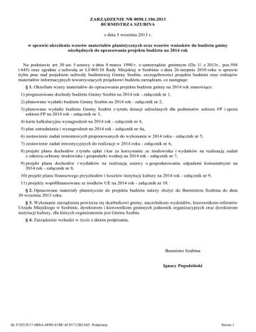ZARZĄDZENIE NR 0050.1.106.2013 BURMISTRZA SZUBINA z dnia 5 września 2013 r. w sprawie określenia wzorów materiałów planistycznych oraz wzorów wniosków do budżetu gminy niezbędnych do opracowania projektu budżetu na 2014 rok Na podstawie art. 30 ust. 5 ustawy z dnia 8 marca 1990 r. o samorządzie gminnym (Dz. U. z 2013r., poz.594 i 645) oraz zgodnie z uchwałą nr LI/405/10 Rady Miejskiej w Szubinie z dnia 26 sierpnia 2010 roku w sprawie trybu prac nad projektem uchwały budżetowej Gminy Szubin, szczegółowości projektu budżetu oraz rodzajów materiałów informacyjnych towarzyszących projektowi budżetu zarządzam, co następuje: § 1. Określam wzory materiałów do opracowania projektu budżetu gminy na 2014 rok stanowiące: 1) prognozowane dochody budżetu Gminy Szubin na 2014 rok - załącznik nr 1, 2) planowane wydatki budżetu Gminy Szubin na 2014 rok - załącznik nr 2, 3) planowane wydatki budżetu Gminy Szubin z tytułu dotacji udzielanych dla podmiotów sektora FP i spoza sektora FP na 2014 rok - załącznik nr 3, 4) karta kalkulacyjna wynagrodzeń na 2014 rok - załącznik nr 4, 5) plan zatrudnienia i wynagrodzeń na 2014 rok - załącznik nr 4a, 6) zestawienie zadań remontowych proponowanych do wykonania w 2014 roku - załącznik nr 5, 7) zestawienie zadań inwestycyjnych do realizacji w 2014 roku - załącznik nr 6, 8) projekt planu dochodów z tytułu opłat i kar za korzystanie ze środowiska i wydatków na realizację zadań z zakresu ochrony środowiska i gospodarki wodnej na 2014 rok - załącznik nr 7, 9) projekt planu dochodów i wydatków na realizację ustawy o gospodarowaniu odpadami komunalnymi na 2014 rok - załącznik nr 8, 10) projekt planu finansowego przychodów i kosztów instytucji kultury na 2014 rok - załącznik nr 9, 11) projekty współfinansowane ze środków UE na 2014 rok - załącznik nr 10. § 2. Opracowane materiały planistyczne do projektu budżetu należy złożyć do Burmistrza Szubina do dnia 30 września 2013 roku. § 3. Wykonanie zarządzenia powierza się skarbnikowi gminy, naczelnikom wydziałów, kierownikom referatów Urzędu Miejskiego w Szubinie, dyrektorom i kierownikom gminnych jednostek organizacyjnych oraz dyrektorom instytucji kultury, dla których organizatorem jest Gmina Szubin. § 4. Zarządzenie wchodzi w życie z dniem podpisania. Burmistrz Szubina Ignacy Pogodziński Id: F1D33E17-6B8A-489D-81BF-4C01712B3A85. Podpisany Strona 1 Załącznik Nr 1 do zarządzenia nr 0050.1.106.2013 Burmistrza Szubina z dnia 5 września 2013r. Prognozowane dochody budżetu Gminy Szubin na 2014 rok Nazwa jednostki realizującej: .................................................................................................................... Lp. dział Roz§ czwart Wyszczególprzewidywane dział a nienie wykonanie w cyfra 2013 1 1 2 3 4 5 6 7 8 9 10 Razem 2 3 4 5 6 7 kwota wnioskowana do projektu uchwały budżetowej na 2014 rok 8 % wskaźnik (8:7) 9 ................................................ data i podpis Id: F1D33E17-6B8A-489D-81BF-4C01712B3A85. Podpisany Strona 2 Załącznik Nr 2 do zarządzenia nr 0050.1.106 .2013 Burmistrza Szubina z dnia 5 września 2013 roku Planowane wydatki budżetu Gminy Szubin na 2014 rok Nazwa jednostki realizującej: ....................................................................................................................................... dział .................................... rozdział ................................ Zatrudnienie ilość etatów Administracja ………………. Obsługa ……………..... Razem ………………. § Wyszczególnienie Podział na rodzaje wydatków Przewidywane wykonanie w roku 2013 kwota wnioskowana do projektu uchwały budżetowej na 2014 rok 1 2 3 4 5 I. Wydatki bieżące ogółem 3020 wydatki osobowe niezaliczane do wynagrodzeń 3030 różne wydatki na rzecz osób fizycznych 3110 świadczenia społeczne 4010 wynagrodzenia osobowe pracowników 4040 dodatkowe wynagrodzenia roczne wynagrodzenia agencyjnoprowizyjne składki na ubezpieczenia społeczne 4100 4110 4120 składki na Fundusz Pracy 1.wydatki wynikające z przepisów BHP 2.ekwiwalent 3. inne Razem 1.diety 2.inne Razem 1.Świadczenia rodz. 2.fund.alim. 3.dod.mieszk. 4.zasiłki stałe 5.zasiłki okresowe 6. stypendia socjalne 7. inne zasiłki Razem 1.wynagrodzenia osobowe 2.fundusz nagród 3.odprawy emeryt. 4.nagrody jubileusz. Razem 1.składki ZUS od wynagrodzeń 2.składki ZUS od tzw.13 3składki ZUS od funduszu bezosobowego i wynagr.ag.-prow. 4.Razem 1.składki FP od wynagrodzeń 2.składkiFP od tzw. 13 Id: F1D33E17-6B8A-489D-81BF-4C01712B3A85. Podpisany Strona 3 3.składki FP od funduszu bezosobowego i wynagr.ag.-prow. 4. Razem 4130 4140 4170 4210 4220 4240 4260 4270 4280 4300 składki na ubezpieczenia zdrowotne wpłaty na Państwowy Fundusz Rehabilitacji Osób Niepełnosprawnych wynagrodzenia bezosobowe zakup materiałów i 1.opał(węgiel, miał, koks, olej) wyposażenia 2.paliwo (benzyna, ropa) 3.mat.biurowe, druki 4.papier do urządz. kserogr., drukarek 5.zakup publikacji i czasopism, dz.u. itp. 6.1.zestawy komp. do 3.500 zł 6.2. drukarki itp. urz. do 3.500 zł 6.3.zakup oprogramowania wraz z licencją do 3.500 zł 6.wyposażenie(meble, RTV,agd) 7.1.materiały eksploatacyjne do urządzeń biurowych(tonery, części) 7.2. akcesoria komputerowe 8.środki czystości 9. inne-wymienić jakie Razem zakup środków żywności zakup pomocy naukowych, dydaktycznych i książek zakup energii 1.c.o. 2.energia elektryczna 3.gaz 4.woda Razem zakup usług remontowych 1.naprawy urządzeń i różnego rodzaju sprzętu biurowego (konserwacje) 2.remonty pomieszczeń i budynków w tym opracowania dokumentacji 3.remonty,naprawy dróg, oświetlenia, 4.inne Razem zakup usług zdrowotnych zakup usług pozostałych 1.prowizje i opłaty bankowe 2.opłaty pocztowe (RTV i inne)w tym frankownica 3.1. usługi transportowe, 3.2. usługi pozostałe(np.przesyłowe) 4.przeglądy(inst.alarm, gasnice,itp.)