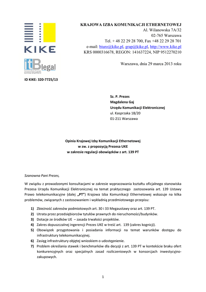 KRAJOWA IZBA KOMUNIKACJI ETHERNETOWEJ Al. Wilanowska 7A/32 02-765 Warszawa Tel. + 48 22 29 28 700, Fax +48 22 29 28 701 e-mail: [email protected], [email protected], http://www.kike.pl KRS 0000316678, REGON: 141637224, NIP 9512270210 Warszawa, dnia 29 marca 2013 roku ID KIKE: 320-7725/13 Sz. P. Prezes Magdalena Gaj Urzędu Komunikacji Elektronicznej ul. Kasprzaka 18/20 01-211 Warszawa Opinia Krajowej Izby Komunikacji Ethernetowej w zw. z propozycją Prezesa UKE w zakresie regulacji obowiązków z art. 139 PT Szanowna Pani Prezes, W związku z prowadzonymi konsultacjami w zakresie wypracowania kształtu oficjalnego stanowiska Prezesa Urzędu Komunikacji Elektronicznej na temat praktycznego zastosowania art. 139 Ustawy Prawo telekomunikacyjne (dalej „PT”) Krajowa Izba Komunikacji Ethernetowej wskazuje na kilka problemów, związanych z zastosowaniem i wykładnią przedmiotowego przepisu: 1) 2) 3) 4) 5) Zbieżność zakresów podmiotowych art. 30 i 33 Megaustawy oraz art. 139 PT. Utrata przez przedsiębiorców tytułów prawnych do nieruchomości/budynków. Dotacje ze środków UE – zasada trwałości projektów. Zakres dopuszczalnej ingerencji Prezes UKE w treść art. 139 (zakres kognicji). Obowiązek przygotowania i posiadania informacji na temat warunków dostępu do infrastruktury telekomunikacyjnej. 6) Zasięg infrastruktury objętej wnioskiem o udostępnienie. 7) Problem określania stawek i benchmarków dla decyzji z art. 139 PT w kontekście braku ofert konkurencyjnych oraz specjalnych zasad rozliczeniowych w konsorcjach inwestycyjnozakupowych. 1 Ad. 1 Zbieżność zakresu podmiotowego art. 30 i 33 Ustawy o wspieraniu rozwoju usług i sieci telekomunikacyjnych (dalej ustawa szerokopasmowa) i art. 139 PT – problem spółdzielni mieszkaniowych, będących przedsiębiorcami telekomunikacyjnymi Autorzy opracowania zwracają uwagę na problem zakresu podmiotowego art. 30 i 33 ustawy szerokopasmowej oraz omawianego art. 139 PT. Celem nowelizacji art. 139 PT było jasne rozgraniczenie obowiązków wynikających z w/w przepisów w taki sposób, aby zakresy przedmiotowe i podmiotowe przepisów nie zachodziły na siebie, a istniejąca infrastruktura była wykorzystywana w sposób efektywny. Na gruncie praktycznego zastosowania przepisów stanowiących w obecnym stanie prawnym podstawę uzyskiwania dostępu do nieruchomości gruntowych i budynkowych oraz infrastruktury technicznej pojawił się problem dostępu do budynków zarządzanych przez spółdzielnie mieszkaniowe, które posiadają status przedsiębiorców telekomunikacyjnych. Spółdzielnia występuje w kontekście zasygnalizowanej sytuacji w dwojakiej roli, tj. zarówno jako przedsiębiorca telekomunikacyjny oraz jako zarządca nieruchomości wspólnej (najczęściej będący także współwłaścicielem nieruchomości wspólnej, w tym wspólnej, wewnątrzbudynkowej infrastruktury telekomunikacyjnej), występujący zarówno w imieniu członków spółdzielni jak i właścicieli wyodrębnionych lokali. a) Zamierzone wyjście spółdzielni spod regulacji art. 30 ustawy szerokopasmowej Należy podkreślić, iż nowelizacja art. 30 ustawy szerokopasmowej rozwiązała część problemów interpretacyjnych powstałych na gruncie stosowania przepisów w ich pierwotnym brzmieniu. Ustawodawca sprecyzował między innymi, iż udostępnienie nieruchomości i budynków, o którym mowa w art. 30 ust. 1 ustawy szerokopasmowej ma charakter nieodpłatny, jeżeli służy zapewnieniu telekomunikacji mieszkańcom nieruchomości, a zawarcie umowy stanowi czynność zwykłego zarządu, co ostatecznie zakończyło problem konieczności uzyskiwania zgody właścicieli wyodrębnionych lokali. W chwili obecnej, literalne brzmienie art. 30 ust 1 ustawy szerokopasmowej wyklucza jego zastosowanie w przypadkach, w których spółdzielnia posiada status przedsiębiorcy telekomunikacyjnego. Wydaje się jednak, iż zastosowanie art. 139 PT, jako podstawy dostępu telekomunikacyjnego w omawianym przypadku, ponownie rodzi problemy interpretacyjne, z którymi przedsiębiorcy telekomunikacyjni borykali się przed nowelizacją ustawy. Ponownie pojawia się problem odpłatności za dostęp do budynków wchodzących w skład zasobów mieszkaniowych spółdzielni oraz możliwość zawierania przez spółdzielnię umowy dostępowej w imieniu właścicieli wyodrębnionych lokali. Spółdzielnie mieszkaniowe, aby wyjść spod regulacji art. 30 ustawy szerokopasmowej (nieodpłatne udostępnienie nieruchomości) dokonają rejestracji w rejestrze przedsiębiorców telekomunikacyjnych Prezesa UKE po to aby, po pierwsze, utrudnić/uniemożliwić dostęp do budynków spółdzielni/zarządzanych przez spółdzielnie na podstawie art. 30 w/w ustawy szerokopasmowej, po drugie, aby za dostęp pobierać opłaty w oparciu o art. 139 PT skoro wyłączona jest taka możliwość na podstawie art. 30 ustawy szerokopasmowej. b) Podstawa do prowadzenia negocjacji - art. 30 ustawy szerokopasmowej czy art. 139 PT Autorzy poważny problem dostrzegają w określeniu podstawy prawnej prowadzenia negocjacji w zakresie dostępu do budynku/infrastruktury wewnątrzbudynkowej w sytuacji kiedy spółdzielnia 2 mieszkaniowa, będąca jednocześnie przedsiębiorcą telekomunikacyjnym jest jednocześnie współwłaścicielem części wspólnych budynków (zapewne 100% przypadków), i będącym zarządcą nieruchomości (zapewne najczęstsza sytuacja). Niejasne jest w chwili obecnej, czy negocjacje w sprawie dostępu do nieruchomości wspólnej, przedsiębiorca telekomunikacyjny zobowiązany jest prowadzić ze spółdzielnią, jako zarządcą nieruchomości i jednocześnie przedsiębiorcą telekomunikacyjnym w trybie art. 139 PT, czy też możliwe/konieczne jest prowadzenie negocjacji odrębnie/równolegle/w pewnych przypadkach (jakich?) na podstawie art. 30 ust. 1 ustawy szerokopasmowej? Dochodzi w omawianym przypadku do swoistej konfuzji, bowiem mamy do czynienia z sytuacją, w której podstawą d