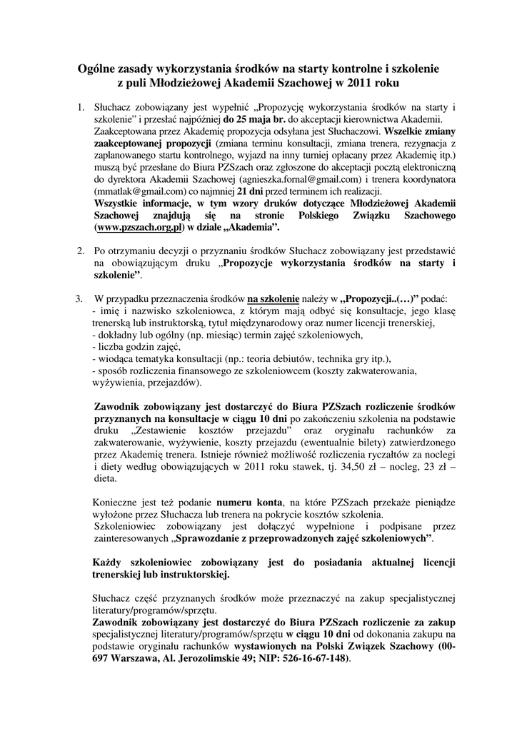 Ogólne zasady wykorzystania środków na starty kontrolne i szkolenie z puli MłodzieŜowej Akademii Szachowej w 2011 roku 1. Słuchacz zobowiązany jest wypełnić „Propozycję wykorzystania środków na starty i szkolenie” i przesłać najpóźniej do 25 maja br. do akceptacji kierownictwa Akademii. Zaakceptowana przez Akademię propozycja odsyłana jest Słuchaczowi. Wszelkie zmiany zaakceptowanej propozycji (zmiana terminu konsultacji, zmiana trenera, rezygnacja z zaplanowanego startu kontrolnego, wyjazd na inny turniej opłacany przez Akademię itp.) muszą być przesłane do Biura PZSzach oraz zgłoszone do akceptacji pocztą elektroniczną do dyrektora Akademii Szachowej ([email protected]) i trenera koordynatora ([email protected]) co najmniej 21 dni przed terminem ich realizacji. Wszystkie informacje, w tym wzory druków dotyczące MłodzieŜowej Akademii Szachowej znajdują się na stronie Polskiego Związku Szachowego (www.pzszach.org.pl) w dziale „Akademia”. 2. Po otrzymaniu decyzji o przyznaniu środków Słuchacz zobowiązany jest przedstawić na obowiązującym druku „Propozycje wykorzystania środków na starty i szkolenie”. 3. W przypadku przeznaczenia środków na szkolenie naleŜy w „Propozycji..(…)” podać: - imię i nazwisko szkoleniowca, z którym mają odbyć się konsultacje, jego klasę trenerską lub instruktorską, tytuł międzynarodowy oraz numer licencji trenerskiej, - dokładny lub ogólny (np. miesiąc) termin zajęć szkoleniowych, - liczba godzin zajęć, - wiodąca tematyka konsultacji (np.: teoria debiutów, technika gry itp.), - sposób rozliczenia finansowego ze szkoleniowcem (koszty zakwaterowania, wyŜywienia, przejazdów). Zawodnik zobowiązany jest dostarczyć do Biura PZSzach rozliczenie środków przyznanych na konsultacje w ciągu 10 dni po zakończeniu szkolenia na podstawie druku „Zestawienie kosztów przejazdu” oraz oryginału rachunków za zakwaterowanie, wyŜywienie, koszty przejazdu (ewentualnie bilety) zatwierdzonego przez Akademię trenera. Istnieje równieŜ moŜliwość rozliczenia ryczałtów za noclegi i diety według obowiązujących w 2011 roku stawek, tj. 34,50 zł – nocleg, 23 zł – dieta. Konieczne jest teŜ podanie numeru konta, na które PZSzach przekaŜe pieniądze wyłoŜone przez Słuchacza lub trenera na pokrycie kosztów szkolenia. Szkoleniowiec zobowiązany jest dołączyć wypełnione i podpisane przez zainteresowanych „Sprawozdanie z przeprowadzonych zajęć szkoleniowych”. KaŜdy szkoleniowiec zobowiązany jest do posiadania aktualnej licencji trenerskiej lub instruktorskiej. Słuchacz część przyznanych środków moŜe przeznaczyć na zakup specjalistycznej literatury/programów/sprzętu. Zawodnik zobowiązany jest dostarczyć do Biura PZSzach rozliczenie za zakup specjalistycznej literatury/programów/sprzętu w ciągu 10 dni od dokonania zakupu na podstawie oryginału rachunków wystawionych na Polski Związek Szachowy (00697 Warszawa, Al. Jerozolimskie 49; NIP: 526-16-67-148). Rachunek powinien być na odwrocie opisany: dla kogo i za co został wystawiony. 4. W przypadku przeznaczenia środków na starty kontrolne w propozycji naleŜy podać pełną nazwę turnieju, miejsce, termin i planowany koszt. Zawodnik zobowiązany jest dostarczyć do Biura PZSzach rozliczenie środków przyznanych na starty kontrolne w ciągu 10 dni od zakończenia turnieju na podstawie oryginału rachunków (za wpisowe, koszty pobytu, ewentualnie koszty przejazdu) wystawionych na Polski Związek Szachowy (00-697 Warszawa, Al. Jerozolimskie 49; NIP: 526-16-67-148). Rachunek powinien być na odwrocie opisany: pełna nazwa i termin turnieju, dla kogo i za co został wystawiony. KaŜdy zawodnik zobowiązany jest dołączyć do rozliczenia wypełnione „Sprawozdanie ze startu kontrolnego”. Konieczne jest teŜ podanie numeru konta, na które PZSzach przekaŜe pieniądze wyłoŜone przez Słuchacza na pokrycie kosztów udziału w turnieju. Przyznane środki mogą być wykorzystane na start w następujących turniejach: Szklarska Poręba (czerwiec), Wrocław (czerwiec), Liptowski Mikulas (czerwiec), Białystok (czerwiec/lipiec), Police (lipiec), Pszczyna (lipiec), Poznań (lipiec), Pardubice (lipiec), Gdańsk (lipiec), Warszawa (lipiec), Kowalewo (lipiec), Dobczyce (lipiec), Koszalin (sierpień), Ostróda (sierpień), Rewal (sierpień), Polanica Zdrój (sierpień), Barcelona (sierpień), Ołomuniec (sierpień), Obra (sierpień), Wrocław (wrzesień), Liberec (październik), Węgierska Górka (listopad), Zakopane (listopad), Legnica (listopad/grudzień), Olkusz (grudzień), Warszawa (grudzień), Kraków (grudzień), Bogatynia (grudzień), Kętrzyn (grudzień). Wykaz turniejów moŜe ulec zmianie po otrzymaniu od wszystkich Słuchaczy „Propozycji wykorzystania środków na starty i szkolenie”. Fundusze przyznane przez Akademię nie mogą być przeznaczone na finansowanie mistrzostw Polski, Europy oraz świata juniorów. 5. Polski Związek Szachowy pokrywa koszty na starty kontrolne i szkolenie do wysokości przyznanych środków. Jeśli koszty na ww. zadania przewyŜszają przyznaną kwotę, róŜnicę pokrywa zawodnik we własnym zakresie. 6. Zgodnie z wytycznymi Ministerstwa Sportu i Turystyki oraz ograniczeniem ogólnej kwoty przyznanej na kadrę szkoleniową otrzymane przez Słuchacza środki na szkolenie mogą zostać przeznaczone na wynagrodzenie trenera/instruktora wyłącznie za zgodą Dyrektora Akademii. Po uzyskaniu zgody dyrektora Akademii, Słuchacz zobowiązany jest dostarczyć do Biura PZSzach rozliczenie środków przyznanych na konsultacje w ciągu 10 dni po zakończeniu szkolenia na podstawie oryginału rachunku lub umowy-zlecenia zawartej między PZSzach a zatwierdzonym przez Akademię trenerem. W umowie-zleceniu szkoleniowiec powinien podać pełne dane personalne oraz PESEL, NIP, numer konta, na które ma być przelana zapłata za zajęcia, adres Urzędu Skarbowego oraz odrębne oświadc