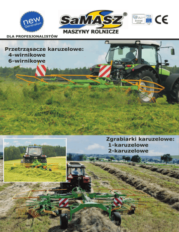 new n ratio Gene MASZYNY ROLNICZE DLA PROFESJONALISTÓW Przetrz¹sacze karuzelowe: 4-wirnikowe 6-wirnikowe Zgrabiarki karuzelowe: 1-karuzelowe 2-karuzelowe Przetrz¹sacze i zgrabiarki karuzelowe MASZYNY ROLNICZE Firma SaMASZ ma ju¿ 26 lat. Poprzez nieustanny rozwój mo¿liwy dziêki pasji, doœwiadczeniu i kompetencji naszych pracowników osi¹gnêliœmy pozycjê lidera w produkcji kosiarek rolniczych w Polsce. Troska o jakoœæ i niezawodnoœæ maszyn, ale tak¿e fachowy i szybki serwis to nasze g³ówne atuty. SaMASZ to dziœ jeden z 10 najwiêkszych producentów kosiarek na œwiecie. Ka¿dy Klient, niezale¿nie czy posiada 10, 50 czy 200 hektarów zawsze znajdzie w naszej ofercie dopasowan¹ do swoich potrzeb kosiarkê. Ale nie spoczywamy na laurach. Od kilku lat rozwijamy równie¿ maszyny pomocne w kolejnych etapach procesu przygotowania paszy: przetrz¹sacze i zgrabiarki karuzelowe. W czasie sianokosów liczy siê ka¿da minuta. W takich sytuacjach solidny partner zapewniaj¹cy szerok¹ gamê maszyn do zbioru zielonki oraz niezawodny serwis jest na wagê z³ota. Wybieraj¹c przetrz¹sacze i zgrabiarki firmy SaMASZ zyskuj¹ Pañstwo nie tylko niezawodnego Partnera, ale równie¿ gwarancjê paszy najwy¿szej jakoœci. 2 Przetrz¹sacze karuzelowe P 4 - 470 - 4,70 m P 4 - 530 - 5,30 m P 6 - 650 - 6,50 m MASZYNY ROLNICZE Oferta przetrz¹saczy zawiera 3 modele maszyn. Oferujemy dwa modele z czterema wirnikami, P 4 - 470 i P 4 - 530, oraz model szeœciowirnikowy - P 6 - 650. Dziêki wysokiej jakoœci wykonania i mocnej konstrukcji, maszyny te s¹ znakomit¹ opcj¹ w przypadku przetrz¹sania skoszonej zielonki. 28 cm Perfekcyjne kopiowanie terenu dziêki przegubom które mog¹ siê poruszaæ w ka¿dym kierunku. Solidna, hermetyczna konstrukcja wszystkich przek³adni przetrz¹sacza pracuj¹cych w oleju zapewnia d³ug¹ ¿ywotnoœæ. Istnieje mo¿liwoœæ ustawienia pracy kó³ bli¿ej palców grabi¹cych - na nierówne tereny, umo¿liwiaj¹ pracê na wiêkszym k¹cie przetrz¹sania - uzyskujemy dziêki temu lepszy efekt pracy. Równomierne rozmieszczenie pokosu dziêki idealnemu nak³adaniu siê pracy wirników. skraj ³¹ki skraj ³¹ki Mo¿liwoœæ skrêtu kó³ w lewo o k¹t 17° stosujemy je¿eli pracujemy na skraju ³¹ki po prawej stronie, natomiast - w prawo, je¿eli skraj ³¹ki jest po lewej stronie. 3 Przetrz¹sacze karuzelowe MASZYNY ROLNICZE Mocny napêd poprzez zastosowanie wa³ków oraz przek³adni i przegubów (pojedynczych lub podwójnych) o du¿ej ¿ywotnoœci. Momenty skrêtu jak równie¿ przyjmowanie obci¹¿eñ przy uderzeniu w przeszkodê, nie stanowi¹ ju¿ ¿adnego problemu. Specjalne zabezpieczenie palca roboczego przed zgubieniem w przypadku pêkniêcia z mo¿liwoœci¹ regulacji k¹ta palców roboczych. Mechanizm stabilizacji w czasie transportu. Po podniesieniu do pozycji transportowej, maszyna automatycznie stabilizowana za ci¹gnikiem Hydrauliczne sk³adanie (rozk³adanie) ramion do (z) pozycji transportowej poprzez zastosowanie cylindrów hydraulicznych. Dane techniczne Szerokoœæ robocza [m] Liczba wirników Liczba ramion wirnika Typ zaczepu (kat.) Obroty WOM (obr/min) Moc ci¹gnika [KM] Podnoszenie hydrauliczne P 4 - 470 4,70 4 6 II 540 30 + P 4 - 530 5,30 4 6 II 540 30 + P 6 - 650 6,50 6 6 II 540 40 + Typ maszyny Przetrz¹sacze: 4 Przetrz¹sacze karuzelowe MASZYNY ROLNICZE Uk³ad zawieszenia wyposa¿ony jest w mechanizm dziêki któremu, przy podnoszeniu maszyna ustawia siê w po³o¿eniu centralnym; Naprê¿enie amortyzatorów stanowi dodatkowe wsparcie. Ochrona przed owijaniem siê pokosu na ko³ach kopiuj¹cych zapewnia p³ynn¹ pracê nawet przy gêstym pokosie. U¿ytkownik dziêki rozbudowanemu systemowi regulacji podwozia mo¿e ustawiæ optymalne parametry kopiowania terenu. Zabezpieczenie - sprzêg³o przeci¹¿eniowe na wale napêdowym - wyposa¿enie standardowe. 2-pozycyjny k¹t natarcia palca: Pozycja 1: Ustawienie standardowe. Pozycja 2: W ciê¿kich warunkach, np. wa³ki pokosu. 1 Mo¿liwoœæ perfekcyjnego przetrz¹sania pokosów o ró¿nej gruboœci dziêki zastosowaniu regulowanego k¹ta rozrzutu. a 2 a wiêkszy = lepsza skutecznoœæ przetrz¹sania Kosiarka 1,80 m Kosiarka 2,20 m Kosiarka 2,60 m Kosiarka 3,00 m P6 - 650 P4 - 530 P4 - 470 D³ugoœæ transportowa [m] Wysokoœæ transportowa [m] K¹t przetrz¹sania Szerokoœæ transportowa [m] Maksymalna prêdkoœæ robocza Opony Masa [kg] 2,10 2,60 10 - 18 ° 3,00 16 km/h 16x6.50 455 2,10 2,70 10 - 18 ° 3,00 16 km/h 16x6.50 585 2,10 3,60 10 - 18 ° 3,00 16 km/h 16x6.50 790 5 Zgrabiarki 1-karuzelowe MASZYNY ROLNICZE Z - 300 - 3,00 m Z - 350 - 3,50 m Z - 410 - 4,10 m Zgrabiarki Z 300, Z 350 i Z 410 s¹ 1-karuzelowymi zgrabiarkami dla gospodarstw mniejszych i œrednich. Maszyny te wystêpuj¹ w szerokoœciach roboczych od 3,00 do 4,10 m. Regularny wa³ek wychodz¹cy ze zgrabiarki, bez skrêceñ trawy, umo¿liwia szybkie dosychanie pokosu i ³atwy zbiór pras¹. Nie ka¿da ³¹ka jest równa i g³adka - aby uzyskaæ równomierny i czysty pokos niezbêdne jest dok³adne kopiowanie terenu. W zgrabiarkach Z - 410 zastosowaliœmy tandemowy uk³ad jezdny, który u³atwia kopiowanie terenu i utrzymanie kierunku jazdy. Dwustronna skuteczna amortyzacja - naprê¿aj¹ce siê sprê¿yny amortyzatorów obustronnie ustawiane, wyposa¿enie seryjne przy Z-410. Podczas podnoszenia maszyny oraz transportu amortyzatory gwarantuj¹ stabilnoœæ maszyny. £atwo demontowalne ramiona, osadzane w uchwytach transportowych oraz podnoszone ekrany zmniejszaj¹ szerokoœæ zgrabiarki w transporcie i podczas magazynowania. Wahliwy zaczep u³atwiaj¹cy pracê na nierównoœciach. Sprê¿yste palce (3 lub 4 na ka¿dym ramieniu - w zale¿noœci od modelu) gwarantuj¹ omijanie napotkanych przeszkód np. kamieni. W opcji ko³o podporowe umo¿liwiaj¹ce lepsze kopiowanie terenu. Dane techniczne Typ maszyny Liczba Szerokoœæ Szerokoœæ ramion robocza transportowa wirnika Liczba palców Obroty WOM (obr/min) Moc ci¹gnika [KM] W