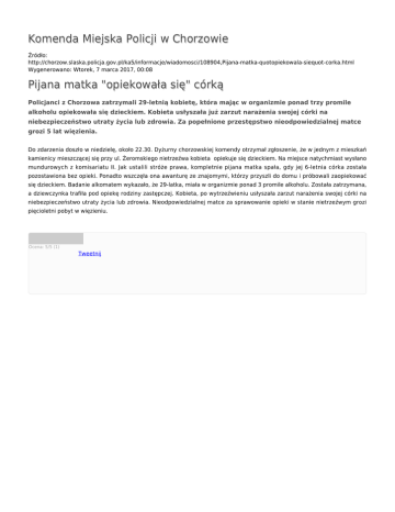 Komenda Miejska Policji w Chorzowie Źródło: http://chorzow.slaska.policja.gov.pl/ka5/informacje/wiadomosci/108904,Pijana-matka-quotopiekowala-siequot-corka.html Wygenerowano: Wtorek, 7 marca 2017, 00:08 Pijana matka "opiekowała się" córką Policjanci z Chorzowa zatrzymali 29-letnią kobietę, która mając w organizmie ponad trzy promile alkoholu opiekowała się dzieckiem. Kobieta usłyszała już zarzut narażenia swojej córki na niebezpieczeństwo utraty życia lub zdrowia. Za popełnione przestępstwo nieodpowiedzialnej matce grozi 5 lat więzienia. Do zdarzenia doszło w niedzielę, około 22.30. Dyżurny chorzowskiej komendy otrzymał zgłoszenie, że w jednym z mieszkań kamienicy mieszczącej się przy ul. Żeromskiego nietrzeźwa kobieta opiekuje się dzieckiem. Na miejsce natychmiast wysłano mundurowych z komisariatu II. Jak ustalili stróże prawa, kompletnie pijana matka spała, gdy jej 6-letnia córka została pozostawiona bez opieki. Ponadto wszczęła ona awanturę ze znajomymi, którzy przyszli do domu i próbowali zaopiekować się dzieckiem. Badanie alkomatem wykazało, że 29-latka, miała w organizmie ponad 3 promile alkoholu. Została zatrzymana, a dziewczynka trafiła pod opiekę rodziny zastępczej. Kobieta, po wytrzeźwieniu usłyszała zarzut narażenia swojej córki na niebezpieczeństwo utraty życia lub zdrowia. Nieodpowiedzialnej matce za sprawowanie opieki w stanie nietrzeźwym grozi pięcioletni pobyt w więzieniu. Ocena: 5/5 (1) Tweetnij
