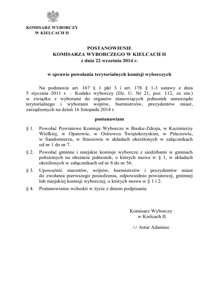 KOMISARZ WYBORCZY W KIELCACH II POSTANOWIENIE KOMISARZA WYBORCZEGO W KIELCACH II z dnia 22 września 2014 r. w sprawie powołania terytorialnych komisji wyborczych Na podstawie art. 167 § 1 pkt 3 i art. 178 § 1-3 ustawy z dnia 5 stycznia 2011 r. – Kodeks wyborczy (Dz. U. Nr 21, poz. 112, ze zm.) w związku z wyborami do organów stanowiących jednostek samorządu terytorialnego i wyborami wójtów, burmistrzów, prezydentów miast, zarządzonych na dzień 16 listopada 2014 r. postanawiam § 1. Powołać Powiatowe Komisje Wyborcze w Busku-Zdroju, w Kazimierzy Wielkiej, w Opatowie, w Ostrowcu Świętokrzyskim, w Pińczowie, w Sandomierzu, w Staszowie w składach określonych w załącznikach od nr 1 do nr 7. § 2. Powołać gminne i miejskie komisje wyborcze z siedzibami w gminach położonych na obszarze jednostek, o których mowa w § 1, w składach określonych w załącznikach od nr 8 do nr 56. § 3. Upoważnić starostów, wójtów, burmistrzów i prezydentów miast do zwołania pierwszego posiedzenia, odpowiednio powiatowej, gminnej lub miejskiej komisji wyborczej, o których mowa w § 1 i 2. § 4. Postanowienie wchodzi w życie z dniem podpisania. Komisarz Wyborczy w Kielcach II /-/ Artur Adamiec Załącznik nr 1 do Postanowienia Komisarz Wyborczy w Kielcach II z dnia 22 września 2014 r. Powiatowa Komisja Wyborcza w Busku-Zdroju Starostwo Powiatowe w Busku-Zdroju, Busko-Zdrój, ul. Mickiewicza 15 skład komisji: 1. Wiesław Łakomy zgłoszenia dokonał: Prezes Sądu Okręgowego w Kielcach 2. Katarzyna Marta Adamczyk - Kulczycka, zam. Busko-Zdrój zgłoszenia dokonał: KWW Razem Dla Powiatu 3. Justyna Bożena Drab, zam. Busko-Zdrój zgłoszenia dokonał: KW Prawo i Sprawiedliwość 4. Anna Maria Januszczyk, zam. Busko-Zdrój zgłoszenia dokonał: KWW Perspektywy Dla Ludzi 5. Joanna Teresa Kaczor, zam. Busko-Zdrój zgłoszenia dokonał: KWW Nasza Gmina - Nasz Wybór 6. Joanna Kowalska, zam. Busko-Zdrój zgłoszenia dokonał: Komitet Wyborczy PSL 7. Elżbieta Ozdoba - Bydłosz, zam. Busko-Zdrój zgłoszenia dokonał: KW Platforma Obywatelska RP 8. Jadwiga Danuta Sokół, zam. Stępichów zgłoszenia dokonał: KW Samoobrona 9. Winicjusz Maciej Zalewski, zam. Busko-Zdrój zgłoszenia dokonał: KW "Porozumienie Samorządowe Busko - Zdrój" Załącznik nr 2 do Postanowienia Komisarz Wyborczy w Kielcach II z dnia 22 września 2014 r. Powiatowa Komisja Wyborcza w Kazimierzy Wielkiej Starostwo Powiatowe w Kazimierzy Wielkiej, Kazimierza Wielka, ul. T. Kościuszki 12 skład komisji: 1. Wiesław Stępniak zgłoszenia dokonał: Prezes Sądu Okręgowego w Kielcach 2. Jarosław Stanisław Galwas, zam. Kazimierza Wielka zgłoszenia dokonał: KWW Twój Samorząd Ziemi Kazimierskiej 3. Małgorzata Konieczna-Cypryś, zam. Kazimierza Wielka zgłoszenia dokonał: Komitet Wyborczy PSL 4. Anna Zofia Maderak, zam. Skorczów zgłoszenia dokonał: KWW Porozumienie Samorządowe 2014 5. Maciej Mariusz Pęski, zam. Kazimierza Wielka zgłoszenia dokonał: KKW SLD Lewica Razem 6. Dorota Płaszewska, zam. Kazimierza Wielka zgłoszenia dokonał: KW Platforma Obywatelska RP 7. Wiesław Józef Sajdak, zam. Skalbmierz zgłoszenia dokonał: KW Samoobrona Załącznik nr 3 do Postanowienia Komisarz Wyborczy w Kielcach II z dnia 22 września 2014 r. Powiatowa Komisja Wyborcza w Opatowie Starostwo Powiatowe w Opatowie, Opatów, ul. Henryka Sienkiewicza 17 skład komisji: 1. Artur Łukawski zgłoszenia dokonał: Prezes Sądu Okręgowego w Kielcach 2. Ewa Zdzisława Ciszewska, zam. Opatów zgłoszenia dokonał: KW Prawo i Sprawiedliwość 3. Monika Anna Gałka, zam. Tomaszów zgłoszenia dokonał: KWW Perspektywy Dla Ludzi 4. Andrzej Józef Janik, zam. Opatów zgłoszenia dokonał: KW Ziemia Świętokrzyska 5. Piotr Kotkowski, zam. Opatów zgłoszenia dokonał: KW Stowarzyszenie Region Świętokrzyski 6. Beata Urszula Lewicka, zam. Opatów zgłoszenia dokonał: KWW Świętokrzyskie Serce Polski 7. Agnieszka Maj, zam. Opatów zgłoszenia dokonał: KW Platforma Obywatelska RP 8. Joanna Szwagierczak, zam. Bidziny zgłoszenia dokonał: Komitet Wyborczy PSL 9. Bożena Utnik, zam. Wszechświęte zgłoszenia dokonał: KWW Rozsądny Wybór Załącznik nr 4 do Postanowienia Komisarz Wyborczy w Kielcach II z dnia 22 września 2014 r. Powiatowa Komisja Wyborcza w Ostrowcu Świętokrzyskim Starostwo Powiatowe w Ostrowcu Świętokrzyskim, Ostrowiec Świętokrzyski, ul. Iłżecka 37 skład komisji: 1. Grzegorz Matuszewski zgłoszenia dokonał: Prezes Sądu Okręgowego w Kielcach 2. Angelika Elżbieta Dąbrowska-Kondratowicz, zam. Ćmielów zgłoszenia dokonał: KW Prawo i Sprawiedliwość 3. Joanna Stanisława Dziubińska, zam. Ostrowiec Świętokrzyski zgłoszenia dokonał: KWW Wspólnota Patriotyzm Solidarność 4. Zbigniew Maciej Dziubiński, zam. Ostrowiec Świętokrzyski zgłoszenia dokonał: KW Oburzeni 5. Beata Aneta Górniak, zam. Ostrowiec Świętokrzyski zgłoszenia dokonał: KW Platforma Obywatelska RP 6. Stanisław Marcin Karbowniczek, zam. Ostrowiec Świętokrzyski zgłoszenia dokonał: KKW SLD Lewica Razem 7. Robert Jerzy Kuzdak, zam. Ostrowiec Świętokrzyski zgłoszenia dokonał: KWW Jarosława Górczyńskiego 8. Andrzej Bogusław Śląszkiewicz, zam. Ostrowiec Świętokrzyski zgłoszenia dokonał: KW TOS Załącznik nr 5 do Postanowienia Komisarz Wyborczy w Kielcach II z dnia 22 września 2014 r. Powiatowa Komisja Wyborcza w Pińczowie Starostwo Powiatowe w Pińczowie, Pińczów, ul. Zacisze 5 skład komisji: 1. Janusz Szumski zgłoszenia dokonał: Prezes Sądu Okręgowego w Kielcach 2. Małgorzata Anna Adamczyk, zam. Pińczów zgłoszenia dokonał: Komitet Wyborczy PSL 3. Szymon Maciej Burek, zam. Marzęcin zgłoszenia dokonał: KW Platforma Obywatelska RP 4. Danuta Maria Dyraga, zam. Górki zgłoszenia dokonał: KW Samoobrona 5. Katarzyna Maria Maj, zam. Pińczów zgłoszenia dokonał: KWW Ziemia Pińczowska 6. Halina Nowak, zam. Pińczów zgłoszenia dokonał: KKW SLD Lewica Razem 7. Henryk Powałek, zam. Pińczó