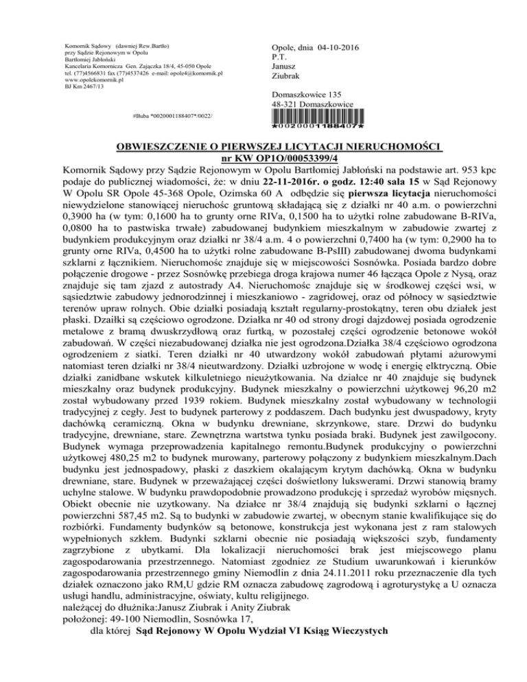 Komornik Sądowy (dawniej Rew.Bartło) przy Sądzie Rejonowym w Opolu Bartłomiej Jabłoński Kancelaria Komornicza Gen. Zajączka 18/4, 45-050 Opole tel. (77)4566831 fax (77)4537426 e-mail: [email protected] www.opolekomornik.pl BJ Km 2467/13 Opole, dnia 04-10-2016 P.T. Janusz Ziubrak Domaszkowice 135 48-321 Domaszkowice #Buba *0020001188407*/0022/ *0020001188407* OBWIESZCZENIE O PIERWSZEJ LICYTACJI NIERUCHOMOŚCI nr KW OP1O/00053399/4 Komornik Sądowy przy Sądzie Rejonowym w Opolu Bartłomiej Jabłoński na podstawie art. 953 kpc podaje do publicznej wiadomości, że: w dniu 22-11-2016r. o godz. 12:40 sala 15 w Sąd Rejonowy W Opolu SR Opole 45-368 Opole, Ozimska 60 A odbędzie się pierwsza licytacja nieruchomości niewydzielone stanowiącej nieruchośc gruntową składającą się z działki nr 40 a.m. o powierzchni 0,3900 ha (w tym: 0,1600 ha to grunty orne RIVa, 0,1500 ha to użytki rolne zabudowane B-RIVa, 0,0800 ha to pastwiska trwałe) zabudowanej budynkiem mieszkalnym w zabudowie zwartej z budynkiem produkcyjnym oraz działki nr 38/4 a.m. 4 o powierzchni 0,7400 ha (w tym: 0,2900 ha to grunty orne RIVa, 0,4500 ha to użytki rolne zabudowane B-PsIII) zabudowanej dwoma budynkami szklarni z łącznikiem. Nieruchomośc znajduje się w miejscowości Sosnówka. Posiada bardzo dobre połączenie drogowe - przez Sosnówkę przebiega droga krajowa numer 46 łącząca Opole z Nysą, oraz znajduje się tam zjazd z autostrady A4. Nieruchomośc znajduje się w środkowej części wsi, w sąsiedztwie zabudowy jednorodzinnej i mieszkaniowo - zagridowej, oraz od północy w sąsiedztwie terenów upraw rolnych. Obie działki posiadają kształt regularny-prostokątny, teren obu działek jest płaski. Dzaiłki są częściowo ogrodzone. Działka nr 40 od strony drogi dajzdowej posiada ogrodzenie metalowe z bramą dwuskrzydłową oraz furtką, w pozostałej części ogrodzenie betonowe wokół zabudowań. W części niezabudowanej działka nie jest ogrodzona.Działka 38/4 częściowo ogrodzona ogrodzeniem z siatki. Teren działki nr 40 utwardzony wokół zabudowań płytami ażurowymi natomiast teren działki nr 38/4 nieutwardzony. Działki uzbrojone w wodę i energię elktryczną. Obie działki zanidbane wskutek kilkuletniego nieużytkowania. Na działce nr 40 znajduje się budynek mieszkalny oraz budynek produkcyjny. Budynek mieszkalny o powierzchni użytkowej 96,20 m2 został wybudowany przed 1939 rokiem. Budynek mieszkalny został wybudowany w technologii tradycyjnej z cegły. Jest to budynek parterowy z poddaszem. Dach budynku jest dwuspadowy, kryty dachówką ceramiczną. Okna w budynku drewniane, skrzynkowe, stare. Drzwi do budynku tradycyjne, drewniane, stare. Zewnętrzna wartstwa tynku posiada braki. Budynek jest zawilgocony. Budynek wymaga przeprowadzenia kapitalnego remontu.Budynek produkcyjny o powierzchni użytkowej 480,25 m2 to budynek murowany, parterowy połączony z budynkiem mieszkalnym.Dach budynku jest jednospadowy, płaski z daszkiem okalającym krytym dachówką. Okna w budynku drewniane, stare. Budynek w przeważającej części doświetlony lukswerami. Drzwi stanowią bramy uchylne stalowe. W budynku prawdopodobnie prowadzono produkcję i sprzedaż wyrobów mięsnych. Obiekt obecnie nie uzytkowany. Na działce nr 38/4 znajdują się budynki szklarni o łącznej powierzchni 587,45 m2. Są to budynki w zabudowie zwartej, w obecnym stanie kwalifikujące się do rozbiórki. Fundamenty budynków są betonowe, konstrukcja jest wykonana jest z ram stalowych wypełnionych szkłem. Budynki szklarni obecnie nie posiadają większości szyb, fundamenty zagrzybione z ubytkami. Dla lokalizacji nieruchomości brak jest miejscowego planu zagospodarowania przestrzennego. Natomiast zgodniez ze Studium uwarunkowań i kierunków zagospodarowania przestrzennego gminy Niemodlin z dnia 24.11.2011 roku przeznaczenie dla tych działek oznaczono jako RM,U gdzie RM oznacza zabudowę zagrodową i agroturystykę a U oznacza usługi handlu, administracyjne, oświaty, kultu religijnego. należącej do dłużnika:Janusz Ziubrak i Anity Ziubrak położonej: 49-100 Niemodlin, Sosnówka 17, dla której Sąd Rejonowy W Opolu Wydział VI Ksiąg Wieczystych prowadzi księgę wieczystą o numerze KW OP1O/00053399/4 Suma oszacowania wynosi 288 000,00zł, zaś cena wywołania jest równa 3/4 sumy oszacowania i wynosi 216 000,00zł. Licytant przystępujący do przetargu powinien złożyć rękojmię w wysokości jednej dziesiątej sumy oszacowania, to jest 28 800,00zł. Rękojmię można uiścić: - w kancelarii Komornika w Opole 45-050, ul. Gen. Zajączka 18/4 najpóźniej do godz. 15.00 dnia roboczego poprzedzającego licytację (do 21-11-2016 r.), - lub na konto komornika najpóżniej do dnia 21-11-2016 r. na konto: Powszechna Kasa Oszczędności Bank Polski SA I O. Centrum w Opolu 53 10203668 0000 5002 0093 0313 z dopiskiem "wadium na licytację" Zgodnie z przepisem art.976 §1 kpc w przetargu nie mogą uczestniczyć osoby, które mogą nabyć nieruchomość tylko za zezwoleniem organu państwowego, a zezwolenia tego nie przedstawiły oraz inne osoby wymienione w tym artykule.W ciągu dwóch ostatnich tygodni przed licytacją wolno oglądać nieruchomość w dni powszednie oraz przeglądać w Sądzie Rejonowym w Opolu przy Ozimska 60 A pok. 116 odpis protokołu oszacowania nieruchomości, operat szacunkowy biegłego sądowego, wypis z rejestru gruntów wraz z mapką z akt postępowania egzekucyjnego. Prawa osób trzecich nie będą przeszkodą do licytacji i przysądzenia własności na rzecz nabywcy bez zastrzeżeń, jeżeli osoby te przed rozpoczęciem przetargu nie złożą dowodu, że wniosły powództwo o zwolnienie nieruchomości lub przedmiotów razem z nią zajętych od egzekucji i uzyskały w tym zakresie orzeczenie wstrzymujące egzekucję. Użytkowanie, służebności i prawa dożywotnika, jeżeli nie są ujawnione w księdze wieczystej lub przez złożenie dokumentu do zbioru dokumentów i nie zos