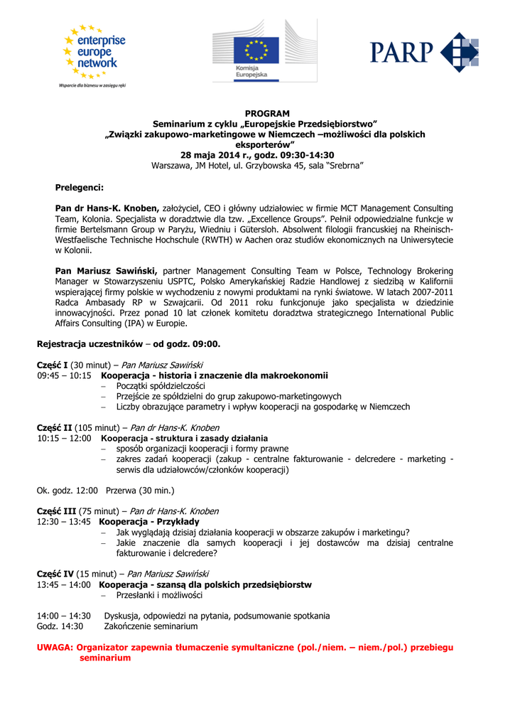 PROGRAM Seminarium z cyklu „Europejskie Przedsiębiorstwo” „Związki zakupowo-marketingowe w Niemczech –możliwości dla polskich eksporterów” 28 maja 2014 r., godz. 09:30-14:30 Warszawa, JM Hotel, ul. Grzybowska 45, sala “Srebrna” Prelegenci: Pan dr Hans-K. Knoben, założyciel, CEO i główny udziałowiec w firmie MCT Management Consulting Team, Kolonia. Specjalista w doradztwie dla tzw. „Excellence Groups”. Pełnił odpowiedzialne funkcje w firmie Bertelsmann Group w Paryżu, Wiedniu i Gütersloh. Absolwent filologii francuskiej na RheinischWestfaelische Technische Hochschule (RWTH) w Aachen oraz studiów ekonomicznych na Uniwersytecie w Kolonii. Pan Mariusz Sawiński, partner Management Consulting Team w Polsce, Technology Brokering Manager w Stowarzyszeniu USPTC, Polsko Amerykańskiej Radzie Handlowej z siedzibą w Kalifornii wspierającej firmy polskie w wychodzeniu z nowymi produktami na rynki światowe. W latach 2007-2011 Radca Ambasady RP w Szwajcarii. Od 2011 roku funkcjonuje jako specjalista w dziedzinie innowacyjności. Przez ponad 10 lat członek komitetu doradztwa strategicznego International Public Affairs Consulting (IPA) w Europie. Rejestracja uczestników – od godz. 09:00. Część I (30 minut) – Pan Mariusz Sawiński 09:45 – 10:15 Kooperacja - historia i znaczenie dla makroekonomii Początki spółdzielczości Przejście ze spółdzielni do grup zakupowo-marketingowych Liczby obrazujące parametry i wpływ kooperacji na gospodarkę w Niemczech Część II (105 minut) – Pan dr Hans-K. Knoben 10:15 – 12:00 Kooperacja - struktura i zasady działania sposób organizacji kooperacji i formy prawne zakres zadań kooperacji (zakup - centralne fakturowanie - delcredere - marketing serwis dla udziałowców/członków kooperacji) Ok. godz. 12:00 Przerwa (30 min.) Część III (75 minut) – Pan dr Hans-K. Knoben 12:30 – 13:45 Kooperacja - Przykłady Jak wyglądają dzisiaj działania kooperacji w obszarze zakupów i marketingu? Jakie znaczenie dla samych kooperacji i jej dostawców ma dzisiaj centralne fakturowanie i delcredere? Część IV (15 minut) – Pan Mariusz Sawiński 13:45 – 14:00 Kooperacja - szansą dla polskich przedsiębiorstw Przesłanki i możliwości 14:00 – 14:30 Godz. 14:30 Dyskusja, odpowiedzi na pytania, podsumowanie spotkania Zakończenie seminarium UWAGA: Organizator zapewnia tłumaczenie symultaniczne (pol./niem. – niem./pol.) przebiegu seminarium