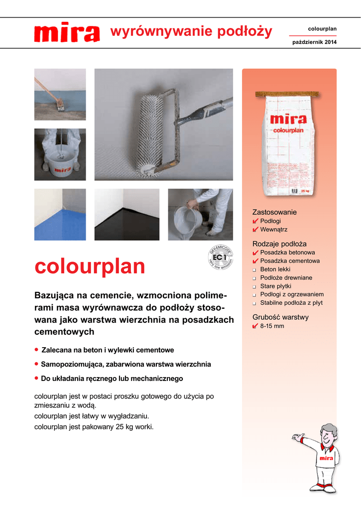 wyrównywanie podłoży colourplan październik 2014 Zastosowanie ■ Podłogi ✔ ■ Wewnątrz ✔ colourplan Bazująca na cemencie, wzmocniona polimerami masa wyrównawcza do podłoży stosowana jako warstwa wierzchnia na posadzkach cementowych • Zalecana na beton i wylewki cementowe • Samopoziomująca, zabarwiona warstwa wierzchnia • Do układania ręcznego lub mechanicznego colourplan jest w postaci proszku gotowego do użycia po zmieszaniu z wodą. colourplan jest łatwy w wygładzaniu. colourplan jest pakowany 25 kg worki. Rodzaje podłoża ■Posadzka betonowa ✔ ■ ✔ Posadzka cementowa ■ Beton lekki ■ Podłoże drewniane ■ Stare płytki ■ Podłogi z ogrzewaniem ■ Stabilne podłoża z płyt Grubość warstwy ■8-15 mm ✔ wyrównywanie podłoży colourplan październik 2014 Opis produktu Wykonanie Bazująca na cemencie, wzmocniona polimerami, barwiona masa do wyrównywania i wykańczania podłoży. 25 kg proszku wymieszać z 5,7-6,1 litra czystej wody. Mieszać mieszadłem do kleju lub w mieszalniku pompy przez min. 2 minuty do uzyskania jednolitej masy. Temperatura wody i proszku powinna być zbliżona. Dane techniczne Właściwości EN 13813: CT C30F6 Rozpływalność: 125-140 mm 0,030 % ≤ Skurcz: Ogniodporność: A1 ścieralność wg. EN13892: RWA100 Czas przydatności do użycia: Czas otwarty: 15-20 min. 30 min. Czas schnięcia w temp. 18°C do lekkiego ruchu: do dalszego wykańczania nawierzchni: 2 godz. 24-30 godz. Zalecana temperatura pracy: 10-20°C Grubość warstwy: 8-15 mm Zużycie (gęstość): 1,6 kg/m2/mm grubości warstwy Zastosowanie Jako końcowa, barwna warstwa wierzchnia na podłogach biur i sklepów, w przemyśle lekkim (np. hale montażowe) itp. Typy podłoży Przy mechanicznym układaniu masy należy użyć pompy wyposażonej w zasobnik z mieszadłem. Należy przestrzegać właściwego czasu mieszania, jako że masa zawiera duże ilości pigmentów i dodatków. Rozpływalność można skontrolować wykonując "flow test". W tym celu pierścień probierczy postawić na płaskiej powierzchni i wypełnić go do górnej krawędzi masą. Następnie unieść go tak, aby masa samoczynnie wypłynęła. Kiedy cała masa wypłynie zmierzyć jej średnicę - patrz dane techniczne. Masa samoczynnie rozlewa się, tylko w narożnikach trzeba ją rozprowadzić i wygładzić pacą. Aby uzyskać jednolitą, równą nawierzchnię należy całą ułożoną powierzchnię wyrównać wałkiem kolczastym wykańczając na bieżąco szeroką, stalową pacą/łatą. Masa nadaje się do obróbki przez 30 min od wymieszania, lekki ruch pieszy można dopuścić po ok. 2 godz. Po 24-30 godz. od ułożenia, ale jeszcze przed rozpoczęciem eksploatacji zaleca się pokryć nawierzchnię masy bezbarwnym lakierem lub woskiem, kontrolując uprzednio pozostałą wilgotność względną. Podłoże musi być mocne i zwarte, z betonu, cementu itp. Miejsca słabe i porowate należy wybić a ubytki i nierówności naprawić i wyrównać używając mira 6998 betomix quick/x-plan. Aby uzyskać możliwie najbardziej jednolitą powierzchnię ułożonej masy colourplan, nierówności w podłożu nie mogą przekroczyć 10 mm. Większe nierówności można ewentualnie wyrównać warstwą x-plan i po 24 godz. ułożyć colourplan. Warunki higieny pracy Przygotowanie podłoża 25 kg worki papierowe, wzmocnione folią. Podłoże musi być nośne, stabilne i zwarte, oczyszczone z kurzu, tłuszczu i cementowego szlamu. Ewentualny szlam cementowy zeszlifować a słabe części podłoża betonowego wybić i naprawić. Powierzchnię dokładnie odkurzyć. Olej i tłuszcz zmyć środkiem mira 7110 base cleaner, wodą pod wysokim ciśnieniem lub innym skutecznym sposobem. Gruntowanie Podłoże zagruntować używając roztworu 1 części środka 4180 primer rozcieńczonego 3 częściami wody. Roztwór rozprowadzić po podłożu szczotką dobrze go wcierając. Produkt zawiera cement. Należy zachować środki ostrożności dotyczące cementu. colourplan ma 12-sto miesięczną gwarancję neutralizacji chromu (VI). Dalsze informacje - patrz Karta Charakterystyki. Opakowanie Przechowywanie i transport Przechowywać i transportować w warunkach suchych. W oryginalnym i nieuszkodzonym opakowaniu można magazynować min. 6 miesięcy od daty produkcji. Po upływie tego czasu produkt nadaje się do użytku ale jego właściwości techniczne mogą ulec zmianie- np. wydłuży się czas wiązania. Sprzedaż Produkty mira sprzedawane są przez wybrane salony płytek i hurtownie budowlane. Mira Polska Sp. z o.o • ul. Boczna 8 44-240 żory • Tel. +48 32756 0031 www.mira.pl • www.mira.eu.com DK