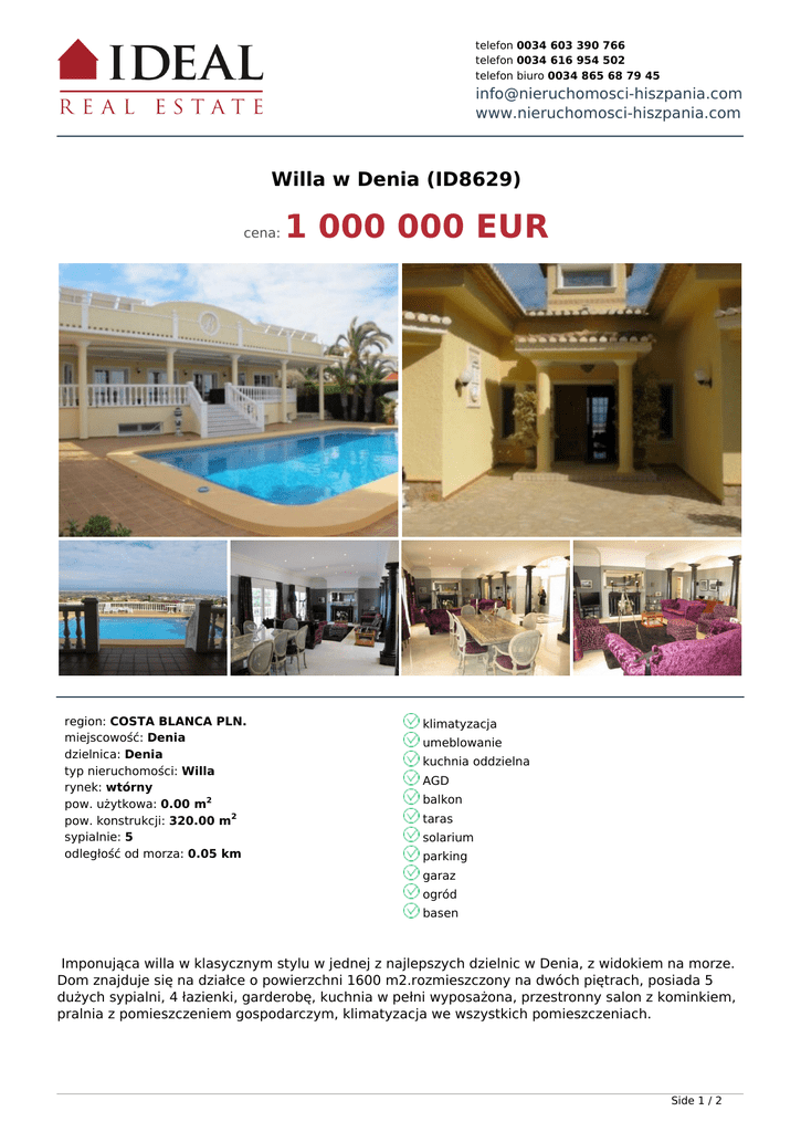 telefon 0034 603 390 766 telefon 0034 616 954 502 telefon biuro 0034 865 68 79 45 [email protected] www.nieruchomosci-hiszpania.com Willa w Denia (ID8629) cena: region: COSTA BLANCA PLN. miejscowość: Denia dzielnica: Denia typ nieruchomości: Willa rynek: wtórny pow. użytkowa: 0.00 m2 pow. konstrukcji: 320.00 m2 sypialnie: 5 odległość od morza: 0.05 km 1 000 000 EUR klimatyzacja umeblowanie kuchnia oddzielna AGD balkon taras solarium parking garaz ogród basen Imponująca willa w klasycznym stylu w jednej z najlepszych dzielnic w Denia, z widokiem na morze. Dom znajduje się na działce o powierzchni 1600 m2.rozmieszczony na dwóch piętrach, posiada 5 dużych sypialni, 4 łazienki, garderobę, kuchnia w pełni wyposażona, przestronny salon z kominkiem, pralnia z pomieszczeniem gospodarczym, klimatyzacja we wszystkich pomieszczeniach. Side 1 / 2 Na terenie posesji znajduje się prywatny basen i ogród z automatycznym nawadnianiem z fascynujacymi widokami na morze. www.nieruchomosci-hiszpania.com Side 2 / 2 Powered by TCPDF (www.tcpdf.org)