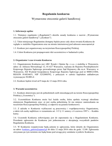 Regulamin konkursu Wymarzone otoczenie galerii handlowej 1. Informacje ogólne 1.1. Niniejszy regulamin („Regulamin”) określa zasady konkursu o nazwie „Wymarzone otoczenie galerii handlowej” („Konkurs”). 1.2. Tekst niniejszego Regulaminu dostępny będzie przez cały okres trwania Konkursu do wglądu w siedzibie Organizatora oraz na stronie internetowej pod adresem www.epanel.pl 1.3. Konkurs jest organizowany na terytorium Rzeczypospolitej Polskiej. 1.4. Celem Konkursu jest propagowanie idei uczestnictwa w badaniach rynku. 2. Organizator i czas trwania Konkursu 2.1. Organizatorem Konkursu jest ARC Rynek i Opinia Sp. z o.o. z siedzibą w Warszawie, adres: ul. Juliusza Słowackiego 12, 01-627 Warszawa, wpisana do Rejestru Przedsiębiorców Krajowego Rejestru Sądowego prowadzonego przez Sąd Rejonowy dla m.st. Warszawy w Warszawie, XII Wydział Gospodarczy Krajowego Rejestru Sądowego pod nr 0000121884, REGON 014834651, NIP 5252088592, z pokrytym w całości kapitałem zakładowym wynoszącym 50.000 zł . 2.2. Konkurs będzie trwał od 9 maja do 12 maja 2016 roku. 3. Warunki uczestnictwa 3.1. Konkurs skierowany jest do pełnoletnich osób mieszkających na terenie Rzeczypospolitej Polskiej („Uczestnicy”). 3.2. Uczestnikiem Konkursu może być każda osoba, która spełnia wymogi określone niniejszym Regulaminem oraz: a) jest osobą pełnoletnią, b) ma miejsce zamieszkania na terytorium Rzeczypospolitej Polskiej; c) odpowie na pytanie konkursowe. 3.3. Z udziału w Konkursie wykluczeni są pracownicy i współpracownicy Organizatora, a także ich osoby najbliższe w rozumieniu art. 115 § 11 ustawy z 6 czerwca 1997 r. - Kodeks karny. 3.4. Uczestnik Konkursu zobowiązany jest do zapoznania się z Regulaminem Konkursu. Przesłanie zgłoszenia do Konkursu jest jednoznaczne z akceptacją wszystkich punktów Regulaminu Konkursu. 3.5. W Konkursie rozpatrywane będą jedynie te zgłoszenia, które dotarły do Organizatora na adres: [email protected] do dnia 12 maja 2016 roku do godz. 12.00. Zgłoszenia otrzymane po tym terminie nie będą brane pod uwagę przy ustalaniu wyników Konkursu. 3.6. Udział w Konkursie jest bezpłatny i całkowicie dobrowolny. 3.7. Niniejszy Konkurs nie jest grą hazardową w rozumieniu ustawy z dnia 19 listopada 2009 r. o grach hazardowych (Dz. U. 2009, nr 201, poz. 1540, z późn. zm.). 4. Zasady Konkursu 4.1. Przedmiotem Konkursu jest wyłonienie spośród Uczestników laureata („Laureat”), który zaproponuje najciekawszą Odpowiedź na Pytanie Konkursowe. 4.4. Konkurs przebiega według ustalonego niżej harmonogramu: 4.4.1. Aby wziąć udział w Konkursie należy w terminie trwania Konkursu przesłać na adres [email protected] odpowiedź na pytanie konkursowe. 4.4.2. Udział w Konkursie jest możliwy od 9 maja do 12 maja 2016 r. do godz. 12.00. 4.4.3. Następnie Komisja Konkursowa, składająca się z Magdaleny Felczak – PR Managera ARC Rynek i Opinia, Krzysztofa Szczerbacza – Kierownika Zespołu w ARC Rynek i Opinia Sp. z o.o. oraz Katarzyny Knothe – Badacza ARC Rynek i Opinia, wyłoni ze zgłoszonych Odpowiedzi najlepsze, którego autorzy otrzymają nagrody. 4.5. Uczestnik może wziąć udział w Konkursie tylko raz. 4.6. Komisja Konkursowa powołana przez Organizatora Konkursu, w terminie od 12 maja do 18 maja 2016 roku wyłoni Laureata, biorąc pod uwagę następujące kryteria: a. kreatywność autora, b. oryginalność Odpowiedzi, c. związek Odpowiedzi z tematyką Konkursu. 4.7. Zgłoszona przez Uczestnika Odpowiedź nie może w żaden sposób naruszać prawa, w szczególności zawierać treści powszechnie uznawanych za wulgarne i obraźliwe, a ponadto musi czynić zadość warunkom, o których mowa w ust. 5 niniejszego Regulaminu. 4.8. W Konkursie przyznane zostaną następujące nagrody („Nagroda”): a. Nagroda 1 – 100 złotych b. Dwa wyróżnienia, każde po 50 zł Fundatorem nagród jest ARC Rynek i Opinia Sp. z o.o. 4.9. Laureat zostanie poinformowany, w terminie 5 dni od daty rozstrzygnięcia Konkursu o wygranej poprzez wiadomość e-mail na zarejestrowany w epanel.pl adres e-mail. 4.10. Nagroda zostanie przekazana na koszt Organizatora w terminie 15 dni od daty dostarczenia przez Laureata numeru konta bankowego, na który należy przekazać nagrodę. 4.11. Laureat ma prawo odmowy przyjęcia Nagrody, w takim przypadku Nagroda zostaje przyznana osobie o miejscu niższym, z kolei Nagroda osoby z niższego miejsca zostaje przekazana miejsce niżej itd. 4.12. Brak kontaktu z Laureatem lub błędnie podane przez niego dane teleadresowe lub numer konta bankowego są jednoznaczne z odmową przyjęcia Nagrody. 4.13. Nagroda nie podlega wymianie na jakikolwiek ekwiwalent, chyba że Organizator postanowi inaczej. 4.15. Organizator będzie informować o wynikach Konkursu, posługując się imieniem i nazwiskiem Laureata, na co Uczestnik, biorąc udział w Konkursie, wyraża zgodę. 5. Prawa autorskie 5.1. Uczestnik Konkursu poprzez wysłanie formularza zgłoszeniowego oświadcza, iż: a) przysługują mu wyłączne i nieograniczone prawa autorskie do nadesłanej Odpowiedzi oraz że Uczestnik przyjmuje na siebie odpowiedzialność wobec Organizatora za wady prawne zgłoszonej Odpowiedzi, a w szczególności odpowiedzialność za ewentualne roszczenia związane z naruszeniem praw autorskich lub innych praw, kierowane przeciwko Organizatorowi przez osoby trzecie; b) nie mają i nie będą miały miejsca jakiekolwiek inne okoliczności, które mogłyby narazić Organizatora na odpowiedzialność, w tym szkodę w związku z korzystaniem, w tym rozpowszechnianiem Odpowiedzi; c) zgadza się na to, że nie przysługuje mu wynagrodzenie w żadnym przypadku korzystania z Odpowiedzi lub rozporządzania prawami do Odpowiedzi. 5.2. Przystępując do Konkursu, Uczestnik udziela Organizatorowi nieodpłatnie zezwolenia (licencji) na korzystanie ze zgłoszonej przez siebie Odpowiedzi oraz wykonywania praw zależnych do niego, na wszelkich polach 