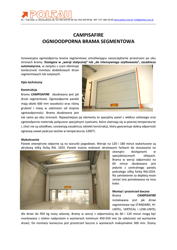 91 – 518 Łódź, ul. Wycieczkowa 26, Tel. 042 659 95 99, fax. 042 659 99 60, NIP: 727–186–56-90 www.poltau.com.pl; [email protected] CAMPISAFIRE OGNIOODPORNA BRAMA SEGMENTOWA Innowacyjna ognioodporna brama segmentowa umożliwiająca zaoszczędzenie przestrzeni po obu stronach bramy. Dostępna w „wersji statycznej” lub „do intensywnego użytkowania”, zasadniczo automatyczna, w związku z czym eliminuje koniecznośd montażu dodatkowych drzwi segmentowych lub zwijanych. Opis techniczny Konstrukcja Brama CAMPISAFIRE zbudowana jest jak drzwi segmentowe. Ognioodporne panele mają około 600 mm wysokości oraz różną grubośd i masę w zależności od stopnia ognioodporności. Brama zbudowana jest tak samo po obu stronach. Najważniejsze jej elementy to specjalny panel z włókna szklanego oraz ognioodporne materiały połączone specjalnymi żywicami, które ulatniają się w pewnej temperaturze i, chod nie są szkodliwe, zostawiają zasadniczy szkielet konstrukcji, który gwarantuje dobrą odpornośd ogniową nawet podczas testów w temperaturze 1200°C. Wykooczenie Panele zewnętrzne odporne są na warunki pogodowe. Wersje na 120 i 180 minut wykooczone są akrylową żółtą farbą RAL 1024. Panele można malowad akrylowymi farbami do stosowania na zewnątrz dostępnymi w specjalistycznych sklepach. Brama w wersji odporności na 60 minut zbudowana jest jedynie z centralnego panelu pokrytego żółtą farbą RAL1024. Na zamówienie za dopłatą może zostad ona pomalowana na inny kolor. Montaż i przestrzeo boczna Brama CAMPISAFIRE instalowana jest jak drzwi segmentowe typ STANDARD, HILINTEL, VERTICAL i LOW-LINTEL dla drzwi do 950 kg masy własnej. Bramy w wersji z odpornością do 60 i 120 minut mogą byd montowane z niskim nadprożem o wymiarach minimum 450-550 mm (w zależności od wymiarów drzwi). Do montażu konieczna jest przestrzeo boczna o wymiarach maksymalnie 300 mm. Ściany 91 – 518 Łódź, ul. Wycieczkowa 26, Tel. 042 659 95 99, fax. 042 659 99 60, NIP: 727–186–56-90 www.poltau.com.pl; [email protected] muszą byd proste i wypoziomowane względem nadproża. Przestrzeo konieczna do montażu wskazana jest w specyfikacjach technicznych. Otwieranie Brama CAMPISAFIRE dostarczana jest jedynie z zasilaniem hydraulicznym Fidelity, który gwarantuje znakomite działanie, nie wymaga wielu zabiegów konserwacyjnych i odpowiada surowym zasadom stosowanym w budowie bram ognioodpornych. Podnoszenie bramy odbywa się przy pomocy zasilania, zamykanie poprzez grawitację. Dostępne są dwie wersje: do statycznego użytkowania: drzwi podnoszone są siłownikiem pneumohydraulicznym. Wymagane jest sprężone powietrze 8 bar (co można zapewnid przy pomocy małej przenośnej sprężarki) do intensywnego użytkowania: drzwi podnoszone są konsolą 400 V trójfazową. System doskonały dla garaży, szczególnie podziemnych. Dostępna jest opcja awaryjna na prąd stały 12 V działająca również przy braku zasilania głównego. Komponenty Brama CAMPISAFIRE składa się z: Drzwi segmentowych - panele, prowadnice, zabezpieczenia boczne i akcesoria do montażu. Hydraulicznego systemu zasilania Fidelity, gwarancja 5-letnia (konieczne jest podpisanie umowy na kontrole i czynności konserwacyjne) – mamy doświadczenie w postaci 35.000 zamontowanych sztuk, które potwierdzają, że potrzebne są jedynie nieliczne czynności konserwacyjne. Konsoli elektrohydraulicznej FIRE do zasilania bramy i zlecania zadao FIRE idealnej do intensywnego użytkowania. Siłownika pneumohydraulicznego do statycznego użytkowania . Obowiązkowe ustawienia trybu pracy Brama ognioodporna charakteryzuje się następującymi ustawieniami: automatyczne zamykanie po alarmie i przerwie w dostawie prądu z prędkością około 0,08 m/s w przypadku napotkania przeszkody podczas zamykania brama zatrzymuje się do momentu wyczerpania energii w baterii zapasowej, również w przypadku przerwie w dostawie energii; po usunięciu przeszkody kontynuuje zamykanie z prędkością około 0,08 m/s kiedy brama jest zamknięta, zachowuje właściwości ognioodporne po obu stronach na czas odpowiadający klasie ognioodporności zatwierdzonej w testach 91 – 518 Łódź, ul. Wycieczkowa 26, Tel. 042 659 95 99, fax. 042 659 99 60, NIP: 727–186–56-90 www.poltau.com.pl; [email protected] Możliwości bramy CAMPISAFIRE Brama wyposażona jest w następujące możliwości: automatyczne zamykanie po alarmie i po przerwie w dostawie prądu z prędkością około 0,08 m/s zatrzymanie bez fizycznego kontaktu w przypadku napotkania przeszkody (system opatentowany) lub poprzez fotokomórki, również w przypadku w przerwy w dostawie prądu; kontynuacja zamykania z prędkością około 0,08 m/s po usunięciu przeszkody lub po wyczerpaniu się baterii zapasowej alarm dźwiękowy w przypadku napotkania przeszkody przez zamykającą się bramę (z opcją powtarzanego alarmu w innej lokalizacji). System stałego sprawdzania, czy otwór drzwiowy wolny jest od przeszkód (wymagany wielopunktowy montaż fotokomórek) tryb standardowego i intensywnego użytkowania, automatyczny, z konsolą FIRE podnosząca drzwi z prędkością około 0,18 m/s (0,09 dla drzwi o masie powyżej 950 kg). Możliwe zwiększenie prędkości otwierania. Normalna prędkośd zamykania około 0,18 m/s, zamykanie FIRE z prędkością 0,08 m/s. opcja na wypadek przerwy w zasilaniu, która umożliwia działanie również przy braku głównego zasilania z konsolą 12 V prądu stałego i jednostką zasilającą z dwoma bateriami i elektroniczną kontrolą mocy, która podłączona jest do stałego zasilania. Od momentu przerwy w zasilaniu przy naładowanych bateriach gwarantujemy wykonanie 40 operacji. opcjonalny system przeciwwybuchowy po mniejszych kosztach z powodu techniki montażu konsoli w strefie nie chronionej przed wybuchem. Ognioodporność: Brama dostępna jest w różnych klasach EN 1634-1. Klasa EN 1634-1 E EI1 EI2 60 60 60 120 120 120 180 180 180 Odpornośd 