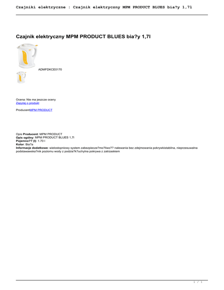 Czajniki elektryczne : Czajnik elektryczny MPM PRODUCT BLUES bia?y 1,7l Czajnik elektryczny MPM PRODUCT BLUES bia?y 1,7l ADMFDKCE0170 Ocena: Nie ma jeszcze oceny Zapytaj o produkt ProducentMPM PRODUCT Opis Producent: MPM PRODUCT Opis ogólny: MPM PRODUCT BLUES 1,7l Pojemno?? (l): 1.70 l Kolor: Bia?a Informacje dodatkowe: wielostopniowy system zabezpiecze?mo?liwo?? nalewania bez zdejmowania pokrywkistabilna, nieprzesuwalna podstawawska?nik poziomu wody z podzia?k?uchylna pokrywa z zatrzaskiem 1 / 1 Powered by TCPDF (www.tcpdf.org)