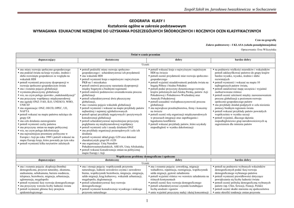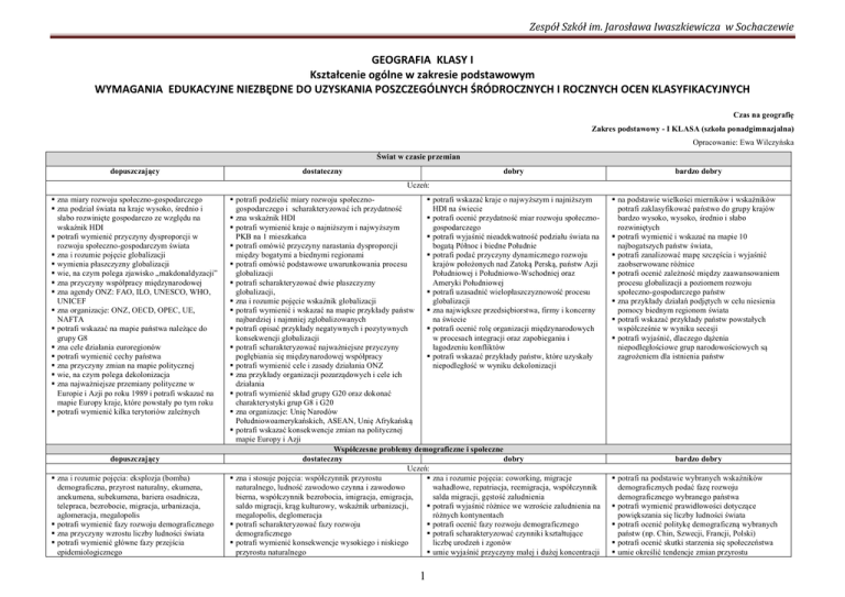 Zespół Szkół im Jarosława Iwaszkiewicza w Sochaczewie GEOGRAFIA KLASY I K WYMAGANIA EDUKACYJNE NIEZBĘDNE DO UZYSKANIA POSZCZEGÓLNYCH ŚRÓDROCZNYCH I ROCZNYCH OCEN KLASYFIKACYJNYCH Czas na geografi Zakres podstawowy - I KLASA (szkoła ponadgimnazjalna) OpracowanieŚ Ewa Wilczy ska wiat w czasie przemian dopuszczaj cy dostateczny dobry bardzo dobry Ucze Ś zna miary rozwoju społeczno-gospodarczego zna podział wiata na kraje wysoko, rednio i słabo rozwini te gospodarczo ze wzgl du na wska nik HDI potrafi wymienić przyczyny dysproporcji w rozwoju społeczno-gospodarczym wiata zna i rozumie poj cie globalizacji wymienia płaszczyzny globalizacji wie, na czym polega zjawisko „makdonaldyzacji” zna przyczyny współpracy mi dzynarodowej zna agendy ONZ: FAO, ILO, UNESCO, WHO, UNICEF zna organizacje: ONZ, OECD, OPEC, UE, NAFTA potrafi wskazać na mapie pa stwa nale ce do grupy G8 zna cele działania euroregionów potrafi wymienić cechy pa stwa zna przyczyny zmian na mapie politycznej wie, na czym polega dekolonizacja zna najwa niejsze przemiany polityczne w Europie i Azji po roku 1989 i potrafi wskazać na mapie Europy kraje, które powstały po tym roku potrafi wymienić kilka terytoriów zale nych dopuszczaj cy zna i rozumie poj ciaŚ eksplozja (bomba) demograficzna, przyrost naturalny, ekumena, anekumena, subekumena, bariera osadnicza, telepraca, bezrobocie, migracja, urbanizacja, aglomeracja, megalopolis potrafi wymienić fazy rozwoju demograficznego zna przyczyny wzrostu liczby ludno ci wiata potrafi wymienić główne fazy przej cia epidemiologicznego potrafi podzielić miary rozwoju społeczno potrafi wskazać kraje o najwy szym i najni szym gospodarczego i scharakteryzować ich przydatno ć HDI na wiecie zna wska nik HDI potrafi ocenić przydatno ć miar rozwoju społeczno potrafi wymienić kraje o najni szym i najwy szym gospodarczego PKB na 1 mieszka ca potrafi wyja nić nieadekwatno ć podziału wiata na potrafi omówić przyczyny narastania dysproporcji bogat Północ i biedne Południe mi dzy bogatymi a biednymi regionami potrafi podać przyczyny dynamicznego rozwoju potrafi omówić podstawowe uwarunkowania procesu krajów poło onych nad Zatok Persk , pa stw Azji globalizacji Południowej i Południowo-Wschodniej oraz potrafi scharakteryzować dwie płaszczyzny Ameryki Południowej globalizacji, potrafi uzasadnić wielopłaszczyznowo ć procesu zna i rozumie poj cie wska nik globalizacji globalizacji potrafi wymienić i wskazać na mapie przykłady pa stw zna najwi ksze przedsi biorstwa, firmy i koncerny najbardziej i najmniej zglobalizowanych na wiecie potrafi opisać przykłady negatywnych i pozytywnych potrafi ocenić rol organizacji mi dzynarodowych konsekwencji globalizacji w procesach integracji oraz zapobieganiu i potrafi scharakteryzować najwa niejsze przyczyny łagodzeniu konfliktów pogł biania si mi dzynarodowej współpracy potrafi wskazać przykłady pa stw, które uzyskały potrafi wymienić cele i zasady działania ONZ niepodległo ć w wyniku dekolonizacji zna przykłady organizacji pozarz dowych i cele ich działania potrafi wymienić skład grupy G20 oraz dokonać charakterystyki grup G8 i G20 zna organizacjeŚ Uni Narodów Południowoameryka skich, ASEAN, Uni Afryka sk potrafi wskazać konsekwencje zmian na politycznej mapie Europy i Azji Współczesne problemy demograficzne i społeczne dostateczny dobry Ucze Ś zna i stosuje poj ciaŚ współczynnik przyrostu zna i rozumie poj ciaŚ coworking, migracje naturalnego, ludno ć zawodowo czynna i zawodowo wahadłowe, repatriacja, reemigracja, współczynnik bierna, współczynnik bezrobocia, imigracja, emigracja, salda migracji, g sto ć zaludnienia saldo migracji, kr g kulturowy, wska nik urbanizacji, potrafi wyja nić ró nice we wzro cie zaludnienia na megalopolis, deglomeracja ró nych kontynentach potrafi scharakteryzować fazy rozwoju potrafi ocenić fazy rozwoju demograficznego demograficznego potrafi scharakteryzować czynniki kształtuj ce potrafi wymienić konsekwencje wysokiego i niskiego liczb urodze i zgonów przyrostu naturalnego umie wyja nić przyczyny małej i du ej koncentracji 1 na podstawie wielko ci mierników i wska ników potrafi zaklasyfikować pa stwo do grupy krajów bardzo wysoko, wysoko, rednio i słabo rozwini tych potrafi wymienić i wskazać na mapie 10 najbogatszych pa stw wiata, potrafi zanalizować map szcz cia i wyja nić zaobserwowane ró nice potrafi ocenić zale no ć mi dzy zaawansowaniem procesu globalizacji a poziomem rozwoju społeczno-gospodarczego pa stw zna przykłady działa podj tych w celu niesienia pomocy biednym regionom wiata potrafi wskazać przykłady pa stw powstałych współcze nie w wyniku secesji potrafi wyja nić, dlaczego d enia niepodległo ciowe grup narodowo ciowych s zagro eniem dla istnienia pa stw bardzo dobry potrafi na podstawie wybranych wska ników demograficznych podać faz rozwoju demograficznego wybranego pa stwa potrafi wymienić prawidłowo ci dotycz ce powi kszania si liczby ludno ci wiata potrafi ocenić polityk demograficzn wybranych pa stw (np. Chin, Szwecji, Francji, Polski) potrafi ocenić skutki starzenia si społecze stwa umie okre lić tendencje zmian przyrostu Zespół Szkół im Jarosława Iwaszkiewicza w Sochaczewie potrafi wskazać na mapie obszary o najwi kszym i najmniejszym zaludnieniu potrafi wymienić przyczyny du ej koncentracji ludno ci potrafi wymienić bariery osadnicze potrafi wymienić sektory działalno ci gospodarczej zna przyczyny bezrobocia w krajach wysoko i słabo rozwini tych wymienia przyczyny migracji potrafi wskazać na mapie główne kierunki migracji na wiecie zna wielkie kr gi kulturowe wiata potrafi wymienić płaszczyzny procesów urbanizacyjnych zna przykłady aglomeracji monocentrycznych i policentrycznych zna najwa niejsze wyró niki metropolii potrafi okre lić skutki procesów urbanizacyjnych zna współczesne funkcje wsi potrafi wymienić cechy obszarów wiejskich dopuszczaj cy zn