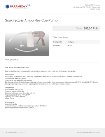 PARAMEDYK sklep ul. Gilarska 103, 03-589 Warszawa 22 679 70 16 Ssak ręczny Ambu Res-Cue Pump Cena: 389,00 PLN Opis słownikowy Dostępność dostępny Producent Ambu Opis produktu Ssak ręczny Ambu Res-Cue Pump Ssak Ambu Res-Cue Pump jest lekkim, przenośnym ssakiem, który może być obsługiwany jedną ręką. Właściwości Konstrukcja ssaka Ambu Res-Cue Pump zapewnienia efektywność działania oraz prostą obsługę i konserwację. Jest niewielki, lekki i poręczny. Obsługa nie wymaga wielkiego wysiłku. Obrotowy przełącznik ciśnienia pozwala na przełączanie pomiędzy dwoma zakresami ciśnienia ssania (100% - dorośli lub 50% dzieci). Zabezpieczenie przed przelaniem zapobiega zanieczyszczeniu zewnętrznej powierzchni ssaka. Specyfikacja Podciśnienie: 450 mm Hg Przepływ ssania: >20 l/min. Objętość jednorazowego zbiornika: 300 ml Regulacja podciśnienia: 100 lub 50% Wymiary: 185 x 64 x 168 mm Waga: 230 g Wyposażenie: zbiornik: 1 sztuka końcówki ssące o średnicy wewnętrznej: 2 sztuki - 6 i 13 cm złączki do podłączenia cewników: 2 sztuki Plik wygenerowano: 07-03-2017 Oprogramowanie sklepu: AptusShop PARAMEDYK sklep ul. Gilarska 103, 03-589 Warszawa 22 679 70 16 Galeria Plik wygenerowano: 07-03-2017 Powered by TCPDF (www.tcpdf.org) Oprogramowanie sklepu: AptusShop
