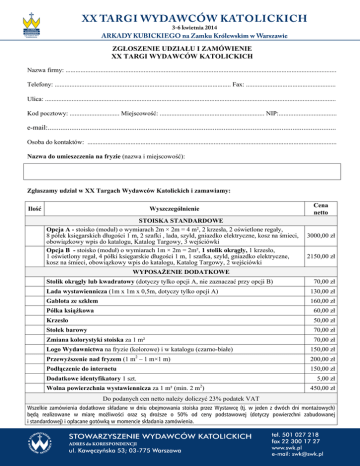 ZGŁOSZENIE UDZIAŁU I ZAMÓWIENIE XX TARGI WYDAWCÓW KATOLICKICH Nazwa firmy: ................................................................................................................................................................... Telefony: .......................................................................................................... Fax: ...................................................... Ulica: ............................................................................................................................................................................... Kod pocztowy: .............................. Miejscowość: ............................................................... NIP:................................... e-mail:............................................................................................................................................................... Osoba do kontaktów: ...................................................................................................................................................... Nazwa do umieszczenia na fryzie (nazwa i miejscowość): Zgłaszamy udział w XX Targach Wydawców Katolickich i zamawiamy: Ilość Cena netto Wyszczególnienie STOISKA STANDARDOWE Opcja A - stoisko (moduł) o wymiarach 2m × 2m = 4 m², 2 krzesła, 2 oświetlone regały, 8 półek księgarskich długości 1 m, 2 szafki , lada, szyld, gniazdko elektryczne, kosz na śmieci, obowiązkowy wpis do katalogu, Katalog Targowy, 3 wejściówki Opcja B - stoisko (moduł) o wymiarach 1m × 2m = 2m², 1 stolik okrągły, 1 krzesło, 1 oświetlony regał, 4 półki księgarskie długości 1 m, 1 szafka, szyld, gniazdko elektryczne, kosz na śmieci, obowiązkowy wpis do katalogu, Katalog Targowy, 2 wejściówki 3000,00 zł 2150,00 zł WYPOSAŻENIE DODATKOWE Stolik okrągły lub kwadratowy (dotyczy tylko opcji A, nie zaznaczać przy opcji B) 70,00 zł Lada wystawiennicza (1m x 1m x 0,5m, dotyczy tylko opcji A) 130,00 zł Gablota ze szkłem 160,00 zł Półka książkowa 60,00 zł Krzesło 50,00 zł Stołek barowy 70,00 zł Zmiana kolorystyki stoiska za 1 m² 70,00 zł Logo Wydawnictwa na fryzie (kolorowe) i w katalogu (czarno-białe) 150,00 zł Przewyższenie nad fryzem (1 m – 1 m×1 m) 200,00 zł Podłączenie do internetu 150,00 zł 2 5,00 zł Dodatkowe identyfikatory 1 szt. 2 Wolna powierzchnia wystawiennicza za 1 m² (min. 2 m ) 450,00 zł Do podanych cen netto należy doliczyć 23% podatek VAT Wszelkie zamówienia dodatkowe składane w dniu obejmowania stoiska przez Wystawcę (tj. w jeden z dwóch dni montażowych) będą realizowane w miarę możliwości oraz są droższe o 50% od ceny podstawowej (dotyczy powierzchni zabudowanej i standardowej) i opłacane gotówką w momencie składania zamówienia. Ilość Cena netto Wyszczególnienie STOISKO WSPÓLNE Półka książkowa (1 m) na stoisku wspólnym i wpis do katalogu, Katalog Targowy (Zasady uczestniczenia na wspólnym stoisku – patrz Regulamin pkt. 23) 250,00 zł Do podanych cen netto należy doliczyć 23% podatek VAT OFERTA SPECJALNA Stancja – pomieszczenie wnękowe o powierzchni ok. 26 m2 z wejściem w ciągu ekspozycji, o sklepieniu 2 łukowym, o wysokości do 3 m. Cena za m – 300 zł. Aranżacja (zabudowa) stancji (stoiska) we własnym zakresie lub w porozumieniu z organizatorem (cena zabudowy do uzgodnienia z Organizatorem) Stancja nr 1 Stancja nr 2 Stancja nr 3 Stancja nr 4 Stancja nr 5 Do podanych cen netto należy doliczyć 23% podatek VAT PODWYSTAWCY Opłata rejestracyjna podwystawcy 200,00 zł Obowiązkowy wpis do katalogu (400 znaków) Do podanych cen netto należy doliczyć 23% podatek VAT Należność uregulujemy do dnia 15 marca 2014 r. przelewem na konto: Stowarzyszenie Wydawców Katolickich, ul. Św. Bonifacego 9, 02-914 Warszawa, Bank BGŻ S.A. 09 2030 0045 1110 0000 0315 1570 Oświadczamy, że jesteśmy płatnikami podatku VAT. ________________ miejscowość i data _____________ pieczęć firmy ____________________________ czytelny podpis zamawiającego Zgłoszenia prosimy nadsyłać do dnia 28 lutego 2014 r. Członkowie Stowarzyszenia Wydawców Katolickich, którzy do dnia 31.12.2013 r. posiadają uregulowane składki członkowskie otrzymują 10% rabatu na zamawiane stoiska. Rabaty nie sumują się.