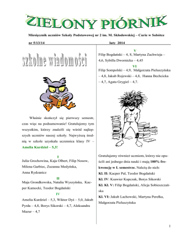 Miesięcznik uczniów Szkoły Podstawowej nr 2 im. M. Skłodowskiej – Curie w Sobótce nr 5/13/14 luty 2014 V Filip Bogdański – 4, 8, Martyna Zachwieja – 4,6, Sybilla Dwornicka – 4,45 VI Filip Sompolski – 4,9, Małgorzata Pieluszyńska – 4,8, Jakub Rojewski – 4,8, Hanna Bechcicka – 4,7, Agata Grygiel – 4,7. Właśnie skończył się pierwszy semestr, czas więc na podsumowanie! Gratulujemy tym wszystkim, którzy znaleźli się wśród najlepszych uczniów naszej szkoły. Najwyższą średnią w szkole uzyskała uczennica klasy IV – Amelia Kurdziel – 5,3! I Julia Grochowina, Kaja Olbert, Filip Nosow, Gratulujemy również uczniom, którzy nie opuścili ani jednego dnia nauki i mają 100% fre- Milena Garbiec, Zuzanna Medyńska, kwencję w I. semestrze. Należą do nich: Anna Rydzanicz Kl. II: Kacper Pal, Teodor Bogdański II Maja Grondkowska, Natalia Wyszyńska, Kac- Kl. IV: Ksawier Kupczak, Borys Sikorski per Kamocki, Teodor Bogdański IV Amelia Kurdziel – 5,3, Wiktor Dyś – 5,0, Jakub Pyrda – 4,8, Borys Sikorski – 4,7, Aleksandra Kl. Kl. V: Filip Bogdański, Alicja Sobieszczańska Kl. VI: Jakub Lachowski, Martyna Perełka, Małgorzata Pieluszyńska Mazur – 4,7 1 Noc Kupały (Sobótka) obchodzona w czasie Juz wkrótce - Walentynki! letniego przesilenia, a więc w nocy z 21 na 22 czerwca. I dopiero w latach 90tych XX w. zyskały większą popularność. Wszyscy już znamy Walentynki, ale kim był ich patron, Święty Walenty? W tradycji chrześcijańskiej odnajdujemy informacje o co najmniej trzech świętych o imieniu Valentine lub Valentinus. Jedna z legend mówi o duchownym, który przeciwstawił się rozkazowi Imperatora Rzymu Klaudiusza II. zakazującego udzielania ślubów młodym mężczyznom, jako że wg doradców Klaudiusza, nieżonaci mężczyźni byli lepszym żołnierzami. Za to nieposłuszeństwo duchowny Walenty został skazany na śmierć. Te życzenia Ci przesyła Walentynka pewna miła. W dniu tak pięknym i wspaniałym Życzę Tobie sercem całym Dużo szczęścia, namiętności, Nie kończącej się miłości. Inna historia mówi o młodym człowieku, który * skazany za pomoc prześladowanym chrześcija- W Walentynki piękny świat, nom, sam został skazany na śmierć. Z więzienia więc Ci życzę uroczyście: wysłał swojej ukochanej list z podpisem „From żyj przynajmniej dwieście lat! Your Valentine” (podpis używany do dzisiaj na ...ze mną, oczywiście! walentynkach w języku angielskim). Termin tego święta pokrywa się z początkiem święta wiosny w starożytnym Rzymie i istnieją przypuszczenia, że jest to święto mające na celu zastąpienie pogańskiego święta wiosny (Lupercalia) i łacińskich obchodów Fauna - boga * Jeśli zdziwiona jest Twoja minka, z jakiej okazji ta walentynka, to przecież dzisiaj jest czternastego, święto każdego zakochanego! upraw. O ile w Europie zachodniej i południowej walentynki obchodzone są od czasów średniowiecza, u Słowian dniem zakochanych była raczej * Dzień świętego Walentego To dzień dobry dla każdego! 2 W tym dniu wszyscy to wyznają, * Że chcą kochać i kochają! Bądźmy zawsze we dwoje, obok twego serca moje. * Najlepsze życzenia Klub pismaka Na walentynki Dla fajnego chłopaka Od fajnej dziewczynki Dziś zamieszczamy prace wyróżnione w szkolnych eliminacjach X edycji regionalnego konkursu literacko – dziennikarskiego dla uczniów z Dolnego Śląska pod nazwą Moja Na Dzień Zakochanych, proponujemy Wam kilka przykładów życzeń, które można wpisać do książki, listu, pamiętnika lub po prostu powiedzieć osobie ukochanej. mała ojczyzna im. Beaty Jaroszewskiej organizowanego przez Szkołę Podstawową im. Św. Wojciecha we Włodowicach. Prace te zostały wysłane na eliminacje wojewódzkie, wyniki w kwietniu 2014r. * ”Ile razem dróg przebytych? Ile ścieżek przedeptanych? Ile listów, ile rozstań, ciężkich godzin w miastach wielu? Ile w trudzie nieustannym Pewnego dnia Pani zaproponowała mojej klasie zwiedzanie ciekawych miejsc w naszej miejscowości. Wszyscy byli zachwyceni tym wspólnych zmartwień, pomysłem z wyjątkiem mnie. Uważałem, że to wspólnych dążeń?” będzie zmarnowany dzień. Przecież znam swo- (K.I .Gałczyński) * Z radością oddaję ją okolicę. Nie ma tu nic ciekawego. Zamiast tego mógłbym przecież pograć z chłopakami na przerwach w piłkę na dużym korytarzu albo Ci swe serce. porzucać się śniegiem z dziewczynami. Byłem Czy czujesz, wściekły. Jak pulsuje szczęściem? 3 Dwa dni później wszyscy wyruszyliśmy Mężczyzna wyjął najmniejszą kolczugę, jaka spod szkoły. Było mroźnie i pod butami skrzy- była w składziku i nałożył mi na bluzę. piał śnieg. Pomyślałem, że w czasie drogi natrę - Ale to ciężkie! - syknąłem. Kaśkę śniegiem. Już szykowałem się do ataku, - Nikt nie obiecywał, że będzie łatwo - zaśmiał gdy nadszedł nasz przewodnik. Wszyscy go się mężczyzna i ściągnął kolczugę z moich bar- otoczyli, jakby był najważniejszy na świecie. ków. On natomiast z dumą się wyprostował i przed- -Chodź ze mną, to odprowadzę cię do grupy. stawił nam plan naszego zwiedzania. Wszyscy z Zgodziłem się, bo nie miałem innego wyjścia. zaciekawieniem go słuchali. Na mnie to nie -Przejdziemy salą bankietową - zaproponował robiło wrażenia. nieznajomy. Po około 15 minutach wszyscy doszli- - Ok, dla mnie bez różnicy! – powiedziałem śmy do zamku znajdującego się w Sobótce Gór- lekko znudzony. ce. Podaliśmy kurtki oraz czapki miłej, starszej Chyba jednak się pomyliłem. Sala robiła wraże- pani pracującej w szatni i ruszyliśmy natych- nie. Był w niej okrągły, potężny stół. Przypo- miast zwiedzać zamek. Już w pierwszej komna- mniałem sobie wtedy film o królu Arturze. cie zacząłem się straszliwie nudzić i postanowi- Przewodnik powiedział mi, że w średniowieczu łem bawić się z kolegami w chowanego. Było odbywały się t