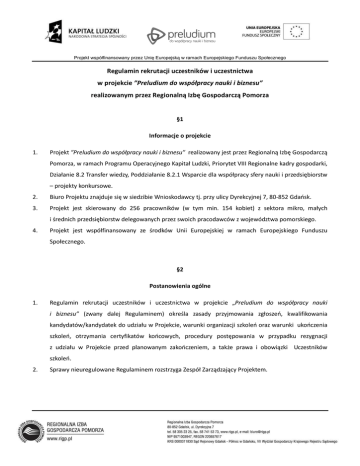 Projekt współfinansowany przez Unię Europejską w ramach Europejskiego Funduszu Społecznego Regulamin rekrutacji uczestników i uczestnictwa w projekcie ”Preludium do współpracy nauki i biznesu” realizowanym przez Regionalną Izbę Gospodarczą Pomorza §1 Informacje o projekcie 1. Projekt ”Preludium do współpracy nauki i biznesu” realizowany jest przez Regionalną Izbę Gospodarczą Pomorza, w ramach Programu Operacyjnego Kapitał Ludzki, Priorytet VIII Regionalne kadry gospodarki, Działanie 8.2 Transfer wiedzy, Poddziałanie 8.2.1 Wsparcie dla współpracy sfery nauki i przedsiębiorstw – projekty konkursowe. 2. Biuro Projektu znajduje się w siedzibie Wnioskodawcy tj. przy ulicy Dyrekcyjnej 7, 80-852 Gdańsk. 3. Projekt jest skierowany do 256 pracowników (w tym min. 154 kobiet) z sektora mikro, małych i średnich przedsiębiorstw delegowanych przez swoich pracodawców z województwa pomorskiego. 4. Projekt jest współfinansowany ze środków Unii Europejskiej w ramach Europejskiego Funduszu Społecznego. §2 Postanowienia ogólne 1. Regulamin rekrutacji uczestników i uczestnictwa w projekcie „Preludium do współpracy nauki i biznesu” (zwany dalej Regulaminem) określa zasady przyjmowania zgłoszeń, kwalifikowania kandydatów/kandydatek do udziału w Projekcie, warunki organizacji szkoleń oraz warunki ukończenia szkoleń, otrzymania certyfikatów końcowych, procedury postępowania w przypadku rezygnacji z udziału w Projekcie przed planowanym zakończeniem, a także prawa i obowiązki Uczestników szkoleń. 2. Sprawy nieuregulowane Regulaminem rozstrzyga Zespół Zarządzający Projektem. Projekt współfinansowany przez Unię Europejską w ramach Europejskiego Funduszu Społecznego §3 Definicje 1. Ilekroć w Regulaminie mowa jest o: a) POKL – należy przez to rozmieć Program Operacyjny Kapitał Ludzki 2007-2013, wersja obowiązująca od 5 grudnia 2011r. b) Projekcie – należy przez to rozumieć projekt „Preludium do współpracy nauki i biznesu”, realizowany w ramach Programu Operacyjnego Kapitał Ludzki, Priorytet VIII, Poddziałanie 8.2.1 Wsparcie dla współpracy sfery nauki i przedsiębiorstw – projekty konkursowe. c) Instytucji Pośredniczącej – należy przez to rozumieć Urząd Marszałkowski Województwa Pomorskiego, Departament Europejskiego Funduszu Społecznego. d) Beneficjencie Pomocy – należy przez to rozumieć przedsiębiorstwo z sektora MŚP (mikro, małe i średnie przedsiębiorstwo) kierujące swoich pracowników na szkolenia organizowane w ramach projektu. e) Beneficjencie Ostatecznym (Uczestniku szkolenia) – należy przez to rozumieć pracownika (w rozumieniu art. 2 Kodeksu Pracy, Dz. U. 1974, Nr 24, poz. 141) lub osobę zatrudnioną na stanowisku kierowniczym na zasadach innych niż na podstawie stosunku pracy w przedsiębiorstwie z sektora MŚP, oddelegowanego przez pracodawcę oraz właściciela bądź wspólnika (w tym partnera) w przedsiębiorstwie z sektora MŚP, który wyraził chęć udziału w projekcie oraz dostarczył wymagane dokumenty. f) Szkoleniu A – należy przez to rozumieć warsztaty inicjujące współpracę sfer nauki i biznesu obejmujące trzy dni po 8 godzin dydaktycznych każdy. g) Szkoleniu B – należy przez to rozumieć szkolenie w zakresie: zarządzania strategicznego, zarządzania innowacjami, zarządzania finansami, zarządzania marketingowego, obejmujące trzy dni po 8 godzin dydaktycznych każdy. Projekt współfinansowany przez Unię Europejską w ramach Europejskiego Funduszu Społecznego §4 Czas trwania projektu, obszar realizacji, liczba beneficjentów 1. Projekt realizowany jest w okresie od 01.11.2012 do 31.10.2014. 2. Obszar realizacji Projektu obejmuje województwo pomorskie. 3. W Projekcie może wziąć udział 120 Beneficjentów Pomocy: a) 80 z sektora mikro przedsiębiorstw, b) 30 z sektora małych przedsiębiorstw, c) 10 z sektora średnich przedsiębiorstw. 4. W Projekcie może wziąć udział 256 Beneficjentów Ostatecznych, w tym minimum 154 kobiet. §5 Warunki uczestnictwa 1. Beneficjentem Pomocy może być przedsiębiorstwo, które spełnia łącznie następujące warunki: a) posiada status MŚP określony w Załączniku nr 1 do Regulaminu, b) prowadzi działalność gospodarczą i posiada jednostkę organizacyjną na terytorium województwa pomorskiego, c) kierownictwo ww. przedsiębiorstwa deklaruje chęć podwyższenia kompetencji dot. wdrażania rozwiązań innowacyjnych związanych z rozwojem firmy. 2. Pierwszeństwo w zakwalifikowaniu do udziału w Projekcie posiadają przedsiębiorstwa, które spełniają co najmniej jeden z następujących warunków: a) należą do branż wysokich technologii określonych w Załączniku nr 2 do Regulaminu, b) są przedsiębiorstwami z sektora MSP o małej dotychczasowej współpracy ze sferą nauki. 3. Beneficjentem Ostatecznym/ Uczestnikiem szkoleń może być osoba fizyczna spełniająca łącznie następujące warunki: a) jest pracownikiem przedsiębiorstwa lub jego właścicielem albo wspólnikiem (w tym partnerem) w przedsiębiorstwie, b) przedsiębiorstwo, o którym mowa powyżej spełnia warunki określone w §3 ust. 1, Projekt współfinansowany przez Unię Europejską w ramach Europejskiego Funduszu Społecznego c) jego miejscem pracy lub zamieszkania jest województwo pomorskie, d) należy do kadry zarządzającej lub jest osobą odpowiedzialną za rozwój firmy. 4. Uczestnicy szkoleń są kierowani do udziału w Projekcie przez pracodawców. 5. Przedsiębiorstwa kierujące na szkolenia pracowników nie mogą spełniać przesłanek wykluczających z ubiegania się o wsparcie w ramach Europejskiego Funduszu Społecznego. 6. Warunkiem uczestnictwa w projekcie jest podpisanie Umowy uczestnika projektu oraz Umowy o wsparcie szkoleniowo – doradcze. 7. Uczestnik szkoleń zobowiązany jest do wyrażenia zgody na przetwarzanie danych osobowych w celach monitoringu, ewaluacji i sprawozdawczości. Podanie danych osobowych