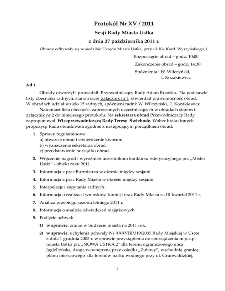 Protokół Nr XV / 2011 Sesji Rady Miasta Ustka z dnia 27 października 2011 r. Obrady odbywały się w siedzibie Urzędu Miasta Ustka, przy ul. Ks. Kard. Wyszyńskiego 3. Rozpoczęcie obrad – godz. 10:00 Zakończenie obrad – godz. 14:30 Spóźnienia : W. Wilczyński, I. Kozakiewicz Ad 1. Obrady otworzył i prowadził Przewodniczący Rady Adam Brzóska. Na podstawie listy obecności radnych, stanowiącej załącznik nr 1 stwierdził prawomocność obrad. W obradach udział wzięło 15 radnych, spóźnieni radni: W. Wilczyński, I. Kozakiewicz. Natomiast lista obecności zaproszonych uczestniczących w obradach stanowi załącznik nr 2 do niniejszego protokołu. Na sekretarza obrad Przewodniczący Rady zaproponował Wiceprzewodniczącą Rady Teresę Świebodę. Wobec braku innych propozycji Rada obradowała zgodnie z następującym porządkiem obrad: 1. Sprawy regulaminowe: a) otwarcie obrad i stwierdzenie kworum, b) wyznaczenie sekretarza obrad, c) przedstawienie porządku obrad. 2. Wręczenie nagród i wyróżnień uczestnikom konkursu estetyzacyjnego pn. „Mister Ustki” - obiekt roku 2011. 3. Informacja z prac Burmistrza w okresie między sesjami. 4. Informacja z prac Rady Miasta w okresie między sesjami. 5. Interpelacje i zapytania radnych. 6. Informacja o realizacji wniosków komisji oraz Rady Miasta za III kwartał 2011 r. 7. Analiza przebiegu sezonu letniego 2011 r. 8. Informacja o analizie oświadczeń majątkowych. 9. Podjęcie uchwał: 1) w sprawie: zmian w budżecie miasta na 2011 rok, 2) w sprawie: uchylenia uchwały Nr XXXVIII/319/2005 Rady Miejskiej w Ustce z dnia 1 grudnia 2005 r. w sprawie przystąpienia do sporządzenia m.p.z.p. miasta Ustka pn. „NOWA USTKA 2” dla terenu ograniczonego ulicą Jagiellońską, drogą wewnętrzną przy osiedlu „Żuławy”, wschodnią granicą planu miejscowego dla terenów parku wodnego przy ul. Grunwaldzkiej, 1 wschodnią granicą administracyjną miasta, duktem leśnym za stadionem przy ul. Sportowej, granicą nieruchomości położonej przy ul. Słupskiej 14, odcinkiem biegnącym przez las równolegle do ul. Słupskiej oraz ulicami Słupską, Cisową i Wróblewskiego, 3) w sprawie: uchylenia uchwały Nr IX/92/2011 Rady Miasta Ustka z dnia 30 czerwca 2011r. w sprawie zawarcia Porozumienia Międzygminnego pomiędzy Gminą Miasto Ustka a Gminą Miejską Słupsk w sprawie działań z zakresu planowania przestrzennego na terenach położonych w granicach administracyjnych miasta Ustka, 4) w sprawie: zawarcia Porozumienia Międzygminnego pomiędzy Gminą Miasto Ustka a Miastem Słupsk w sprawie działań z zakresu planowania przestrzennego na terenach położonych w granicach administracyjnych miasta Ustka, 5) w sprawie: przystąpienia do sporządzenia m.p.z.p. miasta Ustka pn. „USTKA ROZWOJOWA B”, stanowiącego zmianę fragmentu m.p.z.p. miasta Ustka pn. „Ustka Rozwojowa”, zatwierdzonego uchwałą Rady Miasta Ustka Nr VIII/61/2007 z dnia 31 maja 2007 r. i zmianę m.p.z.p. zabudowy jednorodzinnej przy ul. Polnej w Ustce, zatwierdzonego uchwałą Rady Miejskiej w Ustce Nr IV/ 16/2000 z dnia 27 kwietnia 2000 r. 6) w sprawie: przystąpienia do sporządzenia m.p.z.p. miasta Ustka pn. „ NOWA USTKA 2”, 7) w sprawie: zmiany Uchwały Nr II/3/10 Rady Miasta Ustka z dnia 13 grudnia 2010 r. w sprawie powołania Komisji Rewizyjnej. 10. Odpowiedzi na interpelacje i zapytania radnych. 11. Wolne wnioski i oświadczenia. 12. Zakończenie obrad. Ad 2. Wręczenie nagród i wyróżnień uczestnikom konkursu estetyzacyjnego pn. „Mister Ustki” - obiekt roku 2011. Burmistrz Miasta J. Olech oraz Przewodniczący Rady A. Brzóska wręczali kolejno nagrody i wyróżnienia laureatom konkursu „Mister Ustki – obiekt roku 2011. Natomiast laureatów przedstawiała Naczelnik Wydz. G.P. Małgorzata Bugajewska. Spośród 5. propozycji zgłoszonych do konkursu w kategorii: „A” - BUDYNKI NOWO WYBUDOWANE – wytypowano następujących zwycięzców: I miejsce – ul. Marynarki Polskiej 30 II miejsce – ul. Kościuszki 3A III miejsce – ul. Narutowicza 5, 7, 9 2. Wśród 25. obiektów nominowanych w kategorii „B”- BUDYNKI ODNOWIONE zwycięzcami zostali: 2 I miejsce – ul. Mickiewicza 10 II miejsce – ul. Kosynierów 2 III miejsce – ul. Marynarki Polskiej 3 W tej kategorii przyznano również wyróżnienia. Wyróżnionymi obiektami zostały: ul. Słowiańska 12 ul. Marynarki Polskiej 87 ul. Słowiańska 8 ul. Słowiańska 2 b 3. Spośród internautów, którzy uczestniczyli w konkursie i oddali ważny głos wyłoniono 3 osoby. Są to: Izabela Lech, Andrzej Stachowicz, Konrad Jendrzejczak. Burmistrz pogratulował nagrodzonym i wyróżnionym, podziękował nagrodzonym i wyróżnionym za upiększanie naszego miasta. Przewodniczący ogłosił 5 minutową przerwę w obradach. Ad.3 Informacja z prac Burmistrza w okresie między sesjami. ( I część nagrania czas 14:30). Burmistrz J. Olech uzupełnił pisemną informację, przekazaną radnym, stanowiącą załącznik nr 3 do protokołu: -uczestniczył w Kongresie Miast Uzdrowiskowych w Połczynie Zdroju. W trakcie obrad zgłaszano uwagi do ustawy o lecznictwie uzdrowiskowym. W trakcie Kongresu dyskutowano o funkcjonowaniu stref uzdrowiskowych, o ściągalności opłaty uzdrowiskowej. Uczestnicy Kongresu wyrazili oburzenie z restrykcyjnych nowych przepisów, zakazujących budowy nowych zakładów przemysłowych na terenie uzdrowiska. Przeciwko temu niekorzystnemu zapisowi wystąpili samorządowcy do Komisji Rządu i Samorządu o pilne zmiany tego zapisu. Obecni na Kongresie Parlamentarzyści obiecali puszczenie tego na krótka ścieżkę legislacyjną. Samorządowcy wystąpili również z wnioskiem o narzędzia dla samorządów dające możliwość ściągalności opłaty uzdrowiskowej. Ponadto ustawa o podatkach i opłatach lokalnych zakłada zmianę stawki podatku od budynków związanych z działalnością służby zdrowia. Wszystkie duże uzdrowiska występują do Trybunału Konstytucyjneg