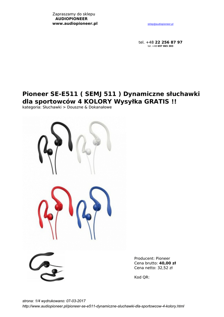 Zapraszamy do sklepu AUDIOPIONEER www.audiopioneer.pl [email protected] tel. +48 22 256 87 97 tel. +48 697 865 383 Pioneer SE-E511 ( SEMJ 511 ) Dynamiczne słuchawki dla sportowców 4 KOLORY Wysyłka GRATIS !! kategoria: Słuchawki > Douszne & Dokanałowe Producent: Pioneer Cena brutto: 40,00 zł Cena netto: 32,52 zł Kod QR: strona: 1/4 wydrukowano: 07-03-2017 http://www.audiopioneer.pl/pioneer-se-e511-dynamiczne-sluchawki-dla-sportowcow-4-kolory.html strona: 2/4 wydrukowano: 07-03-2017 http://www.audiopioneer.pl/pioneer-se-e511-dynamiczne-sluchawki-dla-sportowcow-4-kolory.html Dodaj rytmu treningom Dynamiczne s?uchawki SE-E511 s? idealnym partnerem treningów, nadaj?c rytm i tempo Twojej aktywno?ci. Dzi?ki wysokiej jako?ci 15mm przetwornikom mo?esz cieszy? si? doskona?ym brzmieniem utworów z mocnym, energetycznym basem. S?uchawki SE-E511 dost?pne s? w 4 wersjach kolorystycznych: czarnej (SE-E511-K), bia?ej (SE-E511-W), czerwonej (SE-E511-R) i niebieskiej (SE-E511-L). Przed zakupem prosz? potwierdzi? dost?pno?? wybranego koloru. Specyfikacje Typ Dynamiczne s?uchawki dla sportowców Pasmo przenoszenia 20 - 21.000 Hz Impedancja 32 ? Maks. moc wej?ciowa 100 mW Skuteczno?? 69 dB/mW Wymiary przetwornika 15 mm Wtyk 3.5 mm stereo mini (poz?acany) D?ugo?? przewodu 1.2 m (OFC Litz) Waga netto (bez przewodu) 8 g strona: 3/4 wydrukowano: 07-03-2017 http://www.audiopioneer.pl/pioneer-se-e511-dynamiczne-sluchawki-dla-sportowcow-4-kolory.html strona: 4/4 wydrukowano: 07-03-2017 http://www.audiopioneer.pl/pioneer-se-e511-dynamiczne-sluchawki-dla-sportowcow-4-kolory.html