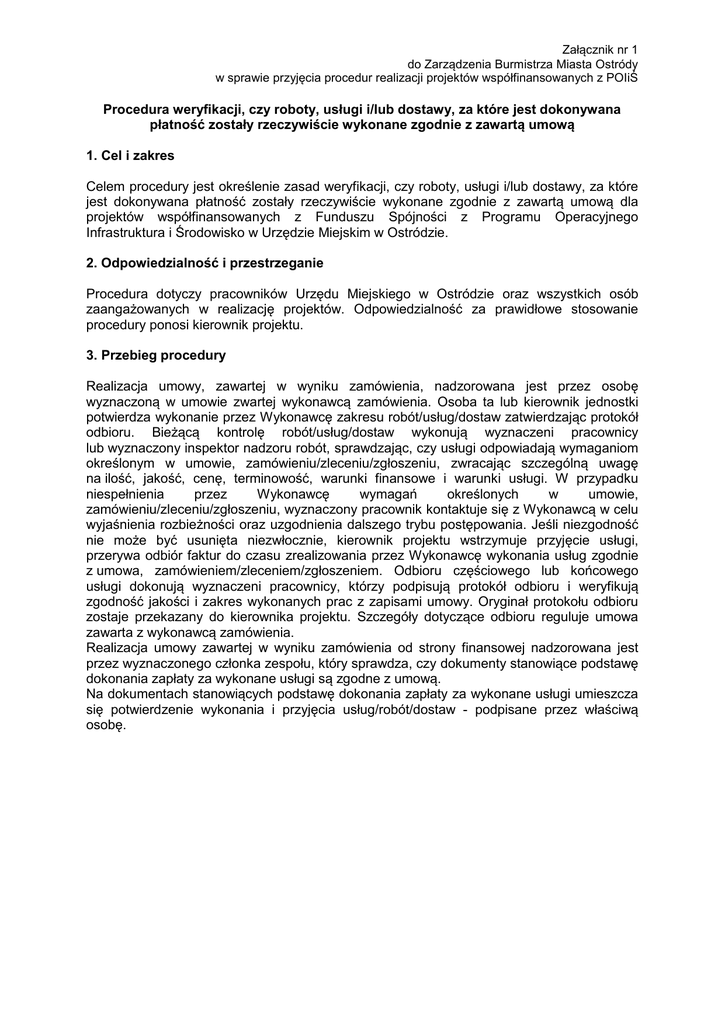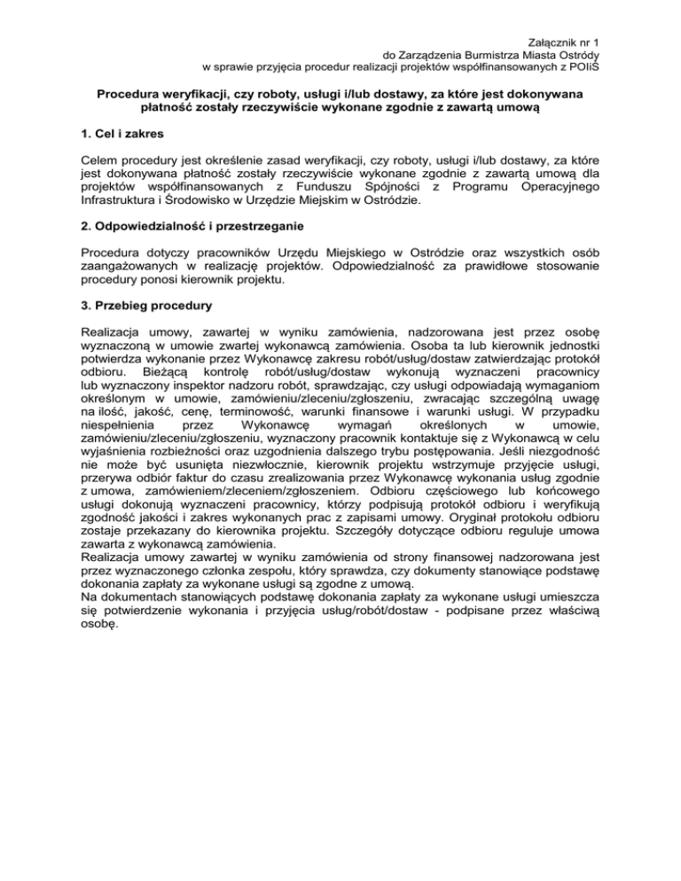Załącznik nr 1 do Zarządzenia Burmistrza Miasta Ostródy w sprawie przyjęcia procedur realizacji projektów współfinansowanych z POIiŚ Procedura weryfikacji, czy roboty, usługi i/lub dostawy, za które jest dokonywana płatność zostały rzeczywiście wykonane zgodnie z zawartą umową 1. Cel i zakres Celem procedury jest określenie zasad weryfikacji, czy roboty, usługi i/lub dostawy, za które jest dokonywana płatność zostały rzeczywiście wykonane zgodnie z zawartą umową dla projektów współfinansowanych z Funduszu Spójności z Programu Operacyjnego Infrastruktura i Środowisko w Urzędzie Miejskim w Ostródzie. 2. Odpowiedzialność i przestrzeganie Procedura dotyczy pracowników Urzędu Miejskiego w Ostródzie oraz wszystkich osób zaangażowanych w realizację projektów. Odpowiedzialność za prawidłowe stosowanie procedury ponosi kierownik projektu. 3. Przebieg procedury Realizacja umowy, zawartej w wyniku zamówienia, nadzorowana jest przez osobę wyznaczoną w umowie zwartej wykonawcą zamówienia. Osoba ta lub kierownik jednostki potwierdza wykonanie przez Wykonawcę zakresu robót/usług/dostaw zatwierdzając protokół odbioru. Bieżącą kontrolę robót/usług/dostaw wykonują wyznaczeni pracownicy lub wyznaczony inspektor nadzoru robót, sprawdzając, czy usługi odpowiadają wymaganiom określonym w umowie, zamówieniu/zleceniu/zgłoszeniu, zwracając szczególną uwagę na ilość, jakość, cenę, terminowość, warunki finansowe i warunki usługi. W przypadku niespełnienia przez Wykonawcę wymagań określonych w umowie, zamówieniu/zleceniu/zgłoszeniu, wyznaczony pracownik kontaktuje się z Wykonawcą w celu wyjaśnienia rozbieżności oraz uzgodnienia dalszego trybu postępowania. Jeśli niezgodność nie może być usunięta niezwłocznie, kierownik projektu wstrzymuje przyjęcie usługi, przerywa odbiór faktur do czasu zrealizowania przez Wykonawcę wykonania usług zgodnie z umowa, zamówieniem/zleceniem/zgłoszeniem. Odbioru częściowego lub końcowego usługi dokonują wyznaczeni pracownicy, którzy podpisują protokół odbioru i weryfikują zgodność jakości i zakres wykonanych prac z zapisami umowy. Oryginał protokołu odbioru zostaje przekazany do kierownika projektu. Szczegóły dotyczące odbioru reguluje umowa zawarta z wykonawcą zamówienia. Realizacja umowy zawartej w wyniku zamówienia od strony finansowej nadzorowana jest przez wyznaczonego członka zespołu, który sprawdza, czy dokumenty stanowiące podstawę dokonania zapłaty za wykonane usługi są zgodne z umową. Na dokumentach stanowiących podstawę dokonania zapłaty za wykonane usługi umieszcza się potwierdzenie wykonania i przyjęcia usług/robót/dostaw - podpisane przez właściwą osobę.