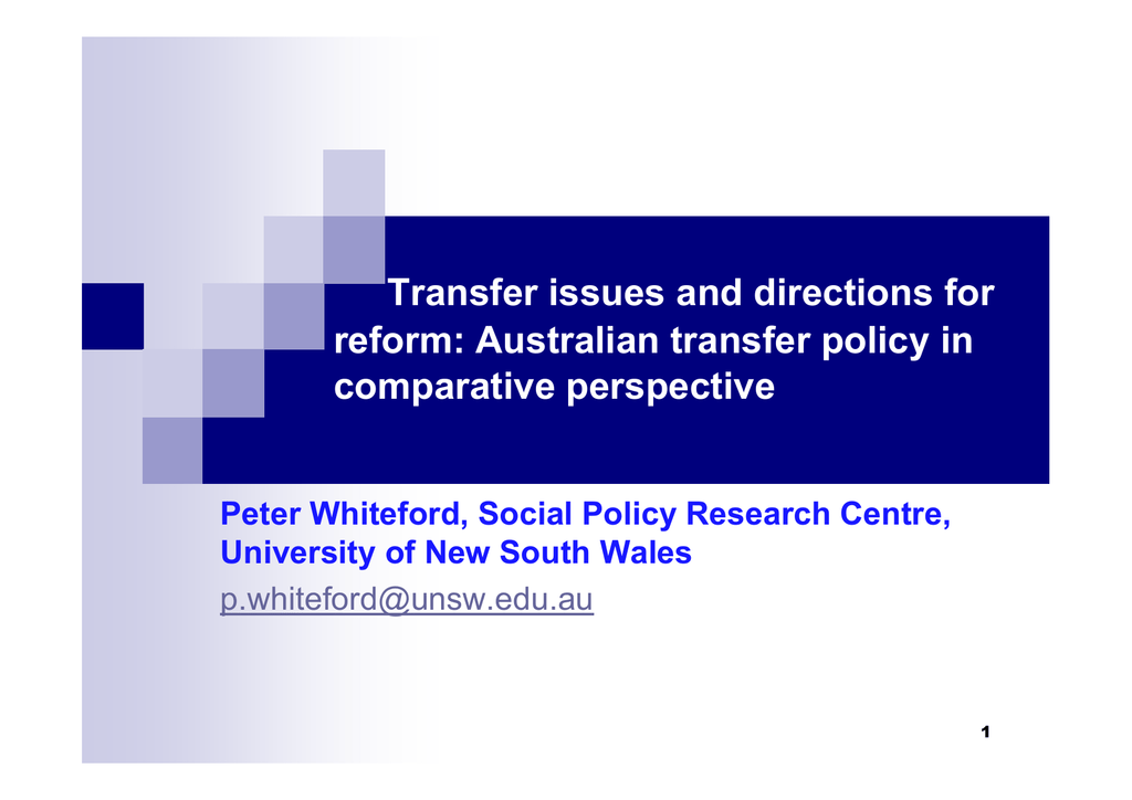 Transfer issues and directions for reform: Australian transfer policy in comparative perspective Peter Whiteford, Social Policy Research Centre, University of New South Wales [email protected] 1 Outline Why are we interested in the design of transfer systems? Nature and limitations of the approach The design of transfer systems Targeting, progressivity and redistribution How Australia compares Summary and some conclusions Sources and additional material 2 Why are we interested in the design of transfer systems? “The tax-transfer system is the principal means of expressing societal choices about equity. The tax-transfer system is a reflection of the kind of society we aspire to be.” Ken Henry, ACOSS National Conference, (2009). 3 Caveats and limitations Approach is descriptive and based on statistical calculations. Most analysis is static. The counterfactual effectively assumes that the welfare state has had no incentive effects, or at least is the same in all countries. Some welfare state features treated as if they are produced by market mechanisms (e.g. minimum wages). Does not include non-cash benefits (health care, education, social housing, child care); indirect taxes – VAT, employer social security contributions also not included. Employer social security contributions are paid by businesses direct to government and do not pass through the household sector. Particularly problematic as they are one of main sources of funding for the welfare state. Employer provided fringe benefits not included. The distribution of wealth, including owner-occupied housing makes a difference. 4 Australia’s distinctive tax/benefit system Total Australian spending on social protection (cash benefits, health care, social services) is about 85% of the OECD average – but this is mainly due to much lower than average spending on age pensions; health, disability and social services are a little higher than average and cash benefits for people of working age about 10% higher and for families about 40% higher; cash transfers about 70% of average. Direct taxation paid by benefit recipients is among the lowest in the OECD, as is indirect taxation of benefits. Pension tax expenditures are the highest in the OECD (not counted in figures), but other tax expenditures below average. Mandatory private social benefits (sick pay and superannuation) amongst highest. Thus, net expenditure – after direct and indirect taxes paid on benefits – is even closer to average – and tax expenditures and mandatory private social expenditure increase Australia’s ranking further. To assess distributional impacts it is necessary to look at all components of the system together – ideally. 5 Types of redistribution in social security systems The design features of social protection differ in important respects - two of the most important features relate to the funding – i.e. the different ways in which programmes are financed – and structure of benefits – i.e. the relationship between benefits received and the past or current income of beneficiaries. Redistribution can be between rich and poor (Robin Hood) or across the lifecycle (the piggy bank) – risk insurance (against unemployment, disability, sickness etc.), savings (for retirement). All welfare states are a mix of the two, but the mix varies. Other types of redistribution – notably between men and women and also across regions. Behavioural effects may undercut redistribution; private provision also redistributes across the lifecycle. Point in time, static analysis implicitly treats all measured redistribution as if it were between rich and poor. Taking account of redistribution across the life course, the level of redistribution between rich and poor is less than it appears, but is still strongly associated with progressivity of benefit structure. 6 Targeting, progressivity and redistribution Targeting is a means of determining either eligibility for benefits or the level of entitlements for those eligible. In a sense, all benefit systems – apart from a universal “basic income” or “guaranteed minimum income” scheme – are targeted to specific categories of people, such as the unemployed, people with disabilities or those over retirement age. Income and asset-testing is a further form of targeting that can be applied once people satisfy categorical eligibility criteria. Progressivity refers to the profile of benefits when compared to market or disposable incomes – how large a share of benefits is received by different income groups – e.g. do the poor receive more than the rich from the transfer system? Redistribution refers to the outcomes of different tax and benefit systems – how much does the benefit system actually change the distribution of household income? Effectiveness measured by how much redistribution is achieved; efficiency by the resources used to achieve this redistribution. 7 Australia relies on income-testing more than any other OECD country % of GDP spent on income-tested benefits, 2005 8 Australia has the most progressive benefit system in the OECD Ratio of benefits received by poorest quintile to benefits received by richest quintile, total population, 2005 9 Progressivity of transfers, 2005 Concentration coefficient of transfers 10 Australia has low levels of churning Churning as % of equivalent household disposable income 11 The progressivity of direct taxes is highest in the English speaking countries and lowest in the Nordic countries Concentration coefficient for direct taxes around 2005 12 Australia has the most progressive direct taxes on retirement age households Concentration coefficient for direct taxes on retirement age households 13 Reduction in inequality due to public cash transfers and household taxes Point reduction in the concentration coefficient Public transfers in cash Household taxes SWE SWE DNK DNK BEL BEL CZE CZE IRL IRL AUS AUS SVK SVK NOR NOR DEU DEU GBR GBR NZL NZL NLD NLD OECD-22 OECD-22 ITA 