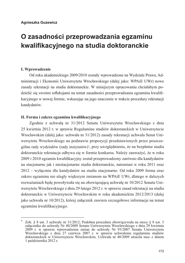 Agnieszka Guzewicz O zasadności przeprowadzania egzaminu kwalifikacyjnego na studia doktoranckie I. Wprowadzenie Od roku akademickiego 2009/2010 zostały wprowadzone na Wydziale Prawa, Administracji i Ekonomii Uniwersytetu Wrocławskiego (dalej jako: WPAiE UWr) nowe zasady rekrutacji na studia doktoranckie. W niniejszym opracowaniu chciałabym podzielić się swoimi refleksjami na temat zasadności przeprowadzania egzaminu kwalifikacyjnego w nowej formie, wskazując na jego znaczenie w trakcie procedury rekrutacji kandydatów. II. Forma i zakres egzaminu kwalifikacyjnego Zgodnie z uchwałą nr 31/2012 Senatu Uniwersytetu Wrocławskiego z dnia 25 kwietnia 2012 r. w sprawie Regulaminu studiów doktoranckich w Uniwersytecie Wrocławskim (dalej jako: uchwała nr 31/2012) zasady rekrutacji uchwala Senat Uniwersytetu Wrocławskiego na podstawie propozycji przedstawionych przez poszczególne rady wydziałów (rady instytutów)1, przy uwzględnieniu, że na bezpłatne studia doktoranckie rekrutacja odbywa się w formie konkursu. Należy zauważyć, że w roku 2009 i 2010 egzamin kwalifikacyjny został przeprowadzony zarówno dla kandydatów na stacjonarne jak i niestacjonarne studia doktoranckie, natomiast w roku 2011 oraz 2012 – wyłącznie dla kandydatów na studia stacjonarne. Od roku 2009 forma oraz zakres egzaminu nie uległy większym zmianom na WPAiE UWr, dlatego w dalszych rozważaniach będę powoływała się na obowiązującą uchwałę nr 10/2012 Senatu Uniwersytetu Wrocławskiego z dnia 29 lutego 2012 r. w sprawie zasad rekrutacji na studia doktoranckie w Uniwersytecie Wrocławskim w roku akademickim 2012/2013 (dalej jako uchwała nr 10/2012), której załącznik zawiera szczegółowe informacje na temat egzaminu kwalifikacyjnego. 1 Zob. § 8 ust. 3 uchwały nr 31/2012; Podobna procedura obowiązywała na mocy § 8 ust. 3 załącznika do uchwały Nr 40/2009 Senatu Uniwersytetu Wrocławskiego z dnia 29 kwietnia 2009 r. w sprawie wprowadzenia zmian do uchwały Nr 93/2007 Senatu Uniwersytetu Wrocławskiego z dnia 27 czerwca 2007 r. w sprawie uchwalenia regulaminu studiów doktoranckich w Uniwersytecie Wrocławskim. Uchwała nr 40/2009 utraciła moc z dniem 1 października 2012 r. 173 Agnieszka Guzewicz Egzamin kwalifikacyjny na Stacjonarne Studia Doktoranckie Nauk Prawnych składa się z pytań testowych oraz części ustnej2. Test zawiera 50 pytań zamkniętych, jednokrotnego wyboru, natomiast w ramach ustnej części egzaminu kandydat losuje 3 pytania z zestawu 1003. Pytania na część ustną przedstawiane są do wiadomości kandydatów na co najmniej trzy miesiące przed egzaminem, zatem nie ma w tym przypadku elementu zaskoczenia4. Kandydaci ubiegający się o przyjęcie do danego Instytutu/Katedry/Zakładu zdają egzamin z wybranej specjalności5. Każda z wymienionych specjalności obejmuje kilka różnych przedmiotów wykładanych w czasie studiów na WPAiE UWr. Tytułem przykładu, w przypadku kandydatów ubiegających się o przyjęcie na studia doktoranckie w Instytucie Prawa Cywilnego albo w Centrum Badania Problemów Prawnych i Ekonomicznych Komunikacji Elektronicznej, przedmiotem egzaminu są: Prawo cywilne materialne i procesowe oraz prawo pracy. Oznacza to, że kandydat zainteresowany odbyciem studiów doktoranckich np. w Zakładzie Prawa Pracy zdaje egzamin nie tylko ze znajomości przepisów prawa pracy, lecz szerzej ze znajomości regulacji prawa prywatnego6. Niewątpliwie zatem zakres materiału na egzamin kwalifikacyjny jest szeroki, co wywołuje zróżnicowane, często skrajne, opinie wśród kandydatów. III. Ocena egzaminu kwalifikacyjnego Kandydaci niejednokrotnie zastanawiają się, czy przeprowadzanie egzaminu kwalifikacyjnego według nowych zasad ma również inne uzasadnienie niż potencjalne ich zniechęcenie oraz przerażenie. Kandydaci, dodajmy, którzy najczęściej są młodymi absolwentami studiów, co oznacza, że znajdują się w sytuacji zaliczenia, w niedalekiej przeszłości, wszystkich wskazanych w warunkach rekrutacji egzaminów. Można spotkać nieodosobnione opinie, zgodnie z którymi w tym zakresie wystarczyłoby podsumowanie ocen uzyskanych w toku studiów i zrezygnowanie z „powtórnego”, „uciążliwego”, „bezsensownego” egzaminowania, wymagającego od każdego z kandydatów poświęcenia dużej ilości czasu na przygotowanie. 2 3 4 5 6 Zob. załącznik do uchwały nr 10/2012, Wydział Prawa, Administracji i Ekonomii, pkt III. 2 b). Tamże. Pytania na część testową egzaminu kwalifikacyjnego nie są podawane do wiadomości kandydatów przed egzaminem (tamże, pkt III. 4). Tamże, pkt III. 3. Pomijam w tym miejscu sporną kwestię kwalifikacji prawa pracy, które nie jest już częścią prawa cywilnego i może być postrzegane jako odrębna gałąź prawa prywatnego lub sytuować się poza zakresem prawa prywatnego (zob. P. Machnikowski, w: E. Gniewek, P. Machnikowski, Kodeks cywilny. Komentarz, Warszawa 2013, s. 7). 174 O zasadności przeprowadzania egzaminu kwalifikacyjnego na studia doktoranckie Uważam, że z podobnymi zarzutami nie można się zgodzić. Moim zdaniem, przeprowadzenie egzaminu kwalifikacyjnego w obecnej formie ma swoje mocne uzasadnienie z kilku przedstawionych poniżej powodów, a pozytywny wynik egzaminu powinien stanowić jeden z podstawowych elementów przesądzających o przyjęciu kandydata na studia doktoranckie7. Po pierwsze, zakres materiału na egzamin zaproponowany w zasadach rekrutacji tylko na pierwszy rzut oka może wydawać się nadmierny. Obejmuje on te wszystkie zagadnienia, których znajomość jest konieczna do zrozumienia danej gałęzi prawa. Trudno wyobrazić sobie prowadzenie rzetelnej pracy naukowej lub dydaktycznej z zakresu prawa handlowego lub prawa pracy bez znajomości np. procedury cywilnej. Po drugie, przygotowanie kandydata do egzaminu kwalifikacyjnego na studia doktoranckie powinno mieć charakter powtórzeniowy i służyć usystematyzowaniu posiadanej wiedzy, a nie jej 