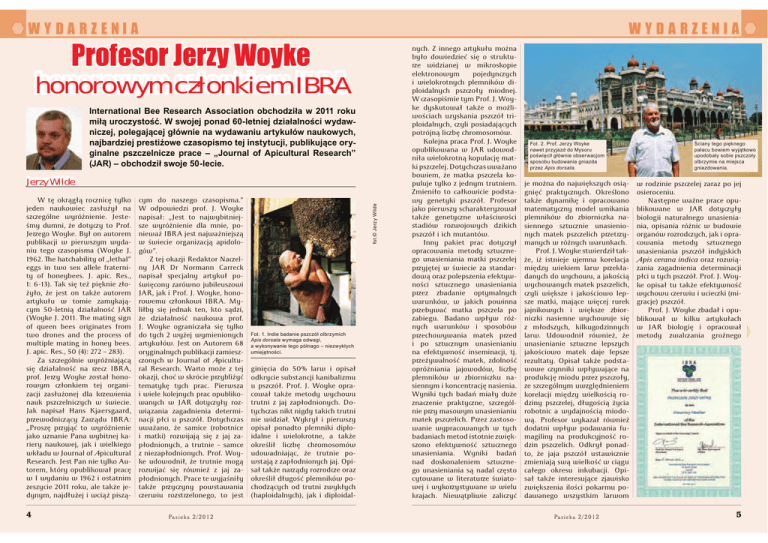 WYDARZENIA WYDARZENIA Profesor Jerzy Woyke honorowym członkiem IBRA International Bee Research Association obchodziła w 2011 roku miłą uroczystość. W swojej ponad 60-letniej działalności wydawniczej, polegającej głównie na wydawaniu artykułów naukowych, najbardziej prestiżowe czasopismo tej instytucji, publikujące oryginalne pszczelnicze prace – „Journal of Apicultural Research” (JAR) – obchodził swoje 50-lecie. W tę okrągłą rocznicę tylko jeden naukowiec zasłużył na szczególne wyróżnienie. Jesteśmy dumni, że dotyczy to Prof. Jerzego Woyke. Był on autorem publikacji w pierwszym wydaniu tego czasopisma (Woyke J. 1962. The hatchability of „lethal” eggs in two sex allele fraternity of honeybees. J. apic. Res., 1: 6-13). Tak się też pięknie złożyło, że jest on także autorem artykułu w tomie zamykającym 50-letnią działalność JAR (Woyke J. 2011. The mating sign of queen bees originates from two drones and the process of multiple mating in honey bees. J. apic. Res., 50 (4): 272 – 283). Za szczególnie wyróżniającą się działalność na rzecz IBRA, prof. Jerzy Woyke został honorowym członkiem tej organizacji zasłużonej dla krzewienia nauk pszczelniczych w świecie. Jak napisał Hans Kjaersgaard, przewodniczący Zarządu IBRA: „Proszę przyjąć to wyróżnienie jako uznanie Pana wybitnej kariery naukowej, jak i wielkiego wkładu w Journal of Apicultural Research. Jest Pan nie tylko Autorem, który opublikował pracę w I wydaniu w 1962 i ostatnim zeszycie 2011 roku, ale także jedynym, najdłużej i wciąż piszą- 4 cym do naszego czasopisma.” W odpowiedzi prof. J. Woyke napisał: „Jest to najwybitniejsze wyróżnienie dla mnie, ponieważ IBRA jest najważniejszą w świecie organizacją apidologów”. Z tej okazji Redaktor Naczelny JAR Dr Normann Carreck napisał specjalny artykuł poświęcony zarówno jubileuszowi JAR, jak i Prof. J. Woyke, honorowemu członkowi IBRA. Myliłby się jednak ten, kto sądzi, że działalność naukowa prof. J. Woyke ograniczała się tylko do tych 2 wyżej wymienionych artykułów. Jest on Autorem 68 oryginalnych publikacji zamieszczonych w Journal of Apicultural Research. Warto może z tej okazji, choć w skrócie przybliżyć tematykę tych prac. Pierwsza i wiele kolejnych prac opublikowanych w JAR dotyczyły rozwiązania zagadnienia determinacji płci u pszczół. Dotychczas uważano, że samice (robotnice i matki) rozwijają się z jaj zapłodnionych, a trutnie – samce z niezapłodnionych. Prof. Woyke udowodnił, że trutnie mogą rozwijać się również z jaj zapłodnionych. Prace te wyjaśniły także przyczyny powstawania czerwiu rozstrzelonego, to jest Pas ie ka 2 /2 0 12 fot.© Jerzy Wilde Jerzy Wilde Fot. 1. Indie badanie pszczół olbrzymich Apis dorsata wymaga odwagi, a wykonywanie tego półnago – niezwykłych umiejętności. ginięcia do 50% larw i opisał odkrycie substancji kanibalizmu u pszczół. Prof. J. Woyke opracował także metody wychowu trutni z jaj zapłodnionych. Dotychczas nikt nigdy takich trutni nie widział. Wykrył i pierwszy opisał ponadto plemniki diploidalne i wielokrotne, a także określił liczbę chromosomów udowadniając, że trutnie powstają z zapłodnionych jaj. Opisał także narządy rozrodcze oraz określił długość plemników pochodzących od trutni zwykłych (haploidalnych), jak i diploidal- nych. Z innego artykułu można było dowiedzieć się o strukturze widzianej w mikroskopie elektronowym pojedynczych i wielokrotnych plemników diploidalnych pszczoły miodnej. W czasopiśmie tym Prof. J. Woyke dyskutował także o możliwościach uzyskania pszczół triploidalnych, czyli posiadających potrójną liczbę chromosomów. Kolejna praca Prof. J. Woyke opublikowana w JAR udowodniła wielokrotną kopulację matki pszczelej. Dotychczas uważano bowiem, że matka pszczela kopuluje tylko z jednym trutniem. Zmieniło to całkowicie podstawy genetyki pszczół. Profesor jako pierwszy scharakteryzował także genetyczne właściwości stadiów rozwojowych dzikich pszczół i ich mutantów. Inny pakiet prac dotyczył opracowania metody sztucznego unasieniania matki pszczelej przyjętej w świecie za standardową oraz polepszenia efektywności sztucznego unasieniania przez zbadanie optymalnych warunków, w jakich powinna przebywać matka pszczela po zabiegu. Badano wpływ różnych warunków i sposobów przechowywania matek przed i po sztucznym unasienianiu na efektywność inseminacji, tj. przeżywalność matek, zdolność opróżniania jajowodów, liczbę plemników w zbiorniczku nasiennym i koncentrację nasienia. Wyniki tych badań miały duże znaczenie praktyczne, szczególnie przy masowym unasienianiu matek pszczelich. Przez zastosowanie wypracowanych w tych badaniach metod istotnie zwiększono efektywność sztucznego unasieniania. Wyniki badań nad doskonaleniem sztucznego unasieniania są nadal często cytowane w literaturze światowej i wykorzystywane w wielu krajach. Niewątpliwie zaliczyć Fot. 2. Prof. Jerzy Woyke nawet przyjazd do Mysoru poświęcił głównie obserwacjom sposobu budowania gniazda przez Apis dorsata. je można do największych osiągnięć praktycznych. Określono także dynamikę i opracowano matematyczny model wnikania plemników do zbiorniczka nasiennego sztucznie unasienionych matek pszczelich przetrzymanych w różnych warunkach. Prof. J. Woyke stwierdził także, iż istnieje ujemna korelacja między wiekiem larw przekładanych do wychowu, a jakością wychowanych matek pszczelich, czyli większe i jakościowo lepsze matki, mające więcej rurek jajnikowych i większe zbiorniczki nasienne wychowuje się z młodszych, kilkugodzinnych larw. Udowodnił również, że unasienianie sztuczne lepszych jakościowo matek daje lepsze rezultaty. Opisał także podstawowe czynniki wpływające na produkcję miodu przez pszczoły, ze szczególnym uwzględnieniem korelacji między wielkością rodziny pszczelej, dł