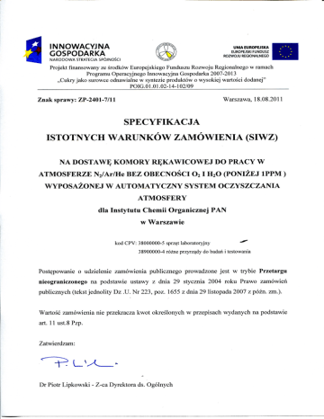 Specyfikacja Istotnych Warunków Zamówienia na dostawę komory rękawicowej do pracy w atmosferze N2/Ar/He bez obecności O2 i H2O (poniżej 1 ppm) wyposażonej w automatyczny system oczyszczania atmosfery 1. Informacje wprowadzające 1.1 Dane Zamawiającego: Instytut Chemii Organicznej Polskiej Akademii Nauk NIP: 525-000-89-33 REGON: 000325848 Dokładny adres do korespondencji: ul. Kasprzaka 44/52, 01-224 Warszawa Faks do korespondencji w sprawie Zamówienia: 22 632-66-81 E-mail do korespondencji w sprawie Zamówienia: [email protected] Znak Postępowania: ZP-2401-7/11 Strona, na której znajduje się SIWZ: http://www.icho.edu.pl/przetargi.php 1.2 Użyte w Specyfikacji terminy mają następujące znaczenie: 1.2.1 „Instytut”, „IChO PAN” lub „Zamawiający” – Instytut Chemii Organicznej PAN. 1.2.2 „Postępowanie” – postępowanie prowadzone przez Zamawiającego na podstawie niniejszej Specyfikacji. 1.2.3 „SIWZ” – niniejsza Specyfikacja Istotnych Warunków Zamówienia. 1.2.4 „Ustawa” lub „Pzp” - ustawa z dnia 29 stycznia 2004 r. - Prawo zamówień publicznych. 1.2.5 „Zamówienie” – należy przez to rozumieć zamówienie publiczne, którego przedmiot został w sposób szczegółowy opisany w punkcie 3 SIWZ. 1.2.6 „Wykonawca” – podmiot, który ubiega się o wykonanie Zamówienia, złoży ofertę na wykonanie Zamówienia lub zawrze z Zamawiającym umowę w sprawie wykonania Zamówienia. 1.3 W szczególnie uzasadnionych przypadkach Zamawiający ma prawo do zmiany treści Specyfikacji Istotnych Warunków Zamówienia. Zmiana może nastąpić w każdym czasie, przed upływem terminu do składania ofert. W przypadku wprowadzenia takiej zmiany, informacja o tym zostanie niezwłocznie zamieszczona na stronie Zamawiającego, oraz przekazana wszystkim podmiotom, które pobrały od Zamawiającego Specyfikację i będzie dla nich wiążąca. 2. Tryb udzielenia Zamówienia: 2.1. Postępowanie o udzielenie Zamówienia prowadzone jest w trybie Przetargu nieograniczonego na podstawie ustawy z dnia 29 stycznia 2004 roku Prawo zamówień publicznych (tekst jednolity Dz. U. Nr 223, poz. 1655 z dnia 29 listopada 2 Specyfikacja Istotnych Warunków Zamówienia na dostawę komory rękawicowej do pracy w atmosferze N2/Ar/He bez obecności O2 i H2O (poniżej 1 ppm) wyposażonej w automatyczny system oczyszczania atmosfery 2007 z późniejszymi zmianami), przepisów wykonawczych wydanych na jej podstawie oraz niniejszej Specyfikacji Istotnych Warunków Zamówienia. 3. Opis przedmiotu Zamówienia: 3.1.Przedmiotem Zamówienia jest dostawa komory rękawicowej do pracy w atmosferze gazów obojętnych N2/Ar/He, osiągalna czystość atmosfery roboczej we wnętrzu komory ≤ 1 ppm O2/H2O, wyposażonej w automatyczny system oczyszczania atmosfery dla Instytutu Chemii Organicznej PAN w Warszawie, jego instalacja i uruchomienie w siedzibie Zamawiającego oraz przeszkolenie użytkowników w zakresie obsługi i eksploatacji urządzenia. 3.2.Szczegółowy opis przedmiotu zamówienia: Komora rękawicowa do pracy w atmosferze N2/Ar/He, osiągalna czystość atmosfery roboczej we wnętrzu komory ≤ 1 ppm O2/H2O, wyposażona w automatyczny system oczyszczania atmosfery musi spełniać wymagania nie gorsze niż: Komora główna: 1) Komora, gotowa do użycia z możliwością rozbudowy, wyposażona w programowalny, automatyczny system oczyszczania atmosfery z regeneracją złoża; 2) Materiał z którego wykonana jest komora: a) wnętrze - wysokiej jakości stal nierdzewna, wykonanie bezszwowe komory, b) część zewnętrzna - stal nierdzewna lakierowana, rurowanie wykonane z miedzi; 3) Przeznaczona do pracy w wewnętrznej atmosferze azotu, argonu lub helu; 4) Osiągalna czystość atmosfery roboczej we wnętrzu komory ≤1 ppm H2O/O2 w układzie dynamicznym zamkniętym; 5) Dopuszczalne rozszczelnienie układu (wyciek gazu obojętnego z komory), mierzone zgodnie z normą ISO 10648-2 (metoda tlenowa): poniżej 0,05% obj./godz. i zgodnie z normą ISO 25412 (metoda ciśnieniowa): poniżej 0,05% obj./godz. (potwierdzić oryginalną dokumentacją producenta) 6) Wymiary komory głównej (wewnętrzne) nie mniejsze niż 1200 x 750 x 900 mm (szer. x głęb. x wys.); 3 Specyfikacja Istotnych Warunków Zamówienia na dostawę komory rękawicowej do pracy w atmosferze N2/Ar/He bez obecności O2 i H2O (poniżej 1 ppm) wyposażonej w automatyczny system oczyszczania atmosfery 7) Wyposażona na frontowej części w dwa porty rękawicowe z rękawicami (średnica otworów/przepustów rękawicowych min 21 cm, z pierścieniem uszczelniającym). Rękawice hypalonowe o grubości między 0,4 a 0,5 mm. 8) Komora wyposażona w stelaż z kółkami; kółka z blokadą. 9) Komora wyposażona w co najmniej 6 demontowalnych półek, wykonanych ze stali nierdzewnej instalowanych na tylniej ścianie. 10) Komora wyposażona w min. 2 szt. flansz, standard DN40KF, zlokalizowanych na ścianie tylnej do instalacji przepustów na media. 11) Jeden przepust izolowany próżniowo z kablem 3 m (230V/1P/16A) do zasilania urządzeń elektrycznych znajdujących się wewnątrz komory. 12) W wyposażeniu: filtr HEPA H13, szt. 2. Komora wstępna: 1) Śluza cylindryczna o wymiarach nie mniejszych niż 380 cm (średnica wewnętrzna), 600 mm (długość); 2) System wymiany atmosfery poprzez śluzę obsługiwany manualnie; 3) Śluza zlokalizowana po lewej stronie; 4) Wyposażona w przesuwaną półkę; 5) Wykonana ze stali nierdzewnej; 6) Drzwi śluzy wykonane z anodyzowanego aluminium; 7) Wyposażona w manometr wskaźnikowy ciśnienia. Mini śluza: 1) Cylindryczna o wymiarach nie mniejszych niż 150 mm (średnica wewnętrzna), 400 mm (długość); 2) Zlokalizowana po lewej stronie; 3) Wyposażona w manometr wskaźnikowy ciśnienia; 4) System wymiany atmosfery poprzez śluzę obsługiwany manualnie 4 Specyfikacja Istotnych Warunków Zamówienia na dostawę komory rękawicowej do pracy w atmosferze N2/Ar/He bez obecności O2 i H2O (poniżej 
