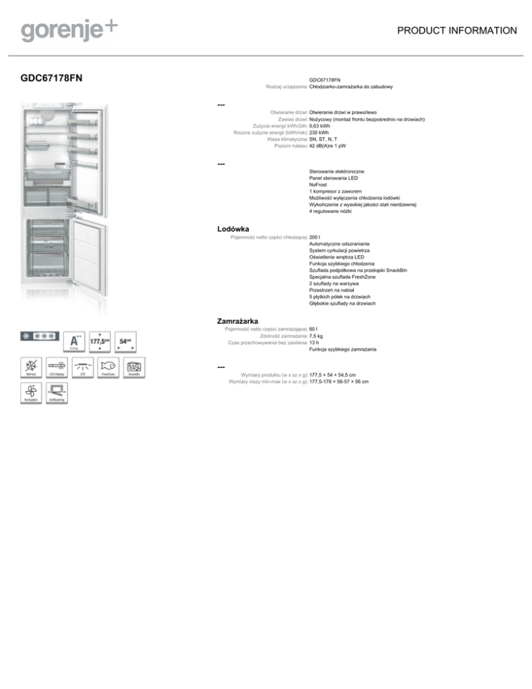 PRODUCT INFORMATION GDC67178FN GDC67178FN Rodzaj urządzenia: Chłodziarko-zamrażarka do zabudowy --Otwieranie drzwi: Otwieranie drzwi w prawo/lewo Zawias drzwi: Nożycowy (montaż frontu bezpośrednio na drzwiach) Zużycie energii kWh/24h: 0,63 kWh Roczne zużycie energii (kWh/rok): 230 kWh Klasa klimatyczna: SN, ST, N, T Poziom hałasu: 42 dB(A)re 1 pW -- Sterowanie elektroniczne Panel sterowania LED NoFrost 1 kompresor z zaworem Możliwość wyłączenia chłodzenia lodówki Wykończenie z wysokiej jakości stali nierdzewnej 4 regulowane nóżki Lodówka Pojemność netto części chłodzącej: 200 l Automatyczne odszranianie System cyrkulacji powietrza Oświetlenie wnętrza LED Funkcja szybkiego chłodzenia Szuflada podpółkowa na przekąski SnackBin Specjalna szuflada FreshZone 2 szuflady na warzywa Przestrzeń na nabiał 5 płytkich półek na drzwiach Głębokie szuflady na drzwiach Zamrażarka Pojemność netto części zamrażającej: 60 l Zdolność zamrażania: 7,5 kg Czas przechowywania bez zasilania: 13 h Funkcja szybkiego zamrażania --Wymiary produktu (w x sz x g): 177,5 × 54 × 54,5 cm Wymiary niszy min-max (w x sz x g): 177,5-178 × 56-57 × 56 cm
