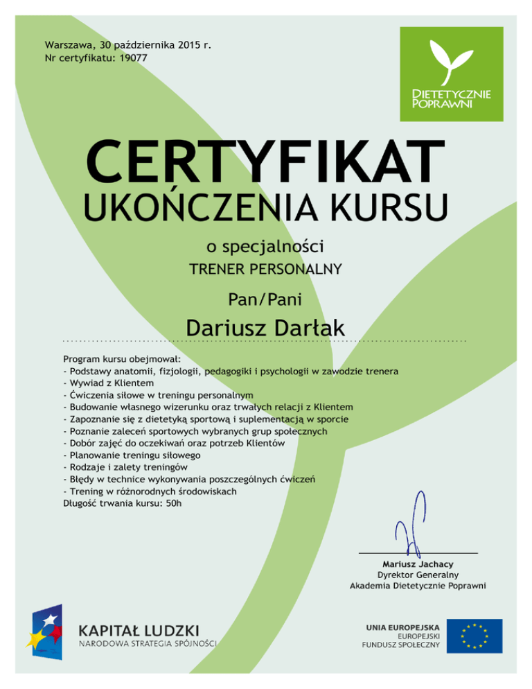 kurs instruktorów rekreacji ruchowej w dziedzinie trener personalny