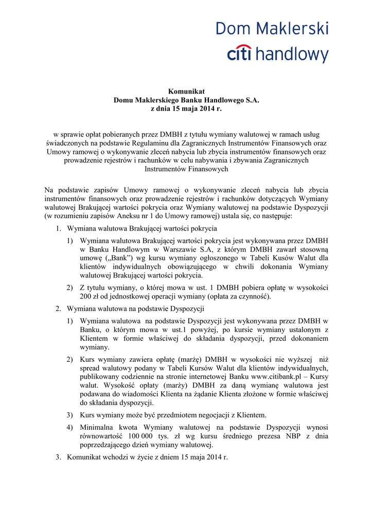 Komunikat Domu Maklerskiego Banku Handlowego S.A. z dnia 15 maja 2014 r. w sprawie opłat pobieranych przez DMBH z tytułu wymiany walutowej w ramach usług świadczonych na podstawie Regulaminu dla Zagranicznych Instrumentów Finansowych oraz Umowy ramowej o wykonywanie zleceń nabycia lub zbycia instrumentów finansowych oraz prowadzenie rejestrów i rachunków w celu nabywania i zbywania Zagranicznych Instrumentów Finansowych Na podstawie zapisów Umowy ramowej o wykonywanie zleceń nabycia lub zbycia instrumentów finansowych oraz prowadzenie rejestrów i rachunków dotyczących Wymiany walutowej Brakującej wartości pokrycia oraz Wymiany walutowej na podstawie Dyspozycji (w rozumieniu zapisów Aneksu nr 1 do Umowy ramowej) ustala się, co następuje: 1. Wymiana walutowa Brakującej wartości pokrycia 1) Wymiana walutowa Brakującej wartości pokrycia jest wykonywana przez DMBH w Banku Handlowym w Warszawie S.A, z którym DMBH zawarł stosowną umowę („Bank”) wg kursu wymiany ogłoszonego w Tabeli Kusów Walut dla klientów indywidualnych obowiązującego w chwili dokonania Wymiany walutowej Brakującej wartości pokrycia. 2) Z tytułu wymiany, o której mowa w ust. 1 DMBH pobiera opłatę w wysokości 200 zł od jednostkowej operacji wymiany (opłata za czynność). 2. Wymiana walutowa na podstawie Dyspozycji 1) Wymiana walutowa na podstawie Dyspozycji jest wykonywana przez DMBH w Banku, o którym mowa w ust.1 powyżej, po kursie wymiany ustalonym z Klientem w formie właściwej do składania dyspozycji, przed dokonaniem wymiany. 2) Kurs wymiany zawiera opłatę (marżę) DMBH w wysokości nie wyższej niż spread walutowy podany w Tabeli Kursów Walut dla klientów indywidualnych, publikowany codziennie na stronie internetowej Banku www.citibank.pl – Kursy walut. Wysokość opłaty (marży) DMBH za daną wymianę walutowa jest podawana do wiadomości Klienta na żądanie Klienta złożone w formie właściwej do składania dyspozycji. 3) Kurs wymiany może być przedmiotem negocjacji z Klientem. 4) Minimalna kwota Wymiany walutowej na podstawie Dyspozycji wynosi równowartość 100 000 tys. zł wg kursu średniego prezesa NBP z dnia poprzedzającego dzień wymiany walutowej. 3. Komunikat wchodzi w życie z dniem 15 maja 2014 r.