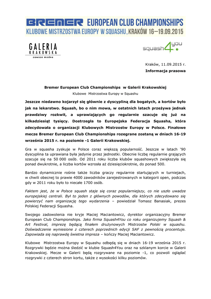 Kraków, 11.09.2015 r. Informacja prasowa Bremer European Club Championships w Galerii Krakowskiej Klubowe Mistrzostwa Europy w Squashu Jeszcze niedawno kojarzył się głównie z dyscypliną dla bogatych, a kortów było jak na lekarstwo. Squash, bo o nim mowa, w ostatnich latach przeżywa jednak prawdziwy kilkadziesiąt rozkwit, a uprawiających tysięcy. Dostrzegła to go regularnie szacuje Europejska Federacja się już na Squasha, która zdecydowała o organizacji Klubowych Mistrzostw Europy w Polsce. Finałowe mecze Bremer European Club Championships rozegrane zostaną w dniach 16-19 września 2015 r. na poziomie -1 Galerii Krakowskiej. Gra w squasha zyskuje w Polsce coraz większą popularność. Jeszcze w latach ‘90 dyscyplina ta uprawiana była jedynie przez jednostki. Obecnie liczbę regularnie grających szacuje się na 50 000 osób. Od 2011 roku liczba klubów squashowych zwiększyła się ponad dwukrotnie, a liczba kortów wzrosła aż dziesięciokrotnie, do ponad 500. Bardzo dynamicznie rośnie także liczba graczy regularnie startujących w turniejach, w chwili obecnej to prawie 4000 zawodników zarejestrowanych w kategorii open, podczas gdy w 2011 roku było to niecałe 1700 osób. Faktem jest, że w Polsce squash staje się coraz popularniejszy, co nie uszło uwadze europejskiej centrali. Był to jeden z głównych powodów, dla których zdecydowano się powierzyć nam organizację tego wydarzenia – powiedział Tomasz Banasiak, prezes Polskiej Federacji Squasha. Swojego zadowolenia nie kryje Maciej Maciantowicz, dyrektor organizacyjny Bremer European Club Championships. Jako firma Squash4You co roku organizujemy Squash & Art Festival, imprezę będącą finałem drużynowych Mistrzostw Polski w squashu. Doświadczenie wyniesione z czterech poprzednich edycji SAF z pewnością procentuje. Zapowiada się naprawdę świetna impreza – kończy Maciej Maciantowicz. Klubowe Mistrzostwa Europy w Squashu odbędą się w dniach 16-19 września 2015 r. Rozgrywki będzie można śledzić w klubie Squash4You oraz na szklanym korcie w Galerii Krakowskiej. Mecze w Galerii będą rozgrywane na poziomie -1, co pozwoli oglądać rozgrywki z czterech stron kortu, także z wysokości kilku poziomów. W zawodach udział weźmie 15 drużyn męskich oraz 9 damskich. Uczestnicy zostali wyłonieni na podstawie krajowych rozgrywek, w zawodach wezmą udział mistrzowie swoich krajów oraz obrońcy tytułu z poprzedniej edycji. Swój udział w imprezie zapowiedzieli zawodnicy światowej czołówki, m.in.: Wśród mężczyzn: • nr 6 światowego squasha Simon Rosner, • nr 11 Mathieu Castagnet, • nr 43 Raphael Kandra, • David Palmer (II-krotny Mistrz Świata, były nr 1 na światowego rankingu), • Thierry Lincou (były Mistrz Świata, były nr 1 na światowego rankingu). Wśród kobiet: • nr 3 Camille Serme, • nr 11 Sarah-Jane Perry, • nr 13 Emma Beddoes, • Lucie Fialova (brązowa medalistka Mistrzostw Europy). Na turnieju pojawi się także ścisła czołówka z Polski, m.in.: • Mateusz Kotra – aktualny Mistrz Polski, • Wojciech Nowisz – wielokrotny Mistrz Polski, • Dominika Witkowska – ośmiokrotna Mistrzyni Polski. Polskę reprezentować będą cztery drużyny: Zespoły kobiece: • Malaka Squash Ladies Team • Lifestyles.expert Squash4You Zespoły męskie: • Simple Kahuna Team • Lifestyles.expert Squash4You PROGRAM: 16.09.2015 - ŚRODA 9.30-19.00 Mecze pierwszych rund turnieju - damskie oraz męskie (Squash4You Północ) 17.09.2015 - CZWARTEK 9.00-18.00 Mecze dalszych rund turnieju, w tym w sesji popołudniowej ćwierćfinały męskie (Squash4You Północ) 12.00-13.45 Atrakcje dla publiczności - zajęcia oraz konkursy prowadzone przez ambasadorów Under Armour: Dominikę Witkowską - VII-krotną Mistrzynię Polski w squashu oraz Justynę Żurowską - najlepszą zawodniczkę Polskiej Ligi Koszykówki (szklany kort w Galerii Krakowskiej) 14.45-15.00 Niespodzianka Krakowskiej) squashowa dla publiczności (szklany kort w Galerii 15.00-18.00 Ćwierćfinał męski, wybrany mecz (szklany kort w Galerii Krakowskiej) 18.00-22.00 Ćwierćfinał męski, wybrany mecz (szklany kort w Galerii Krakowskiej) 18.09.2015 - PIĄTEK 9.30-11.30 Półfinał damski, para nr 1 (szklany kort w Galerii Krakowskiej) 10.00-17.00 Mecze dalszych rund turnieju - damskie oraz męskie (Squash4You Północ) 11.30-15.00 Półfinał mężczyzn, para nr 1 (szklany kort w Galerii Krakowskiej) 15.00-17.00 Półfinał damski, para nr 2 (szklany kort w Galerii Krakowskiej) 17.00-21.30 Półfinał mężczyzn, para nr 2 (szklany kort w Galerii Krakowskiej) 19.09.2015 - SOBOTA 10.00-12.00 Mecz o trzecie miejsce kobiet (szklany kort w Galerii Krakowskiej) 10.00-14.00 Mecz o trzecie miejsce mężczyzn oraz dalsze mecze turnieju - damskie oraz męskie (Squash4You Północ) 12.00-14.00 Finał damski (szklany kort w Galerii Krakowskiej) 14.00-14.30 Pokaz taneczny oraz show ambasadora marki Under Armour Karola Serwina - wielokrotnego Mistrza Polski w trialu rowerowym (szklany kort w Galerii Krakowskiej) 14.30-19.00 Finał męski (szklany kort w Galerii Krakowskiej) 19.00-19.30 Ceremonia zakończenia Mistrzostw Europy w squashu (szklany kort w Galerii Krakowskiej) 19.30- 22.00 Darmowe lekcje squasha z instruktorami oraz konkursy dla publiczności (szklany kort w Galerii Krakowskiej) od 21.00 Oficjalna kolacja dla wszystkich zawodników w restauracji La Grande Mamma (Rynek Główny 26) od 23.30 After party kończące turniej w klubie Shine (ul. Starowiślna 16) Więcej informacji udziela: Przyjmowanie zgłoszeń, wejściówki, informacje dodatkowe: Katarzyna Zygan, [email protected], tel. 500 497 222 Marketing, Art, arena przy szklanym korcie, informacje dodatkowe: Marek Januszkiewicz, [email protected], tel. 500 497 111 Współpraca z mediami, PR: Maciek Wernicki, [email protected], tel. 513 066 019