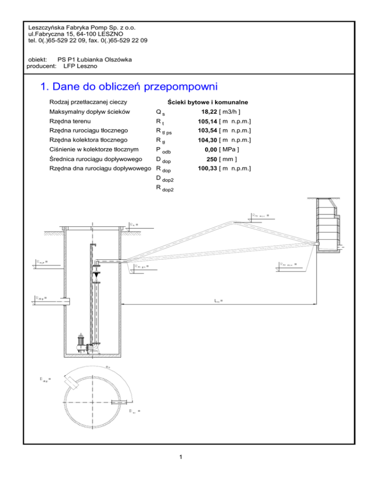 Leszczyńska Fabryka Pomp Sp. z o.o. ul.Fabryczna 15, 64-100 LESZNO tel. 0(.)65-529 22 09, fax. 0(.)65-529 22 09 obiekt: PS P1 Łubianka Olszówka producent: LFP Leszno 1. Dane do obliczeń przepompowni Rodzaj przetłaczanej cieczy Ścieki bytowe i komunalne Maksymalny dopływ ścieków Qs Rzędna terenu Rt 105,14 [ m n.p.m.] Rzędna rurociągu tłocznego R tl ps 103,54 [ m n.p.m.] Rzędna kolektora tłocznego R tł 104,30 [ m n.p.m.] Ciśnienie w kolektorze tłocznym P odb D dop Średnica rurociągu dopływowego 18,22 [ m3/h ] 0,00 [ MPa ] 250 [ mm ] Rzędna dna rurociągu dopływowego R dop D dop2 100,33 [ m n.p.m.] R dop2 α= 1 Leszczyńska Fabryka Pomp Sp. z o.o. ul.Fabryczna 15, 64-100 LESZNO tel. 0(.)65-529 22 09, fax. 0(.)65-529 22 09 obiekt: PS P1 Łubianka Olszówka producent: LFP Leszno 2. Wyniki doboru przepompowni Klucz przepompowni : PS2 IF1 1000/80T 80 / 80 BT1500 - 6,8 3. Parametry dobranej pompy Nazwa pompy : IF1 1000/80T Typ wirnika: wirnik Vortex 3.1. Wymagane parametry pompy Wydajność 18,20 [m3/h] Podnoszenie 14,19 [m] 3.2. Nominalne parametry pompy Wydajność 150,00 [m3/h] Podnoszenie 9,00 [m] Moc 8,90 [kW] Obroty pompy 1450 [obr/min] 3.3. Rzeczywiste parametry pracy 1 pompa 2 pompy Wydajność pompowni 20,92 21,46 [m3/h] Wydajność 20,92 10,73 [m3/h] Podnoszenie 17,18 17,50 [m] Moc 4,18 4,04 [kW] Sprawność 0,24 0,24 [-] Czas pompowania Liczba włączeń 19,59 22,85 [min] 5,92 2,96 [1/h] ZuŜycie jednostkowe 0,2032 0,3835 [kWh/m3] Koszt jednostkowy 0,0610 0,1150 [PLN/m3] 2 Leszczyńska Fabryka Pomp Sp. z o.o. ul.Fabryczna 15, 64-100 LESZNO tel. 0(.)65-529 22 09, fax. 0(.)65-529 22 09 obiekt: PS P1 Łubianka Olszówka producent: LFP Leszno 4. Charakterystyki pracy przepompowni Typ pompy : IF1 1000/80T H [m] 18 H 16 14 12 10 8 6 4 2 0 20 40 60 80 100 120 140 160 180 Q [m3/h] P [kW] P 8 6 4 2 0 20 40 60 80 100 120 140 160 180 120 140 160 180 η [−] 0,8 0,6 ETA 0,4 0,2 0,0 20 40 60 80 100 3 Leszczyńska Fabryka Pomp Sp. z o.o. ul.Fabryczna 15, 64-100 LESZNO tel. 0(.)65-529 22 09, fax. 0(.)65-529 22 09 obiekt: PS P1 Łubianka Olszówka producent: LFP Leszno 5. Zbiornik Nazwa zbiornika BT, D=1500 Wysokość zbiornika Średnica zbiornika Wysokość retencyjna Zapas alarmowy Rzędna alarmowa Rzędna górnego poziomu ścieków 6,83 [ m 1,50 [ m 0,50 [ m 0,20 [ m 100,11 [ m 99,91 [ m Rzędna dolnego poziomu ścieków Rzędna dna zbiornika Objętość retencyjna Liczba pomp Czas napełniania Dopuszczalna liczba włączeń ] ] ] ] ] ] 1800 180 650 500 250 6830 500 5030 500 500 500 500 500 Poz. tłoczenia 90 500 500 500 105,14 Rzędna terenu Poz. dopływu 1 100,33 Rzędna dna dopływu Poz. alarmowy 150 750 250 1500 Poz. minimum 1500 1800 4 98,51 Rzędna posadowienia 90 1820 1450 1250 Poz. maksimum 99,41 [ m ] 98,66 [ m ] 0,88 [ m3 ] 2[-] 2,91 [ min ] 10,00 [ 1/h ] Leszczyńska Fabryka Pomp Sp. z o.o. ul.Fabryczna 15, 64-100 LESZNO tel. 0(.)65-529 22 09, fax. 0(.)65-529 22 09 obiekt: PS P1 Łubianka Olszówka producent: LFP Leszno PS2 IF1 1000/80T 80 / 80 BT1500 - 6,8 Rp 105,34 Dwew 1,50 Rt 105,14 Ddop 250 Rtł 103,54 Dtł 80 Rdop 100,33 α 180 Rdna 98,51 Hc 6,83 5 Leszczyńska Fabryka Pomp Sp. z o.o. ul.Fabryczna 15, 64-100 LESZNO tel. 0(.)65-529 22 09, fax. 0(.)65-529 22 09 obiekt: PS P1 Łubianka Olszówka producent: LFP Leszno 6. Elementy rurociągu tłocznego Wydajność obliczeniowa Q =20,92 [ m3/h ] Pracuje 1 pompa Lp. Nazwa elementu Ilość Średnica wew.[mm]Opór [m] V przepł. [m/s] 0 Pion80 1 80,00 0,41 1,16 1 2 Rura PE-80 PN6 90 Kol ostre 90ř 80 cz 660 2 79,6 81,0 11,72 0,16 1,17 1,13 Wydajność obliczeniowa Q =21,46 [ m3/h ] Pracują 2 pompy Lp. Nazwa elementu Ilość Średnica wew.[mm]Opór [m] V przepł. [m/s] 0 Pion80 2 80,00 0,11 0,59 1 2 Rura PE-80 PN6 90 Kol ostre 90ř 80 cz 660 2 79,6 81,0 12,34 0,16 1,20 1,16 6