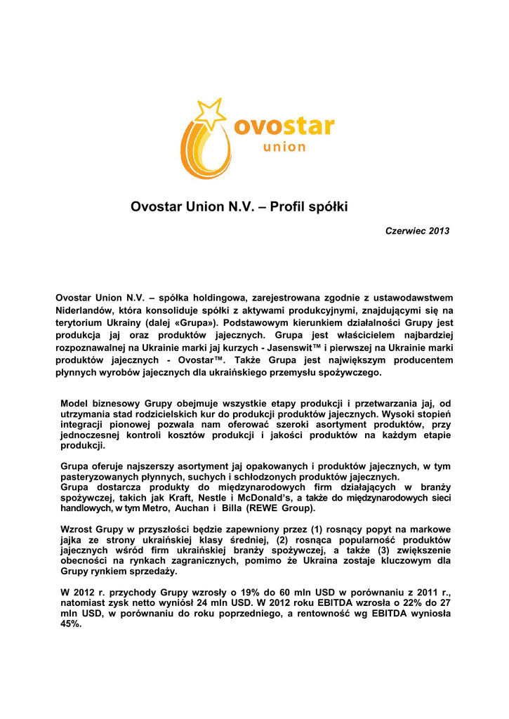 Ovostar Union N.V. – Profil spółki Czerwiec 2013 Ovostar Union N.V. – spółka holdingowa, zarejestrowana zgodnie z ustawodawstwem Niderlandów, która konsoliduje spółki z aktywami produkcyjnymi, znajdującymi się na terytorium Ukrainy (dalej «Grupa»). Podstawowym kierunkiem działalności Grupy jest produkcja jaj oraz produktów jajecznych. Grupa jest właścicielem najbardziej rozpoznawalnej na Ukrainie marki jaj kurzych - Jasenswit™ i pierwszej na Ukrainie marki produktów jajecznych - Ovostar™. Także Grupa jest największym producentem płynnych wyrobów jajecznych dla ukraińskiego przemysłu spożywczego. Model biznesowy Grupy obejmuje wszystkie etapy produkcji i przetwarzania jaj, od utrzymania stad rodzicielskich kur do produkcji produktów jajecznych. Wysoki stopień integracji pionowej pozwala nam oferować szeroki asortyment produktów, przy jednoczesnej kontroli kosztów produkcji i jakości produktów na każdym etapie produkcji. Grupa oferuje najszerszy asortyment jaj opakowanych i produktów jajecznych, w tym pasteryzowanych płynnych, suchych i schłodzonych produktów jajecznych. Grupa dostarcza produkty do międzynarodowych firm działających w branży spożywczej, takich jak Kraft, Nestle i McDonald’s, a także do międzynarodowych sieci handlowych, w tym Metro, Auchan i Billa (REWE Group). Wzrost Grupy w przyszłości będzie zapewniony przez (1) rosnący popyt na markowe jajka ze strony ukraińskiej klasy średniej, (2) rosnąca popularność produktów jajecznych wśród firm ukraińskiej branży spożywczej, a także (3) zwiększenie obecności na rynkach zagranicznych, pomimo że Ukraina zostaje kluczowym dla Grupy rynkiem sprzedaży. W 2012 r. przychody Grupy wzrosły o 19% do 60 mln USD w porównaniu z 2011 r., natomiast zysk netto wyniósł 24 mln USD. W 2012 roku EBITDA wzrosła o 22% do 27 mln USD, w porównaniu do roku poprzedniego, a rentowność wg EBITDA wyniosła 45%. PRZEGLĄD BIZNESOWY Ovostar Union N.V. jest jednym z wiodących producentów jaj i produktów jajecznych na rynku ukraińskim, który specjalizuje się na produkcji produktów markowych wysokiej jakości. Grupa jest właścicielem dwóch marek handlowych: dla jaj - Jasenswit™, dla produktów jajecznych - Ovostar™. Model biznesowy Grupy charakteryzuje się wysokim stopniem integracji pionowej, który pozwala oferować szeroki asortyment produktów, przy jednoczesnej kontroli kosztów produkcji i jakości produktów na każdym etapie produkcji. Wszystkie zakłady produkcyjne Gruby są skoncentrowane w Kijowskiej i Czerkaskiej obłasti (w granicach 130 km od siebie nawzajem), co pozwala zoptymalizować logistykę. Moc produkcyjna Grupy obejmuje farmy ze stadami rodzicielskimi, inkubator, dwie farmy do hodowli młodych kur niosek, dwie farmy do produkcji jaj, dwie wytworni pasz, produkujące pokarm dla ptaków, a także jeden elewator. Na terytorium jednej z farm do produkcji jaj znajduje się zakład przetwórstwa jaj Ovostar. Stanem na koniec roku 2012 ogólna ilość pogłowia niosek wyniosła 3,1, mln. Zakłady produkcyjne Grupy znajdują się na terenach wiejskich, oddalonych od zakładów przemysłowych i autostrad, co zapewnia czystość ekologiczną produkowanych wyrobów. W 2012 roku Grupa wyprodukowała 719 milionów jaj i 6,652 ton produktów jajecznych. Grupa zwiększyła produkcję jaj o 15%, produktów jajecznych - o 28% w stosunku do poprzedniego roku. W 2012 r. wielkość sprzedaży jajka wyniosła 445 mln. sztuk. Wzrost sprzedaży jaj markowych przyczynił się do wzrostu średniej ceny sprzedaży jajka o 6% do USD 0,83 za tuzin bez VAT. Struktura przychodów Grupy Udział segmentu «Jajko» w zysku ogólnym wyniósł 64% udział segmentu «Produkty jajeczne» - 29% , udział segmentu «Słonecznik» - 7% od łącznego zysku w roku 2012. Segment jajka Grupa produkuje jaja, sprzedaż których realizowana jest przy wykorzystaniu czterech głównych kanałów dystrybucji. Głównymi kanałami dystrybucji są sieci handlowe i własne punkty sprzedaży detalicznej, których łączny udział wynosi ok.83% ogólnego przychodu segmentu „jajko” w roku 2012. Jajeczna marka Grupy Jasenswit™ na rynku już od 12 lat i jest najbardziej rozpoznawaną marką jaj kurzych na Ukrainie. Grupa także realizuje jajka pod ekonom-marką Ukraina™ i pod markami handlowymi private label dużych sieci sklepów detalicznych, takich jak Metro, Auchan, Billa itd. Grupa eksportuje swoje produkty głównie w celu minimalizacji ryzyka walutowego, ponieważ niektóre z zaciągniętych przez Grupę kredytów, jak również niewielka część kosztów na materiałów są denominowane w walutach obcych. Niewielka część jaj sprzedawana jest klientom B2B, takim jak piekarnie i organizacji HoReCa, którym w procesie produkcji potrzebne są jajka w skorupce. Segment produktów jajecznych Grupa realizuje produkty jajeczne pod dobrze rozpoznawaną marką Ovostar™. Grupa oferuje najbardziej kompletny asortyment płynnych i suszonych produktów jajecznych. Produkty jajeczne produkowane przez Grupę kupowane są przez czołowe firmy branży spożywczej, takie jak Kraft i Nestle, a także firmy HoReCa, takich jak McDonald's, dla której Grupa jest ekskluzywnym dostawcą produktów jajecznych. Suszone i płynne produkty jajeczne są wykorzystywane w produkcji takich produktów spożywczych jak sosy, półfabrykaty, pieczywo i makaron. Produkty jajeczne, szczególnie płynne, będą w dalszym ciągu uzyskiwać popularność na rozwijających się rynkach, takich jak ukraiński. SYTUACJA RYNKOWA Ukraina jest jednym z wiodących krajów-producentów zboża i słonecznika, głównych składników pasz dla drobiu, co zapewnia stosunkowo niski koszt produkcji jaj. W 2012 r. produkcja jaj na Ukrainie wzrosła o 2% w porównaniu z rokiem poprzednim do 19 mld. sztuk. Udział produkcji przemysłowej jaj wyniosła 11 mld. sztuk. Produkcja przemysłowa jaj na Ukrainie Pozostali producenci Ovostar Unio