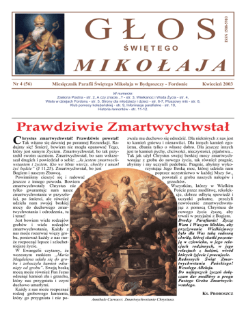 ISSN 1508-5910 GŁOS ŚWIĘTEGO MIKOŁAJA Nr 4 (56) Miesięcznik Parafii Świętego Mikołaja w Bydgoszczy - Fordonie Kwiecień 2003 W numerze: Zasłona Postna - str. 2, A czy znacie...? - str. 3, Wielkanoc i Woda Życia - str. 4, Wisła w dziejach Fordonu - str. 5, Strony dla młodzieży i dzieci - str. 6-7, Pluszowy miś - str. 8, Klub pomocy koleżeńskiej - str. 9, Informacje parafialne - str. 10, Historia remontów - str. 11-12. Prawdziwie Zmartwychwstał C zwala mu duchowo się odrodzić. Dla niektórych z nas jest hrystus zmartwychwstał! Prawdziwie powstał! to kamień gniewu i nienawiści. Dla innych kamień egoTak witano się dawniej po porannej Rezurekcji. Raizmu, dbania tylko o własne dobro. Dla jeszcze innych dujmy się! Śmierć, bowiem nie mogła opanować Tego, jest to kamień pychy, chciwości, nieczystości, pijaństwa... który jest samym Życiem. Zmartwychwstał, bo tak przyTak jak użył Chrystus swojej boskiej mocy zmartwychrzekł swoim uczniom. Zmartwychwstał, bo sam wskrzewstając z grobu do nowego życia, tak również pragnie, szał drugich i powiedział o sobie: „Ja jestem zmartwychabyśmy i my uczynili podobnie. Pragnie, abyśmy wykowstaniem i życiem. Kto we Mnie wierzy, choćby i umarł żyć będzie” (J 11,25). Zmartwychwstał, bo jest rzystując Jego Boską moc, której udziela nam Bogiem i naszym Zbawcą. poprzez uczestnictwo w każdej Mszy św., Powinniśmy cieszyć się i radować powstali z grobu naszych nałogów i jeszcze z innego powodu. Bowiem grzechów. zmartwychwstały Chrystus nie Wszystkim, którzy w Wielkim tylko gwarantuje nam nasze Poście przez modlitwę, rekolekcje, dobrze odbytą spowiedź i zmartwychwstanie w przyszłouczynki pokutne, przeżyli ści, po śmierci, ale również nawrócenie zmartwychwstaudziela nam swojej boskiej jąc z pomocą Chrystusa do mocy do duchowego zmarnowego życia życzę, aby twychwstania i odrodzenia, tu trwali w przyjaźni z Bogiem. i teraz! Jest bowiem wiele rodzajów Drodzy Parafianie! Życzę grobów i wiele rodzajów Wam i Waszym bliskim, aby zmartwychwstania. Każdy z przeżywanie Wielkiejnocy nas może rozerwać więzy grobyło dla Was taką radosną bu, ponieważ każdy z nas mochwilą, której skutki pozostaże rozpocząć lepsze i szlachetją w człowieku, w jego relaniejsze życie. cjach rodzinnych, w jego W Ewangelii czytamy, że relacjach z ludźmi, wśród wczesnym rankiem „Maria których żyjecie i pracujecie. Radosnych Świąt ZmarMagdalena udała się do grotwychwstania Pańskiego! bu i zobaczyła kamień odsunięty od grobu”. Swoją boską Wesołego Alleluja. mocą może również Pan Jezus Do najlepszych życzeń dołąodsunąć kamień zła i grzechu, czam dar modlitwy u progu który nas przygniata i czyni Pustego Grobu Zmartwychduchowo umarłymi. wstałego. Każdy z nas może rozpoznać rodzaj grobowego kamienia, KS. PROBOSZCZ który go przygniata i nie poAnnibale Carracci. Zmartwychwstanie Chrystusa. GŁOS ŚWIĘTEGO MIKOŁAJA Nr 4 (56) El Loko. Pokój. 2 W piątą niedzielę Wielkiego Postu zakrywa się w naszych kościołach krzyże aż do Wielkiego Piątku. W Europie Zachodniej istnieje zwyczaj pochodzący z XI wieku, gdy zakrywano ołtarze już na początku Wielkiego Postu. Czyniono tak nie tylko dlatego, by przykryć bogactwo ornamentów na ołtarzu głównym, ale zakrywano ołtarz ofiarny, by w czasie Wielkiego Postu nie oglądać boskich tajemnic Eucharystii. W Kościele Wschodnim zasłona ta pozostała na stałe (tzw. ikonostas) i właściwej części Ofiary Eucharystycznej wierni nie widzą. Taką zasłonę postną przedstawiłem w kościele św. Mikołaja w Niedzielę Pasyjną (6 kwietnia br.). Pracuję w parafii niemieckiej, gdzie zwyczaj ten został w 1976 r. odrodzony i połączony z akcją pomocy dla trzeciego świata (Mizereor). Z tym, że ta „nowoczesna” zasłona nie zakrywa ołtarza, na którym sprawuje się Ofiarę Eucharystyczną, ale przez symboliczne obrazy pobudza do zastanowienia. Tegoroczną zasłonę postną pt.: „Pokój” namalował w 2002 r. artysta El Loko pochodzący z Togo. Artysta namalował tę chustę jako tryptyk. Dopiero, gdy te trzy części połączymy - powstaje całość. To jest symbolem Kościoła. Wtedy, gdy poszczególni chrześcijanie pragną tego samego – może powstać parafia. I dopiero, gdy wszystkie społeczności parafialne rozumieją się jako cząstki całości – powstaje Kościół obejmujący cały świat. 3 6 twarzy spogląda na nas z tej wielkopostnej chusty. Na tych twarzach wymalowane są znaki: trójząb przemocy, korona mądrości, jaszczurki, litery i kwiaty, które rozkwitają z ust. Każda twarz ma indywidualne rysy, opowiada zdarzenia o wojnie i pokoju, o życiu i śmierci. Kompozycja ta jest połączona niebieskim krzyżem, który się wznosi i wchłania niektóre twarze. Krzyż jest prastarym symbolem. Skrzyżowanie dróg wymaga od nas decyzji. El Loko namalował Krzyż Chrystusa, ale nie w kolorze czarnym, jako znak śmierci. W różnych kulturach krzyż Kwiecień 2003 GŁOS ŚWIĘTEGO MIKOŁAJA w kolorze niebieskim oznacza zmartwychwstanie, rozpoczęcie czegoś nowego. Przy czym ten krzyż jest „w ruchu”, wprowadza dynamikę do rzędu tych twarzy, i niektóre z nich, wciela do Swojej Wspólnoty. Przez to wzrasta nadzieja, że przemoc może opanować zupełnie inna siła. W centrum obrazu spoczywa gołąbek pokoju. Ten delikatny gołąbek pokoju, dołączony do krzyża, rozpływa się w granatowym kolorze krzyża i nie od razu można go zauważyć. Pokój nie jest jeszcze rzeczywistością, jedynie pragnieniem czegoś co jeszcze całkowicie nie zaistniało. Bo zaraz obok, u stóp drzewa wiadomości dobrego i złego wije się wąż - droga do pokoju jest wciąż jeszcze zagrożona. Ta środkowa cześć obrazu ma szczególne znaczenie. Jako środek skrzyżowania wybrał El Loko, z wielu symboli - trzy: rękę, węża i gołębia. My, którzy przez węża staliśmy się słabymi i sprowadzeni na zł