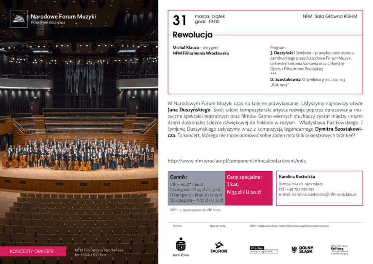 31 marca, piątek godz. 19:00 NFM, Sala Główna KGHM Rewolucja Michał Klauza – dyrygent NFM Filharmonia Wrocławska Program: J. Duszyński I Symfonia – prawykonanie utworu zamówionego przez Narodowe Forum Muzyki, Orkiestrę Sinfonia Varsovia oraz Orkiestrę Opery i Filharmonii Podlaskiej *** D. Szostakowicz XI Symfonia g-moll op. 103 „Rok 1905” W Narodowym Forum Muzyki czas na kolejne prawykonanie. Usłyszymy najnowszy utwór Jana Duszyńskiego. Swój talent kompozytorski artysta rozwija poprzez opracowania muzyczne spektakli teatralnych oraz filmów. Grono wiernych słuchaczy zyskał między innymi dzięki doskonałej ścieżce dźwiękowej do Pokłosia w reżyserii Władysława Pasikowskiego. I Symfonię Duszyńskiego usłyszymy wraz z kompozycją legendarnego Dymitra Szostakowicza. To koncert, którego nie może odmówić sobie żaden miłośnik orkiestrowych brzmień! http://www.nfm.wroclaw.pl/component/nfmcalendar/event/5165 Cennik: Ceny specjalne: VIP – 110 zł* / 60 zł I kat. I kategoria – N 45 zł / U 30 zł N 35 zł / U 20 zł II kategoria – N 40 zł / U 25 zł Karolina Kostwicka Specjalista ds. sprzedaży tel.: +48 782 780 783 e-mail: [email protected] III kategoria – N 35 zł / U 20 zł VIP* – z zaproszeniem do VIP Room Partner: KONCERTY ORKIESTR NFM Filharmonia Wrocławska fot. Łukasz Rajchert Sponsor złoty: NFM – instytucja kultury miasta Wrocławia współprowadzona przez: