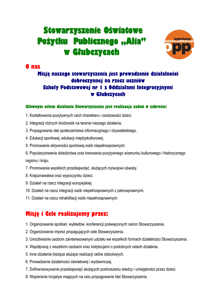 Stowarzyszenie Oświatowe Pożytku Publicznego „Alia” w Głubczycach O nas Misją naszego stowarzyszenia jest prowadzenie działalności dobroczynnej na rzecz uczniów Szkoły Podstawowej nr 1 z Oddziałami Integracyjnymi w Głubczycach Głównym celem działania Stowarzyszenia jest realizacja zadań w zakresie: 1. Kształtowania pozytywnych cech charakteru i osobowości dzieci. 2. Integracji różnych środowisk na terenie naszego działania. 3. Propagowania idei społeczeństwa informacyjnego i obywatelskiego. 4. Edukacji sportowej, edukacji międzykulturowej. 5. Promowanie aktywności sportowej osób niepełnosprawnych. 6. Popularyzowania dziedzictwa oraz kreowania pozytywnego wizerunku kulturowego i historycznego regionu i kraju. 7. Promowania wszelkich przedsięwzięć, służących rozwojowi oświaty. 8. Krajoznawstwa oraz wypoczynku dzieci. 9. Działań na rzecz integracji europejskiej. 10. Działań na rzecz integracji osób niepełnosprawnych z pełnosprawnymi. 11. Działań na rzecz rehabilitacji osób niepełnosprawnych. Misję i Cele realizujemy przez: 1. Organizowanie spotkań, wykładów, konferencji poświęconych celom Stowarzyszenia. 2. Organizowanie imprez propagujących cele Stowarzyszenia. 3. Umożliwianie osobom zainteresowanym udziału we wszelkich formach działalności Stowarzyszenia. 4. Współpracę z wszelkimi osobami oraz instytucjami o podobnych celach działania. 5. Inne działania bieżące służące realizacji celów statutowych. 6. Prowadzenie działalności oświatowej i wydawniczej. 7. Dofinansowywanie przedsięwzięć służących podnoszeniu wiedzy i umiejętności przez dzieci. 8. Wspieranie inicjatyw mających na celu propagowanie idei Stowarzyszenia. 9. Organizację warsztatów, spotkań, seminariów przybliżających ideę integracji europejskiej. 10. Współpracę z osobami i instytucjami w zakresie zbierania informacji i wymiany doświadczeń dotyczących problemów osób niepełnosprawnych. 11. Prowadzenie działalności integrującej osoby niepełnosprawne poprzez aktywność kulturalną, rekreacyjną, towarzyską i rehabilitacyjną. 12. Organizowanie, promowanie imprez i wydarzeń sportowych. 13. Inne działania służące osobom niepełnosprawnym. Obszary działań - Przezwyciężanie trudnych sytuacji życiowych, działalność wspierająca - Działalność charytatywna - Pomoc społeczna, w tym pomoc rodzinom i osobom w trudnej sytuacji życiowej oraz wyrównywanie ich szans - Działalność na rzecz osób niepełnosprawnych - Ochrona zdrowia - Ochrona i promocja zdrowia - Nauka, kultura, ekologia - Nauka, szkolnictwo wyższe, edukacja, oświata i wychowanie - Kultura, sztuka, ochrona dóbr kultury i dziedzictwa narodowego - Ekologia i ochrona zwierząt oraz ochrona dziedzictwa przyrodniczego - Działalność międzynarodowa, wspólnoty lokalne, aktywność społeczna - Działalność na rzecz integracji europejskiej oraz rozwijania kontaktów i współpracy między społeczeństwami - Tożsamość, tradycja narodowa - Podtrzymywanie i upowszechnianie tradycji narodowej, pielęgnowanie polskości, rozwój świadomości narodowej, obywatelskiej i kulturowej - Działalność na rzecz mniejszości narodowych i etnicznych oraz języka regionalnego - Sport, turystyka, wypoczynek - Wspieranie i upowszechnianie kultury fizycznej i sportu - Turystyka i krajoznawstwo - Wypoczynek dzieci i młodzieży - Inne