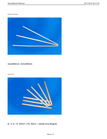 http://patyczki.fabrika.pl 2017-03-07 00:17:44 Patyczki do waty cukrowej 4x4x280mm, 5x5x350mm Patyczki do flag śr. 5, 6, 14, 20mm x 50, 60cm + każda inna długość Strona 1/2 http://patyczki.fabrika.pl 2017-03-07 00:17:44 Patyczki lekarskie i kosmetyczne Strona 2/2