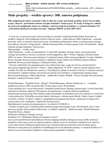 Małe projekty - wielkie sprawy: 500. umowa podpisana Autor: Adres: http://wrotalubuskie.eu/PL/426/254/Male_projekty_-_wielkie_sprawy__500__umowa_p odpisana/k/ Małe projekty - wielkie sprawy: 500. umowa podpisana 500. podpisanych umów to ponad 5 mln zł. Dla nas ważny jest każdy projekt, nawet ten na kilka tysięcy złotych - powiedział członek zarządu Stanisław Tomczyszyn. W środę, 6 lutego br. odbyło się uroczyste podpisanie umów na zadania z zakresu małych projektów w ramach działania 413 „wdrażanie lokalnych strategii rozwoju” objętego PROW na lata 2007-2013. - Cieszę się, że stowarzyszenia, które powstają na terenach wiejskich potrafią dobrze korzystać ze środków unijnych. Dziś podpisanie dwóch ważnych umów - jedna dotyczy Dębu Napoleona – pomnika przyrody, który co prawda został zniszczony, ale lokalnej społeczności zależy na promowaniu cennego przyrodniczo obszaru. Drugi projekt zakłada realizację filmu 3d dotyczącego Łużyc Wschodnich - dodał członek zarządu Stanisław Tomczyszyn. Małe projekty – wielkie chęci „Dąb Napoleona - ocalić od zapomnienia” to tytuł 500. projektu, którego celem jest promowanie cennego przyrodniczo obszaru, na którym wyrósł najgrubszy dąb w Polsce, objętego ochroną Natura 2000. Ze strony Stowarzyszenia Inicjatyw Lokalnych Gminy Zabór umowę podpisali: Czesław Słodnik Prezes Zarządu Stowarzyszenia Inicjatyw Lokalnych Gminy Zabór oraz Elżbieta Grażyna Matras – Skarbnik Stowarzyszenia Inicjatyw Lokalnych Gminy Zabór. - Naszym założeniem jest propagowanie oraz zachowanie tego, czego już nie ma, pewnej historii dotyczącej najgrubszego drzewa w Polsce - Dębu Napoleona. W 2010 r. drzewo zostało spalone przez wandali. Do dziś nie odnaleziono sprawcy. Chcielibyśmy jednak uwiecznić to drzewo w pamięci naszych mieszkańców. Zaplanowaliśmy stworzenie pocztówki oraz breloków z fragmentami autentycznego drewna pochodzącego z Dębu Napoleona – podkreślił Czesław Słodnik - Prezes Zarządu Stowarzyszenia Inicjatyw Lokalnych Gminy Zabór Witold Baumann - Wspólnik firmy „Darpol” Witold Baumann, Dariusz Polańczyk s.c. w ramach podpisanej umowy (499) zrealizuje film 3d dotyczący Łużyc Wschodnich. Celem projektu jest: wzrost aktywności i integracji społeczności lokalnej, promowanie i rozwój turystyki, rekreacji na obszarze objętym LSR poprzez przygotowanie i wydanie filmowej publikacji informacyjno-promocyjnej, która będzie rozpowszechniana za pośrednictwem sieci Internet w wersji dwu i trójwymiarowej. Wideofilm zawierać będzie informacje z obszaru gmin Brody, Gubin, Jasień, Lipinki Łużyckie, Lubsko, Trzebiel i Tuplice o gospodarstwach agroturystycznych, miejscach noclegowych i wypoczynkowych, atrakcjach i imprezach turystycznych. Beneficjentowi zostaje przyznana pomoc w wysokości 22 400,00 zł - Projekt związany jest z realizacją filmu promocyjnego dotyczącego Łużyc Wschodnich. Jest to nasz pierwszy projekt, który będzie realizowany ze środków unijnych – dodał na koniec Witold Baumann Wspólnik firmy „Darpol. Wdrażanie lokalnych strategii rozwoju Działanie 413 „Wdrażanie lokalnych strategii rozwoju” ma na celu umożliwienie mieszkańcom obszaru objętego lokalną strategią rozwoju (LSR) realizacji projektów, które przyczynić się mają do poprawy jakości życia na obszarach wiejskich m.in. poprzez wzrost aktywności lokalnych społeczności oraz stymulowanie powstawania nowych miejsc pracy. Wnioski te mogą dotyczyć projektów kwalifikujących się do udzielenia pomocy w ramach działań osi 3 Jakość życia na obszarach wiejskich i różnicowanie gospodarki wiejskiej: strona 1 / 3 Małe projekty - wielkie sprawy: 500. umowa podpisana Autor: Adres: http://wrotalubuskie.eu/PL/426/254/Male_projekty_-_wielkie_sprawy__500__umowa_p odpisana/k/ - Różnicowanie w kierunku działalności nierolniczej, - Tworzenie i rozwój mikroprzedsiębiorstw, - Odnowa i rozwój wsi, oraz innych projektów zwanych dalej "małymi projektami", które niekwalifikują się do wsparcia w ramach działań osi 3, ale przyczyniają się do osiągnięcia celów tej osi, tj. poprawy jakości życia lub większego zróżnicowania działalności gospodarczej na obszarze działania LGD. Całkowita wartość projektu wynosi od 4.500 zł (1.152,7 euro) do 100.000 zł (25.616,1 euro), zwanych dalej "małymi projektami". Zakres pomocy dla małych projektów, działania mogą dotyczyć: a) organizacji szkoleń i innych przedsięwzięć o charakterze edukacyjnym i warsztatowym dla ludności z obszaru objętego LSR; b) promocji i rozwoju lokalnej aktywności, w tym promocji lokalnej twórczości kulturalnej i artystycznej, z wykorzystaniem lokalnego dziedzictwa kulturowego, historycznego oraz przyrodniczego; c) rozwoju agroturystyki i turystyki na obszarach wiejskich, w tym: utworzenia lub zmodernizowania elektronicznej bazy informacji turystycznej oraz stron WWW, przygotowania i wydania folderów i innych publikacji informacyjnych, oznaczenia obiektów ważnych lub charakterystycznych dla obszaru objętego lokalną strategią rozwoju; d) inicjowania powstawania, rozwoju, przetwarzania, wprowadzenia na rynek oraz podnoszenia jakości produktów i usług bazujących na lokalnych zasobach, w tym naturalnych surowcach i produktach rolnych i leśnych oraz tradycyjnych sektorach gospodarki; e) organizacji imprez kulturalnych, rekreacyjnych, sportowych na obszarze objętym działalnością LGD; f) zakupu i nasadzenia tradycyjnej roślinności oraz starych odmian roślin (nasion, sadzonek, kłączy, bulw, etc.) w celu wykorzystania lub odnowienia cennego dziedzictwa przyrodniczego lub kulturowego ze szczególnym wskazaniem na obszary chronione w tym obszary objęte siecią Natura 2000, g) zakupu oprogramowania, urządzeń i sprzętu komputerowego (w tym urządzeń i sprzętu umożliwiającego dostęp do Internetu oraz zakup usługi dostępu do Internetu) i ich udostępnianie 