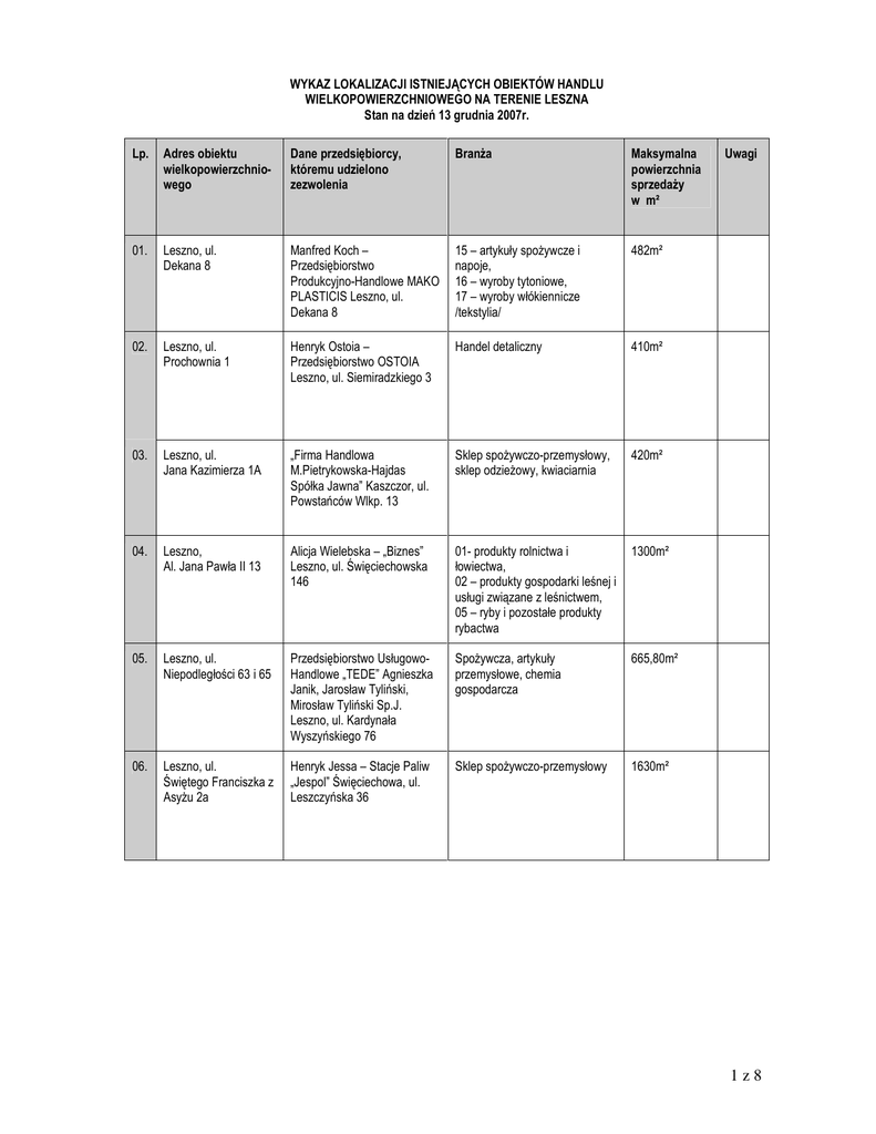 WYKAZ LOKALIZACJI ISTNIEJĄCYCH OBIEKTÓW HANDLU WIELKOPOWIERZCHNIOWEGO NA TERENIE LESZNA Stan na dzień 13 grudnia 2007r. Lp. Adres obiektu wielkopowierzchniowego Dane przedsiębiorcy, któremu udzielono zezwolenia Branża Maksymalna powierzchnia sprzedaży w m² 01. Leszno, ul. Dekana 8 Manfred Koch – Przedsiębiorstwo Produkcyjno-Handlowe MAKO PLASTICIS Leszno, ul. Dekana 8 15 – artykuły spożywcze i napoje, 16 – wyroby tytoniowe, 17 – wyroby włókiennicze /tekstylia/ 482m² 02. Leszno, ul. Prochownia 1 Henryk Ostoia – Przedsiębiorstwo OSTOIA Leszno, ul. Siemiradzkiego 3 Handel detaliczny 410m² 03. Leszno, ul. Jana Kazimierza 1A „Firma Handlowa M.Pietrykowska-Hajdas Spółka Jawna” Kaszczor, ul. Powstańców Wlkp. 13 Sklep spożywczo-przemysłowy, sklep odzieżowy, kwiaciarnia 420m² 04. Leszno, Al. Jana Pawła II 13 Alicja Wielebska – „Biznes” Leszno, ul. Święciechowska 146 01- produkty rolnictwa i łowiectwa, 02 – produkty gospodarki leśnej i usługi związane z leśnictwem, 05 – ryby i pozostałe produkty rybactwa 1300m² 05. Leszno, ul. Niepodległości 63 i 65 Przedsiębiorstwo UsługowoHandlowe „TEDE” Agnieszka Janik, Jarosław Tyliński, Mirosław Tyliński Sp.J. Leszno, ul. Kardynała Wyszyńskiego 76 Spożywcza, artykuły przemysłowe, chemia gospodarcza 665,80m² 06. Leszno, ul. Świętego Franciszka z Asyżu 2a Henryk Jessa – Stacje Paliw „Jespol” Święciechowa, ul. Leszczyńska 36 Sklep spożywczo-przemysłowy 1630m² Uwagi 1z8 07. Leszno, ul. Kochanowskiego 23 „MARUX” Józef Ruks, Danuta Ruks, Michał Maleszka, Alicja Maleszka Sp.J. Leszno, ul. Kochanowskiego 23 47 – handel detaliczny z wyłączeniem handlu detalicznego pojazdami samochodowymi, 32 – pozostałe wyroby, 28 – maszyny i urządzenia, gdzie indziej niesklasyfikowane 633,80m² 08. Leszno, ul. Gronowska 11 „PEAMCO” Materiały Budowlane Jędrzej i Beata Tomczak Sp.J. Leszno, ul. Obrońców Lwowa 19 01 – produkty rolnictwa i łowiectwa, 02 – produkty gospodarki leśnej i usługi związane z leśnictwem, 05 – ryby i pozostałe produkty rybactwa 655,70m² 09. Leszno, ul. 17 Stycznia 72 Teresa Wojtko – Przedsiębiorstwo HandlowoUsługowe „POLTER” Wilkowice, ul. Szkolna 11 01 – produkty rolnictwa i łowiectwa, 02 – produkty gospodarki leśnej i usługi związane z leśnictwem, 05 – ryby i pozostałe produkty rybactwa 963,60m² 10. Leszno, ul. Lipowa 41 NETTO Sp. z o.o. Motaniec 30 Spożywczo-przemysłowa 518,60m² 11. Leszno, ul. Zamenhofa 87H NETTO Sp. z o.o. Motaniec 30 Spożywczo-przemysłowa 569,47m² 12. Leszno, ul. Spółdzielcza 2A „Składy Budowlane VOX” Sp. z o.o. Janikowo, ul. Gnieźnieńska 28 Materiały budowlane, drewno, materiały wykończeniowe dla budownictwa 460m² 13. Leszno, ul. Narutowicza 84 Jerzy Rymwid Przedsiębiorstwo JEM Leszno, ul. Narutowicza 84 01 – produkty rolnictwa i łowiectwa, 02 – produkty gospodarki leśnej i usługi związane z leśnictwem, 05 – ryby i pozostałe produkty rybactwa 4763m² 14. Leszno, ul. Jana Pawła II 16 Centrum Handlowe „MANHATTAN” Sp. z o.o. Leszno, ul. Jana Pawła II 16 01 – produkty rolnictwa i łowiectwa, 02 – produkty gospodarki leśnej i usługi związane z leśnictwem, 05 – ryby i pozostałe produkty rybactwa 7394m² 2z8 15. Leszno, ul. Luksemburska GRZEŚKOWIAK Sp. z o.o. Strzyżewice, ul. Balonowa 57 20 – drewno i wyroby z drewna oraz korka, z wyłączeniem mebli; artykuły ze słomy i materiałów używanych do wyplatania, 26 – wyroby z pozostałych surowców niemetalicznych, 34 – pojazdy samochodowe, przyczepy i naczepy 1700m² 16. Leszno, ul. Okrężna 3 „FORTIS LEASE POLSKA” Sp. z o.o. Warszawa, ul. Suwak 3 Spożywczo-przemysłowa 1900m² 17. Leszno, ul. Usługowa 1 Przedsiębiorstwo Wielobranżowe „ROMOS” Marek Tarnowski, Jacek Turzański, Janusz Wdowczyk, Edward Zaremba Sp.J. Gostyń, ul. Wrocławska 147 Budowlana, wyposażenia mieszkań 600m² 18. Leszno, ul. 17 Stycznia 50 PPHU AGROFARM Sp. z o.o. Leszno, ul. 17 Stycznia 50 Branża spożywczo-przemysłowa 627m² 19. Leszno, ul. Fabryczna 15 „PEAMCO” Materiały Budowlane Jędrzej i Beata Tomczak Sp.J. Leszno, ul. Obrońców Lwowa 19 17 – wyroby włókiennicze /tekstylia/, 19 – skóry wyprawione i wyroby ze skór wyprawionych, 21 – masa włóknista, papier i wyroby z papieru 1842m² 20. Leszno, ul. Fabryczna 15 „PEAMCO” Materiały Budowlane Jędrzej i Beata Tomczak Sp.J. Leszno, ul. Obrońców Lwowa 19 19 – skóry wyprawione i wyroby ze skór wyprawionych, 26 – wyroby z pozostałych surowców niemetalicznych, 28 – metale i podstawowe wyroby z metali 1496m² 3z8 21. Leszno, ul. Fabryczna 15 „PEAMCO” Materiały Budowlane Jędrzej i Beata Tomczak Sp.J. Leszno, ul. Obrońców Lwowa 19 26 – wyroby z pozostałych surowców niemetalicznych, 28 – metale i podstawowe wyroby z metali, 36 – meble, wyroby pozostałe, gdzie indziej niesklasyfikowane 480m² 22. Leszno, Ul. 17 Stycznia 7 SKLEPY KOMFORT SPÓŁKA AKCYJNA Szczecin, ul. Piotra Skargi 23 Wykładziny dywanowe, wykładziny PCV, panele 854m² 23. Leszno, ul. Aleje Konstytucji 3 Maja 12 Waldemar Ciesiółka – Przedsiębiorstwo HandlowoUsługowe „SUPER-POL” Leszno, ul. Aleje Konstytucji 3 Maja 12 50 – sprzedaż pojazdów mechanicznych, części i akcesoriów, 52 – sprzedaż z przewagą żywności, napojów i wyrobów tytoniowych, sprzedaż artykułów spożywczych 3623m² 24. Leszno, ul. Dekana 10 „ING LEASE /POLSKA/ Sp. z o.o. Warszawa, ul. Plac Trzech Krzyży 10/14 Hurtownia budowlana 2118m² 25. Leszno, ul. Aleje Konstytucji 3 Maja 9 KAUFLAND POLSKA MARKETY Sp. z o.o. Sp.K. Wrocław, ul. Szybka 6-10 Spożywczo-przemysłowa 1998,50m² 26. Leszno, ul. 1 Maja 11 Przedsiębiorstwo HandlowoUsługowe „MATUZ” Sp. z o.o. Kościan, ul. Gen. Chłapowskiego 9 Elektrotechniczna, sanitarnohydrauliczna, klimatyzacyjna 759m² 27. Leszno, ul. Aleje Jana Pawła II nr 2 Pani Ewa Mądra - Honda Dealer zam. Rydzyna, ul. Ko