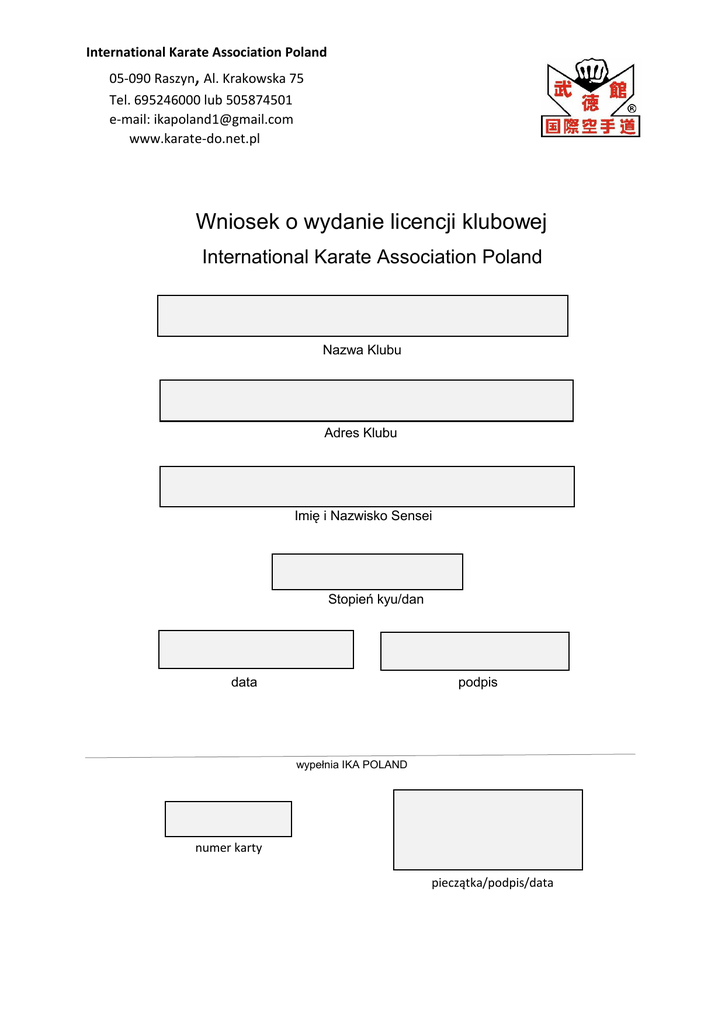 International Karate Association Poland 05-090 Raszyn, Al. Krakowska 75 Tel. 695246000 lub 505874501 e-mail: [email protected] www.karate-do.net.pl Wniosek o wydanie licencji klubowej International Karate Association Poland Nazwa Klubu Adres Klubu Imię i Nazwisko Sensei Stopień kyu/dan data podpis wypełnia IKA POLAND numer karty pieczątka/podpis/data