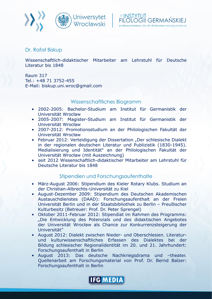 Dr. Rafał Biskup Wissenschaftlich-didaktischer Literatur bis 1848 Mitarbeiter am Lehrstuhl für Deutsche Raum 317 Tel.: +48 71 3752-455 E-Mail: [email protected] Wissenschaftliches Biogramm • 2002-2005: Bachelor-Studium am Institut für Germanistik der Universität Wrocław • 2005-2007: Magister-Studium am Institut für Germanistik der Universität Wrocław • 2007-2012: Promotionsstudium an der Philologischen Fakultät der Universität Wrocław • Februar 2012: Verteidigung der Dissertation „Der schlesische Dialekt in der regionalen deutschen Literatur und Publizistik (1830-1945). Medialisierung und Identität“ an der Philologischen Fakultät der Universität Wrocław (mit Auszeichnung) • seit 2012 Wissenschaftlich-didaktischer Mitarbeiter am Lehrstuhl für Deutsche Literatur bis 1848 Stipendien und Forschungsaufenthalte • März-August 2006: Stipendium des Kieler Rotary Klubs. Studium an der Christian-Albrechts-Universität zu Kiel • August-Dezember 2009: Stipendium des Deutschen Akademischen Austauschdienstes (DAAD): Forschungsaufenthalt an der Freien Universität Berlin und in der Staatsbibliothek zu Berlin – Preußischer Kulturbesitz (Betreuer: Prof. Dr. Peter Sprengel) • Oktober 2011-Februar 2012: Stipendiat im Rahmen des Programms: „Die Entwicklung des Potenzials und des didaktischen Angebotes der Universität Wrocław als Chance zur Konkurrenzsteigerung der Universität” • August 2012: Dialekt zwischen Nieder- und Oberschlesien. Literaturund kulturwissenschaftliches Erfassen des Dialektes bei der Bildung schlesischer Regionalidentität im 20. und 21. Jahrhundert: Forschungsaufenthalt in Berlin • August 2013: Das deutsche Nachkriegsdrama und –theater. Quellenarbeit am Forschungsmaterial von Prof. Dr. Bernd Balzer: Forschungsaufenthalt in Berlin Popularisierende Tätigkeit • Oktober 2004 - Juni 2007: Leiter des Studentischen Arbeitskreises der Germanisten an der Universität Wrocław: zahlreiche Projekte, Studienfahrten, Büchervorstellungen • Oktober 2004 - Dezember 2005: Redaktionsmitglied der Zeitschrift der Germanistik-Studenten „Elixiere” • April 2007: Mitveranstalter der VI. Internationalen Studententagung „Interfaces” in Wrocław und Karpacz • Februar 2010 - Juni 2011: Redaktionsleiter der Zeitschrift der Germanistik-Studenten „Elixiere” • seit Oktober 2011 Betreuer der Zeitschrift „Elixiere” • Mai 2013: Veranstalter der internationalen Tagung „Grenzräume. Literatur, Kultur und Sprache zwischen Regionalismus und Universalismus“ (Kluczbork 09.-11.05.2013) • seit Oktober 2013 Mitglied der Arbeitsgruppe für Kontakte mit Schulen am Institut für Germanistik der Universität Wrocław Lährtätigkeit am Institut für Germanistik der Universität Wrocław seit 2007: • Übungen und Seminare (Konversationsübungen, Schreibübungen, Sprechübungen, Deutsche Literaturgeschichte bis 1848) Konferenzteilnahme 2005 • V. Internationale Studententagung „Interfaces“: „Sprache, Literatur, Kultur und Fremde – polnische, tschechische und deutsche Aspekte”, Leipzig, 17-24.10.2005, Thema: Die polnischen Motive bei Friedrich Nietzsche 2007 • VI. Internationale Studententagung „Interfaces”: „Bliskość i oddalenie”, Wrocław-Karpacz, 23-30.04.2007, Thema: Motyw dali w życiu i dziełach Hansa Lipinsky’ego-Gottersdorfa 2008 • „Hermann Stehr (1864-1940): Leben und Werk zwischen europäischem Universalismus und provinziellem Nationalismus”, Bystrzyca Kłodzka, 25-28.09.2008, Thema: Mundartdichtung im Frühwerk von Hermann Stehr 2009 • VII. Internationale Studententagung „Interfaces”: „Kulturni translace - Kulturelle Translationen - Translacje kulturowe”, Praga, 02.09.06.2009, Thema: Dialekt śląski w XIX i XX wieku. Jego medializacja oraz oddziaływanie w regionalnej literaturze oraz publicystyce 2010 • „Karl von Holtei (1798-1880): Epoche - Werk - Wirkung.“, WrocławOborniki Śląskie, 24.-26.03.2010, Thema: Karl von Holtei und sein Einfluss auf die schlesische Mundartdichtung • Ślężańskie Światy, 08.-10.10.2010, Thema: Ślęża w poezji Roberta Rösslera 2011 • „Max Herrmann-Neisse (1886-1941). Auch in Neisse im Exil.”, Wrocław-Nysa, 06-10.04.2011, Thema: Schlesische Mundart im Werk von Max Herrmann-Neisse. 2012 • „Carl i Gerhart Hauptmann. Dzieło i modele jego odbioru”, Szczawno Zdrój, 26-27.04.2012, Thema: O Śląsku pisanym dialektem słów kilka. Gerhart Hauptmann i Philo vom Walde (Johannes Reinelt) • V. Internationale Germanistische Werkstatt, Opole, 08.-09.05.2012, Thema: Ost-Oberschlesien als Erinnerungsort bei Hans LipinskyGottersdorf • „Die Hauptfaktoren und Grundzäsuren des deutsch-polnischen Kulturtransfers im 19. und 20. Jahrhundert“, Wrocław, 18-20.10.2012, Thema: Über die schlesische Identität. Zum aktuellen Kulturtransfer in einer multikulturellen Region 2013 • „Grenzräume. Literatur, Kultur und Sprache zwischen Regionalismus und Universalismus”, Kluczbork, 09.-11.05.2013, Thema: Victor Kaluza-Leben und Werk. • XVIII Seminarium Śląskie: „Dziedzictwo kulturowe Śląska – miejsca, architektura, ludzie, zwyczaje, tradycje”, Kamień Śląski, 2528.09.2013, Thema: Niemiecki dialekt śląski w literaturze i publicystyce 1830-1945. Tożsamość regionalna oraz dialekt jako miejsce pamięci. • Ludowość w literaturze śląskiej, Knurów, 17.10.2013, Thema: Ludowość w niemieckiej poezji dialektalnej na Śląsku w latach 18301945. Pomiędzy prowincjonalizmem a tożsamością regionalną • Wałbrzych i literatura. Historia kultury literackiej i współczesność, Wałbrzych, 12-13.11.2013, Thema: Liryka Oswalda Rückera czyli wałbrzyska odmiana literatury świata pracy 2014 • In Vorbereitung Publikationen a) Sammelbände • Jarmila Valkova, Anja Bethke, Rafał Biskup (Hg.): Kulturní translace / Kulturelle Translationen / Translacje kulturowe, Praga 2010. • Rafał Biskup (Hg.): Gustav Freytag. Leben – Werk – Grenze,