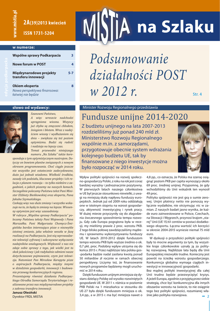 www.mistia.pl 2A (39)2013 kwiecień ISSN 1731-5204 edycja podkarpacka w numerze: Wspólne sprawy Podkarpacia 3 Nowe forum w POST 4 Międzynarodowe projekty transferu innowacji Okiem eksperta Nowa perspektywa finansowa: łatwiej nie będzie 5-7 8 słowo od wydawcy: Szanowni Państwo, A więc wreszcie nadchodzi upragniona wiosna. Wszyscy już chyba są zmęczeni chłodem, śniegiem i błotem. Wraz z nadejściem wiosny i wydłużaniem się dnia – zwiększa się też poziom optymizmu. Budzi się radość i nadzieja na lepszy czas. Temat przewodni niniejszego numeru „Na Szlaku” także koresponduje z tym optymistycznym nastrojem. Dotyczy on bowiem planów związanych z nowym okresem programowania. Choć ciągle jeszcze nie wszystko jest ostatecznie zadecydowane, dużo już jednak wiadomo. Wielkość środków, zasady ich podziału, kluczowe projekty i ich relacja z planem rozwoju – to tylko niektóre z zagadnień, o jakich piszemy na naszych łamach. Szczególnie polecamy Państwu tekst Pani Minister Elżbiety Bieńkowskiej oraz eksperta, Pana Jakuba Szymańskiego. Czekają więc nas duże zmiany i wszystko wskazuje na to, że będą to zmiany na lepsze. Wiosenny optymizm jest więc uzasadniony. W rubryce „Wspólne sprawy Podkarpacia” polecamy Państwu teksty Pani Wojewody i Pana Marszałka. Pani Małgorzata Chomycz-Śmigielska bardzo interesująco pisze o niezwykle istotnej zmianie, jaka właśnie weszła w fazę realizacji na Podkarpaciu. Jest nią wprowadzenie telewizji cyfrowej i sukcesywne wyłączanie nadajników analogowych. Większość z nas nie zdaje sobie sprawy z tego, jak wielki jest to skok jakościowy i jak radykalnie odmieni nasze dotychczasowe pojmowanie, czym jest telewizja. Natomiast Pan Mirosław Karapyta pisze o aspiracjach Podkarpacia, między innymi w dziedzinie gospodarki, innowacji i budowania przewag konkurencyjnych regionu. Prezentujemy również działania Podkarpackiego Ośrodka Samorządu Terytorialnego i realizowane przez nas międzynarodowe projekty z zakresu transferu innowacji. Janusz Olesiński Dyrektor FRDL MISTiA Podsumowanie działalności POST w 2012 r. Str. 4 Minister Rozwoju Regionalnego przedstawia Fundusze unijne 2014-2020 Z budżetu unijnego na lata 2007-2013 rozdzieliliśmy już ponad 240 mld zł. Ministerstwo Rozwoju Regionalnego wspólnie m.in. z samorządami, przygotowuje obecnie system wdrażania kolejnego budżetu UE, tak by finansowane z niego inwestycje można było rozpocząć w 2014 roku. Wpływ polityki spójności na rozwój społeczno-gospodarczy Polski, z roku na rok jest coraz bardziej wyraźny i jednoznacznie pozytywny. W pierwszych latach naszego członkostwa w UE był jeszcze stosunkowo niewielki, z uwagi na mniejszą skalę napływu funduszy europejskich. Jednak już od 2009 roku oddziałują one w istotnym stopniu na wzrost gospodarczy, aktywność inwestycyjną i rynek pracy. W dużej mierze przyczyniły się do złagodzenia ówczesnego spowolnienia tempa rozwoju. Gdy cała Europa pogrążona była w recesji, my mieliśmy prawie 2 proc. wzrostu PKB. Z tego blisko połowę zawdzięczaliśmy mądremu i sprawnemu wykorzystywaniu funduszy UE. W latach 2010-2012 dzięki funduszom tempo wzrostu PKB było wyższe średnio o ok. 0,7 pkt. proc. Podobny wpływ utrzyma się do końca 2015 r. Przez najbliższe lata polska gos-podarka będzie nadal zasilana kwotą ponad 50 miliardów zł rocznie w ramach obecnej perspektywy. Liczymy też, że finansowanie nowych programów będziemy mogli uruchomić w 2014 roku. Dzięki funduszom unijnym zmniejsza się dystans dzielący Polskę od wysoko rozwiniętych gospodarek UE. W 2011 r. różnica w poziomie PKB Polski na 1 mieszkańca w stosunku do UE-27 była dzięki funduszom mniejsza o ok. 3,4 pp., a w 2015 r. ma być mniejsza nawet o 4,8 pp., co oznacza, że Polska ma szansę osiągnąć poziom PKB per capita wynoszący około 69 proc. średniej unijnej. Przypomnę, że gdy wchodziliśmy do Unii wskaźnik ten wynosił 49 proc. Polityka spójności nie jest grą o sumie zerowej. Unijni płatnicy netto nie ponoszą wyłącznie wydatków, nie otrzymując nic w zamian. Z naszych badań jasno wynika, że każde euro zainwestowane w Polsce, Czechach, na Słowacji i Węgrzech, przynosi krajom „starej” Unii (UE 15) 61 centów w postaci dodatkowego eksportu. Łączna wartość ich korzyści w okresie 2004-2015 wyniesie niemal 75 mld euro. W dyskusji o przyszłości polityki spójności były to mocne argumenty za tym, by wszystkie kraje członkowskie uznały ją za politykę rozwojową. Najbliższe lata będą dla Unii Europejskiej niezwykle trudne. Konieczny jest powrót na ścieżkę wzrostu gospodarczego. Konkurencja globalna wymaga ciągłych inwestycji w innowacyjność gospodarki. Bez mądrej polityki inwestycyjnej dla całej Unii trudno będzie przezwyciężyć kryzys. A jeżeli Europa, zgodnie z przyjętą przez siebie strategią, chce być konkurencyjna dla innych obszarów wzrostu na świecie, to nie osiągnie tego bez polityki spójności, rozumianej właśnie jako polityka rozwojowa. 2 Na lutowym spotkaniu Rady Europejskiej dotyczącym budżetu, przywódcy państw UE porozumieli się co do wielkości Wieloletnich Ram Finansowych 2014-2020. Dla Polski jest to pozytywne rozstrzygnięcie. Widzimy też, że nasze argumenty prezentujące politykę spójności jako jedno z podstawowych narzędzi UE do walki z kryzysem gospodarczym, ale i długofalowego budowania integracji i konkurencyjności europejskiej, są coraz szerzej rozumiane. Zostało to m.in. odzwierciedlone w kilku ważnych zasadach finansowych dla przyszłego budżetu, przede wszystkim odpowiedniej wielkości poziomów dofinansowania oraz kwalifikowalności VAT. Aktualnie w Ministerstwie Rozwoju Regionalnego pracujemy nad przygotowaniem polskich dokumentów, które określą w co, przez kogo i jak fundusze europejskie będą inwestowane. Mamy za sobą ogromny, ponad 8-letni bagaż doświadczeń, który powinien pomóc w podj