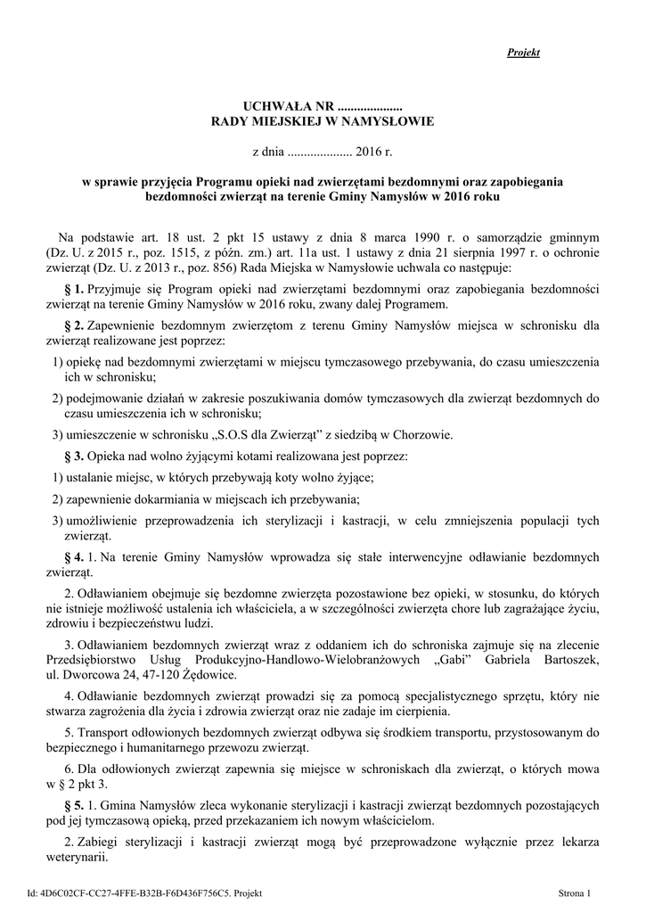 Projekt UCHWAŁA NR .................... RADY MIEJSKIEJ W NAMYSŁOWIE z dnia .................... 2016 r. w sprawie przyjęcia Programu opieki nad zwierzętami bezdomnymi oraz zapobiegania bezdomności zwierząt na terenie Gminy Namysłów w 2016 roku Na podstawie art. 18 ust. 2 pkt 15 ustawy z dnia 8 marca 1990 r. o samorządzie gminnym (Dz. U. z 2015 r., poz. 1515, z późn. zm.) art. 11a ust. 1 ustawy z dnia 21 sierpnia 1997 r. o ochronie zwierząt (Dz. U. z 2013 r., poz. 856) Rada Miejska w Namysłowie uchwala co następuje: § 1. Przyjmuje się Program opieki nad zwierzętami bezdomnymi oraz zapobiegania bezdomności zwierząt na terenie Gminy Namysłów w 2016 roku, zwany dalej Programem. § 2. Zapewnienie bezdomnym zwierzętom z terenu Gminy Namysłów miejsca w schronisku dla zwierząt realizowane jest poprzez: 1) opiekę nad bezdomnymi zwierzętami w miejscu tymczasowego przebywania, do czasu umieszczenia ich w schronisku; 2) podejmowanie działań w zakresie poszukiwania domów tymczasowych dla zwierząt bezdomnych do czasu umieszczenia ich w schronisku; 3) umieszczenie w schronisku „S.O.S dla Zwierząt” z siedzibą w Chorzowie. § 3. Opieka nad wolno żyjącymi kotami realizowana jest poprzez: 1) ustalanie miejsc, w których przebywają koty wolno żyjące; 2) zapewnienie dokarmiania w miejscach ich przebywania; 3) umożliwienie przeprowadzenia ich sterylizacji i kastracji, w celu zmniejszenia populacji tych zwierząt. § 4. 1. Na terenie Gminy Namysłów wprowadza się stałe interwencyjne odławianie bezdomnych zwierząt. 2. Odławianiem obejmuje się bezdomne zwierzęta pozostawione bez opieki, w stosunku, do których nie istnieje możliwość ustalenia ich właściciela, a w szczególności zwierzęta chore lub zagrażające życiu, zdrowiu i bezpieczeństwu ludzi. 3. Odławianiem bezdomnych zwierząt wraz z oddaniem ich do schroniska zajmuje się na zlecenie Przedsiębiorstwo Usług Produkcyjno-Handlowo-Wielobranżowych „Gabi” Gabriela Bartoszek, ul. Dworcowa 24, 47-120 Żędowice. 4. Odławianie bezdomnych zwierząt prowadzi się za pomocą specjalistycznego sprzętu, który nie stwarza zagrożenia dla życia i zdrowia zwierząt oraz nie zadaje im cierpienia. 5. Transport odłowionych bezdomnych zwierząt odbywa się środkiem transportu, przystosowanym do bezpiecznego i humanitarnego przewozu zwierząt. 6. Dla odłowionych zwierząt zapewnia się miejsce w schroniskach dla zwierząt, o których mowa w § 2 pkt 3. § 5. 1. Gmina Namysłów zleca wykonanie sterylizacji i kastracji zwierząt bezdomnych pozostających pod jej tymczasową opieką, przed przekazaniem ich nowym właścicielom. 2. Zabiegi sterylizacji i kastracji zwierząt mogą być przeprowadzone wyłącznie przez lekarza weterynarii. Id: 4D6C02CF-CC27-4FFE-B32B-F6D436F756C5. Projekt Strona 1 3. Zabiegom, o których mowa w ust. 2, nie podlegają zwierzęta w okresie 14 dni od umieszczenia w schronisku z uwagi na możliwość zgłoszenia właściciela. § 6. Poszukiwanie właścicieli dla bezdomnych zwierząt realizowane jest poprzez: 1) informowanie o możliwości adopcji zwierząt przebywających w miejscu tymczasowego przebywania, m. in. poprzez umieszczanie ogłoszeń na tablicach ogłoszeń Urzędu Miejskiego w Namysłowie i na stronie internetowej; 2) współdziałanie z organizacjami społecznymi i podmiotami działającymi na terenie Gminy Namysłów w zakresie odławiania bezdomnych zwierząt w celu znalezienia nowych właścicieli zwierząt. § 7. 1. Usypianie ślepych miotów odbywa się na koszt Gminy Namysłów, wyłącznie przez lekarza weterynarii w schronisku dla bezdomnych zwierząt lub lecznicy weterynaryjnej. 2. Zwierzę usypiane musi być traktowane łagodnie i przyjaźnie, bez zadawania bólu. Zabieg powinien być wykonany w sposób humanitarny, poprzez podanie środka usypiającego. § 8. W celu zapewnienia miejsca dla zwierząt gospodarskich wskazuje się gospodarstwo rolne w m. Barzyna 18, 46-100 Namysłów. § 9. 1. W celu zapewnienia całodobowej opieki weterynaryjnej w przypadkach zdarzeń drogowych z udziałem zwierząt na terenie Gminy Namysłów wskazuje się następujące lecznice weterynaryjne: 1) Lecznicę Weterynaryjną „ARKA”, z siedzibą przy ul. 1 Maja 9 w Namysłowie; 2) Przychodnię Weterynaryjną Kruszyńscy, z siedzibą przy ul. Mikołaja Reja 17 w Namysłowie; 3) Gabinet Weterynaryjny „VET SERVICE” z siedzibą przy ul. Stawowa 7 w Namysłowie; 4) Gabinet Weterynaryjny „KOCHANE ZWIERZAKI” z siedzibą przy ul. Makowa 9 w Namysłowie. § 10. 1. Środki finansowe na realizację zadań wynikających z Programu zabezpiecza się w budżecie Gminy Namysłów w kwocie 35.000,00 zł w rozbiciu na: 1) sterylizacja i kastracja - 8 000,00 zł; 2) zadania obejmujące opiekę nad zwierzętami bezdomnymi i wolno żyjącymi - 22 000,00 zł; 3) zakupy i dokarmianie - 5 000,00 zł. 2. Środki finansowe, przeznaczone na realizację Programu, wydatkowane będą w sposób celowy i oszczędny, z zachowaniem zasad uzyskiwania najlepszych efektów oraz optymalnego doboru metod i środków służących osiągnięciu założonych celów. § 11. Wykonanie uchwały powierza się Burmistrzowi Namysłowa. § 12. Uchwała wchodzi w życie Województwa Opolskiego. po upływie 14 dni od ogłoszenia w Dzienniku Urzędowym Przewodniczący Rady Sylwester Zabielny Id: 4D6C02CF-CC27-4FFE-B32B-F6D436F756C5. Projekt Strona 2 Uzasadnienie W związku z nowelizacją ustawy o ochronie zwierząt z dnia 21 sierpnia 1997 r. (Dz. U. z 2013 r., poz. 856) zmieniony został art. 11a, który zobowiązuje Radę Gminy do określenia w drodze uchwały, corocznie do 31 marca, programu opieki nad zwierzętami bezdomnymi oraz zapobiegania bezdomności zwierząt. Stanowi to wypełnienie obowiązku zapewnienia opieki bezdomnym zwierzętom przez gminę, wynikającego z art. 11a ust. 1 w/w ustawy. Program został przesłany do zaopiniowania do Powiatowego Lekarza Weterynarii w Namysłowie, Stowarzyszenia Pomocy